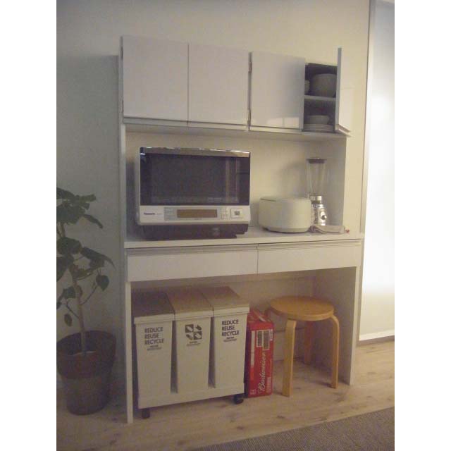 床置き可能な「魔法の空間」は買い置きもダストボックスも、すっきり収納! 中天板には大型レンジも設置可能です。 ※写真はボード幅120cmです。 ※写真はお届けの商品です。