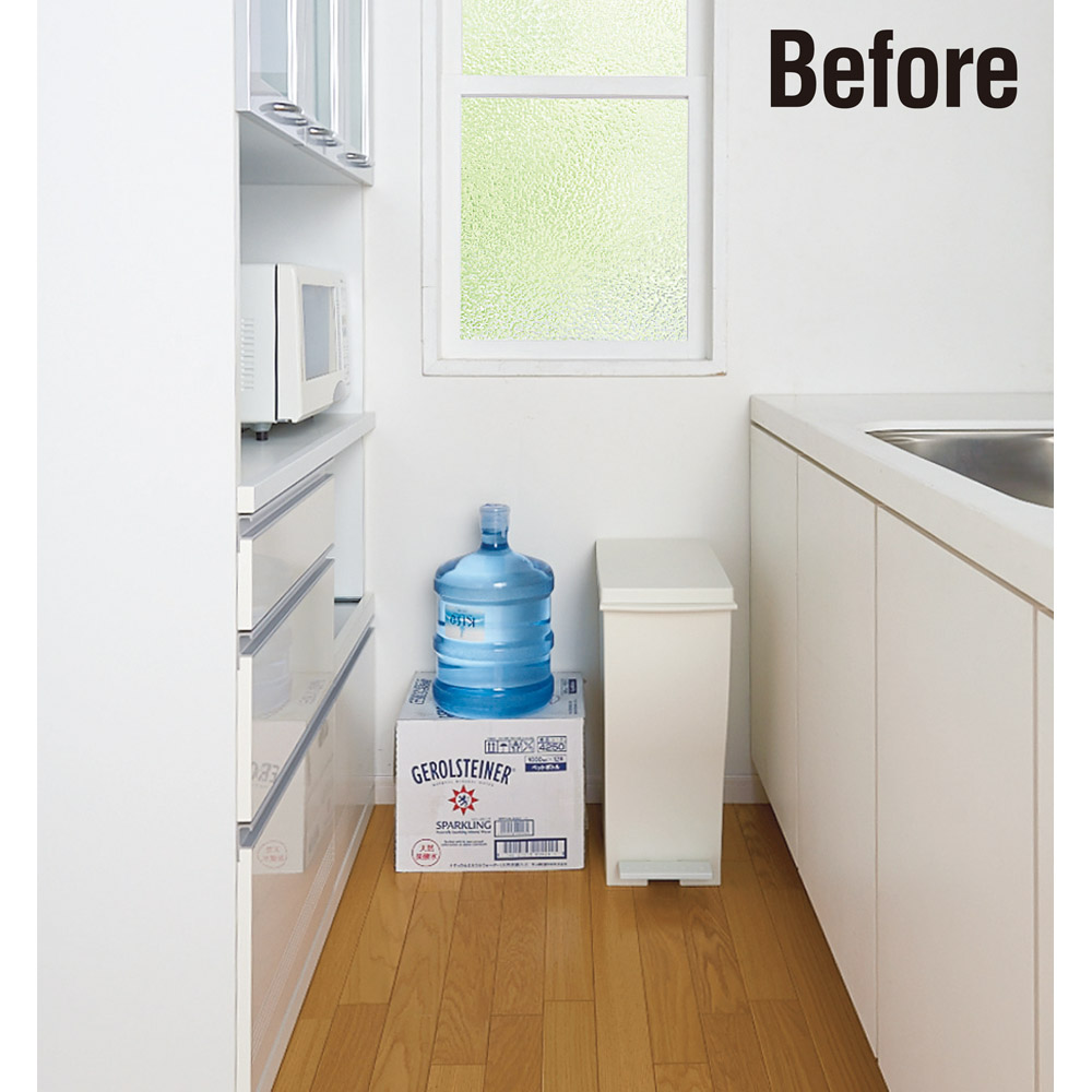 Before 引き出しには入りきらないダストボックスやビールケースなどがキッチン通路の邪魔に!!