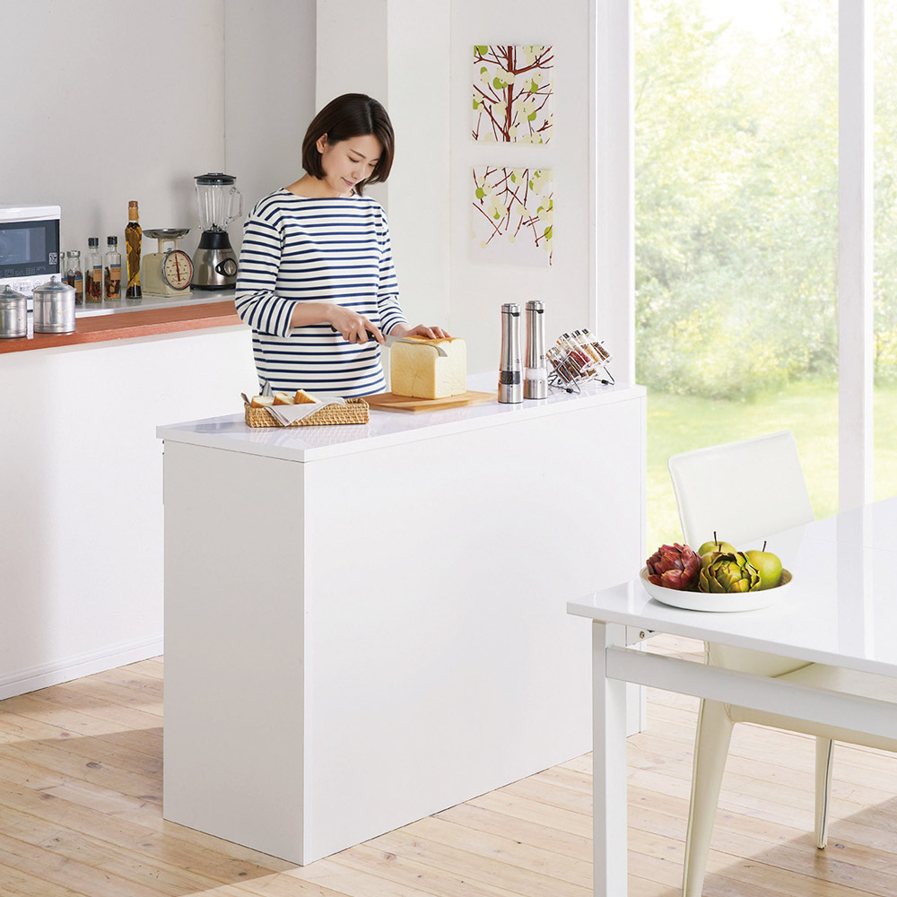 キッチンとダイニングの間に置いて間仕切りができるキッチンカウンターデスク。光沢仕上げでキズや汚れのお手入れがしやすい天板で、清潔感あふれる机としてご使用いただけます。キッチンの調理台としてはもちろん、カウンター下のスペースにゴミ箱を収納しても。〜キッチンの目隠しになるキッチンカウンターボード〜◆清潔感を大事にしたいキッチンにフィットする光沢ホワイトの間仕切り家具。◆リビングとの間仕切りとしても圧迫感のない光沢感仕上げです。◆調理台としてもパソコンを使うこともできるアイデア満載のキッチンカウンターデスクです。◆憧れのアイランドカウンターのある生活を貴方にお勧めします。〜カウンター下に色々仕舞える木製カウンター収納です〜◆置き場所に困るゴミ箱もカウンター下に収納可能です。◆調理する時に座りたい時ってありますよね。折り畳みチェアや、スツールの置き場所に。◆水の買い置きや、ビールのストックは意外に頻繁に使うもの。カウンター下を収納に利用できます。〜使い用途は多種多様のカウンターキッチン〜◆料理の時にちょっとスペースが足りない!調理の作業台に。◆キッチンでパソコン使って調べもの。レシピ調べにも重宝します。◆子供の勉強もキッチンで行うリビング学習も多くなってきました。ちょっとした勉強机やテレワーク用のパソコンデスクとしてもおすすめ。〜新築やリフォーム、模様替えの時にもおすすめの逸品〜◆お引越しや模様替えのタイミングでスペースを便利に有効活用してみませんか?◆高価な備え付け家具やリフォームよりも、リーズナブルに新生活を始められます。◆スペースを利用して効率の良い収納術を実践できます。◆是非普段使うものこそ、大好きなものをじっくりとご検討下さい。〜選べる2色展開〜◆天板と引き出しが光沢のホワイトと、木目調のブラウンの2色をご用意しました。◆キッチンはもちろん、リビングや子供部屋、書斎にも馴染みます。
