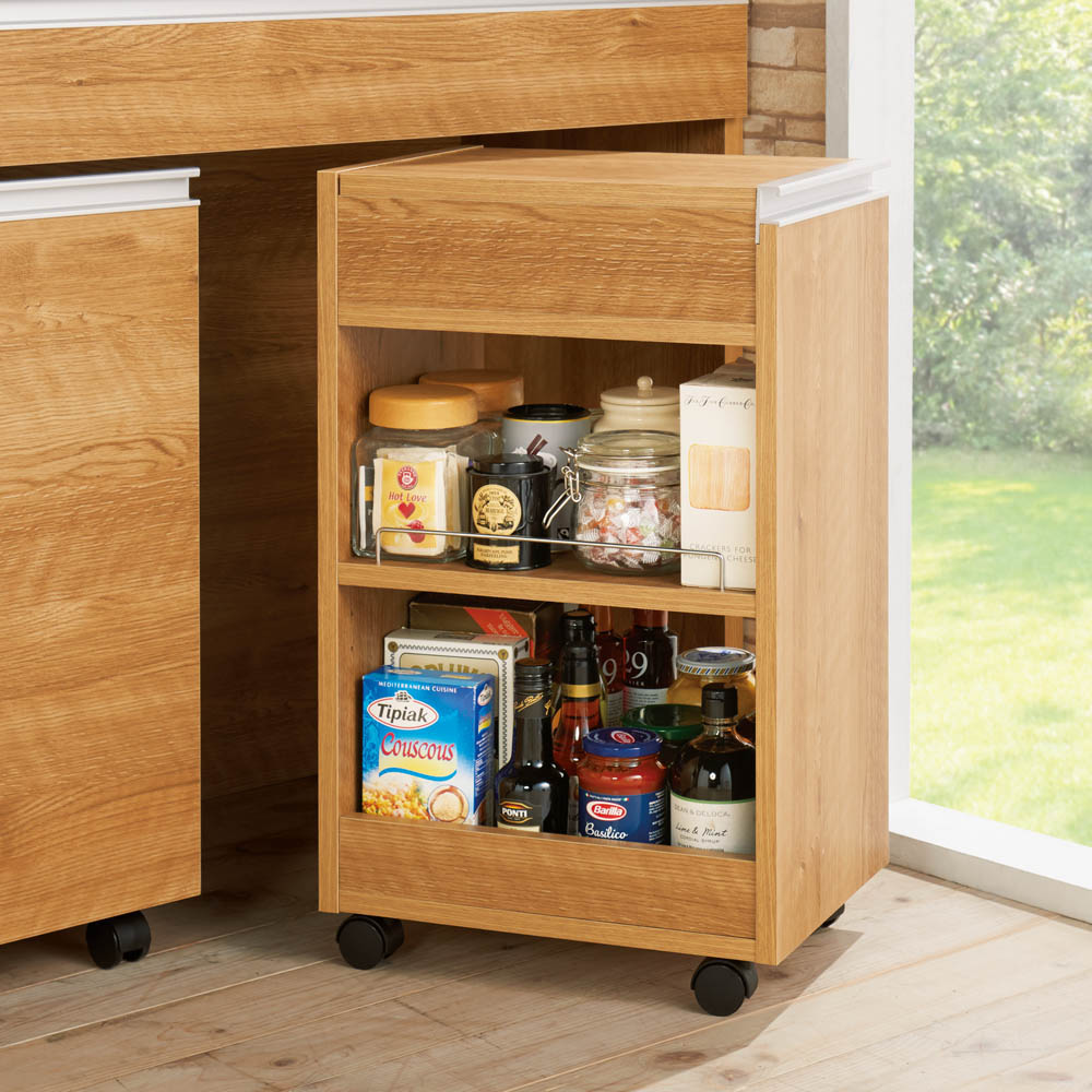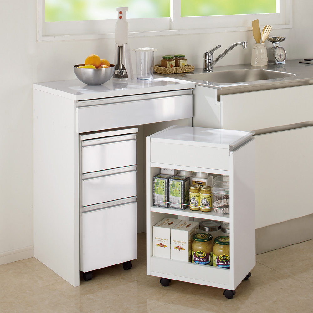 キッチンを有効活用する間仕切りができるキッチンカウンターの下に収納できるキャスター付きワゴンです。清潔感あふれるカウンター下のオープンスペースを有効活用できます。食品のストックスペースにもぴったり。狭いキッチンで活躍するキャスター付き小型ワゴン◆キャスター付きなので、必要な時に引き出して天板上をちょい置きスペースとして有効に使えます。天板の耐荷重量は約10kgです。◆ホワイトの天板と前面の素材は、お手入れが簡単な素材を採用。サッとひとふきでパッとキレイに。◆キャスター付きでラクラク移動できるので掃除も楽にできます。コンパクトでも収納力は◎◆天板下の収納…天板を外すと外から目隠しできる収納があります。収納部の有効内寸は幅25.5奥行36高さ8.5cm。カウンターデスクで使用するキッチン小物を収納するのに便利です。◆オープン部の有効内寸は25.5奥行36高さ46.5cm。可動棚1枚付きで、収納物に合わせて3cm間隔・5段階で調整できます。可動棚は幅29(こぼれ止め金具間の有効内寸は27cm)奥行36厚さ1.5cm、耐荷重量は約10kgです。よく使う調味料の収納におすすめです。◆こぼれ止め金具付きなので、キャスター移動時も安心。信頼と安心の国内生産◆国内の家具工場で生産しています。◆すき間を利用して効率の良い収納術を実践できます。〜選べる2色展開〜◆天板と引き出しが光沢のホワイトと、木目調のブラウンの2色をご用意しました。◆キッチンはもちろん、リビングや子供部屋、書斎にも馴染みます。