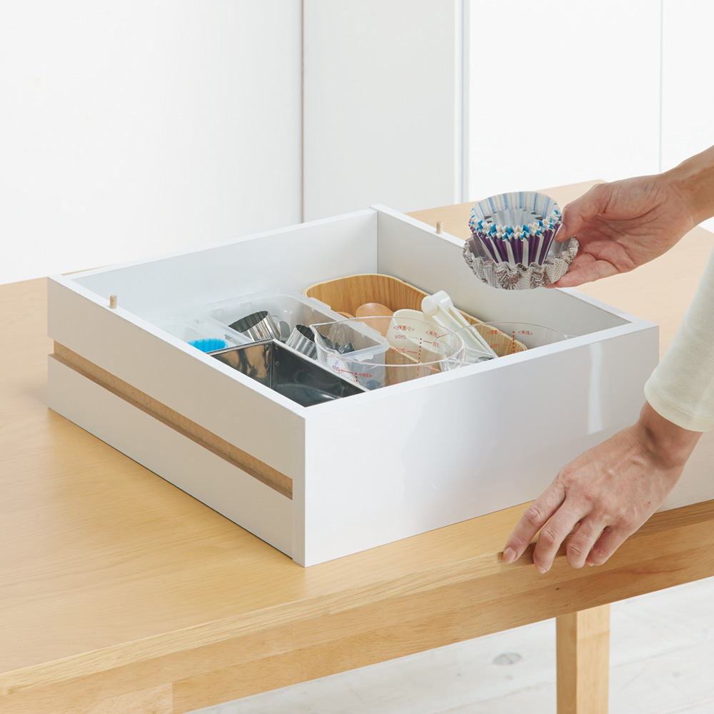 高さ調節できるトレー式引き出しで、出し入れ楽々のキッチンすき間収納庫。シンクサイドや冷蔵庫横のすき間を大量収納にできるスリムなタワー型収納家具。食品ストックに合わせてお好みの位置にトレーをセットできて空間を無駄なく活用できてキッチンすっきり!幅30cmタイプ(お届け商品)出し入れラクラク、大量収納できるストッカー食品などのストックをたっぷり収納できて、出し入れもラク。トレー式引き出し付きのキッチンストッカーです。ストックをすっきり片付けたい!そんなお悩みを解決。シンクサイドや冷蔵庫横のスペースを便利な収納空間に。選べる4サイズ設置場所に合わせて幅30・40・50・60cmの4サイズからお選び頂けます。幅60cmタイプスライドトレーで出し入れ簡単手前にスライドできるトレー式引き出し6杯付き。手前に引き出せるから奥まで中身が見やすく、使い忘れによる食品ロスも防げます。幅40cmタイプ細かいものから重いストックまで収納食器やカトラリー、ストック食品庫として普段使いの物を収納できます。取り出しにくい上部空間には頻繁には出し入れしないキッチンペーパーなどの収納がおすすめです。トレーを全段上にセットすれば、下部に重量のあるペットボトルやビールケースなどが収納できます。幅50cmタイプ扉を閉めれば見た目スッキリ扉付きだから、キッチンのごちゃつきをまとめて隠せます。幅30cm・40cm・50cmタイプの扉は、左右どちら開きにも設定可能(幅60cmタイプは両開きの扉です)。組立時にお選びください。幅60cmタイプ清潔感のある光沢デザイン扉と引き出しの前面には、お手入れが簡単で光沢が美しい素材を採用。引き出しは高さ調節可能トレー付き引き出しは、収納するものに合わせて6cm間隔でセット可能。空間や用途に合わせてフレキシブルに使えます。引き出しレールの取り付けも簡単。トレーごと移動もできる一緒に使う物は、トレーごと持ち出しても便利。中身が落ちにくいトレーは全段落下防止のストッパー付き。棚と比べ、中身が落ちにくく使いやすいのが魅力。ストッパーは簡単に取り付けできます。お手入れも簡単トレー内部は化粧仕上げだから、お掃除しやすく清潔をキープできます。