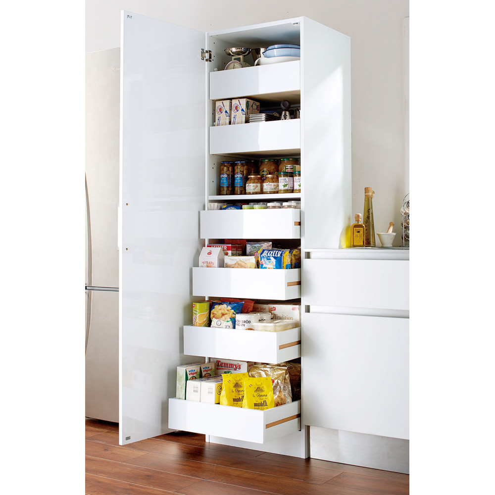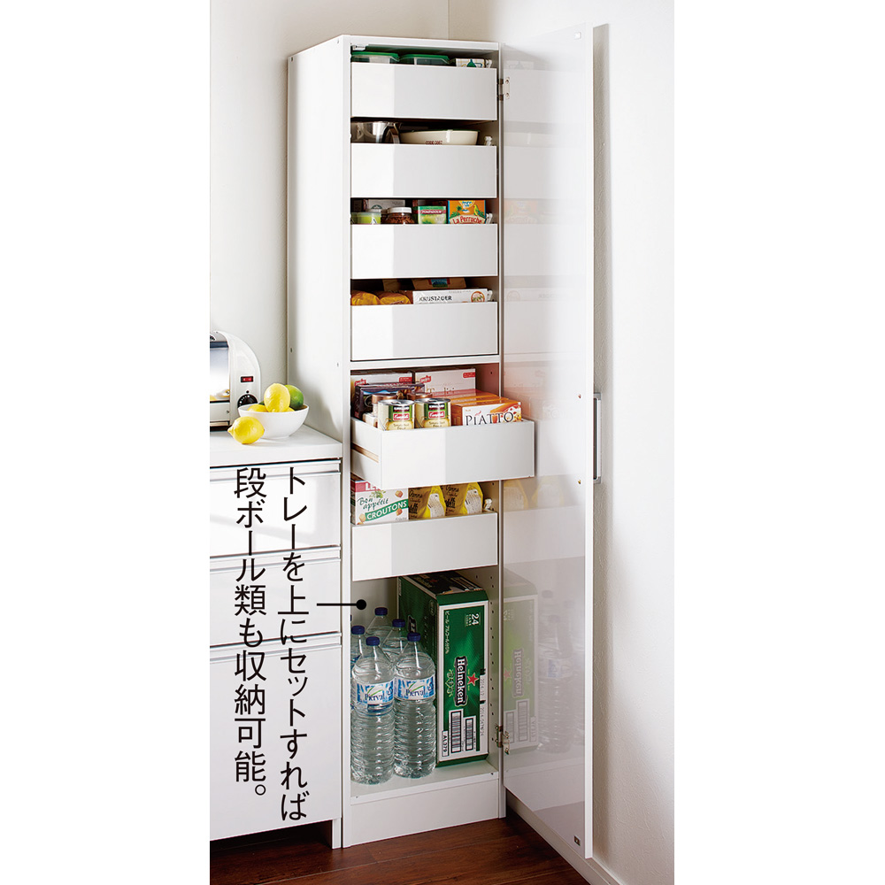高さ調節できるトレー式引き出しで出し入れ楽々な食品収納庫。シンクサイドや冷蔵庫横スペースを大量収納空間にできるキッチン収納ストッカーです。食品ストックに合わせてお好みの位置にトレーをセットできて空間を無駄なく活用できてキッチンすっきり!幅50cmタイプ(お届け商品)出し入れラクラク、大量収納できるストッカー食品などのストックをたっぷり収納できて、出し入れもラク。トレー式引き出し付きのキッチンストッカーです。ストックをすっきり片付けたい!そんなお悩みを解決。シンクサイドや冷蔵庫横のスペースを便利な収納空間に。選べる4サイズ設置場所に合わせて幅30・40・50・60cmの4サイズからお選び頂けます。幅60cmタイプスライドトレーで出し入れ簡単手前にスライドできるトレー式引き出し6杯付き。手前に引き出せるから奥まで中身が見やすく、使い忘れによる食品ロスも防げます。幅40cmタイプ細かいものから重いストックまで収納食器やカトラリー、ストック食品庫として普段使いの物を収納できます。取り出しにくい上部空間には頻繁には出し入れしないキッチンペーパーなどの収納がおすすめです。トレーを全段上にセットすれば、下部に重量のあるペットボトルやビールケースなどが収納できます。幅50cmタイプ扉を閉めれば見た目スッキリ扉付きだから、キッチンのごちゃつきをまとめて隠せます。幅30cm・40cm・50cmタイプの扉は、左右どちら開きにも設定可能(幅60cmタイプは両開きの扉です)。組立時にお選びください。幅60cmタイプ清潔感のある光沢デザイン扉と引き出しの前面には、お手入れが簡単で光沢が美しい素材を採用。引き出しは高さ調節可能トレー付き引き出しは、収納するものに合わせて6cm間隔でセット可能。空間や用途に合わせてフレキシブルに使えます。引き出しレールの取り付けも簡単。トレーごと移動もできる一緒に使う物は、トレーごと持ち出しても便利。中身が落ちにくいトレーは全段落下防止のストッパー付き。棚と比べ、中身が落ちにくく使いやすいのが魅力。ストッパーは簡単に取り付けできます。お手入れも簡単トレー内部は化粧仕上げだから、お掃除しやすく清潔をキープできます。