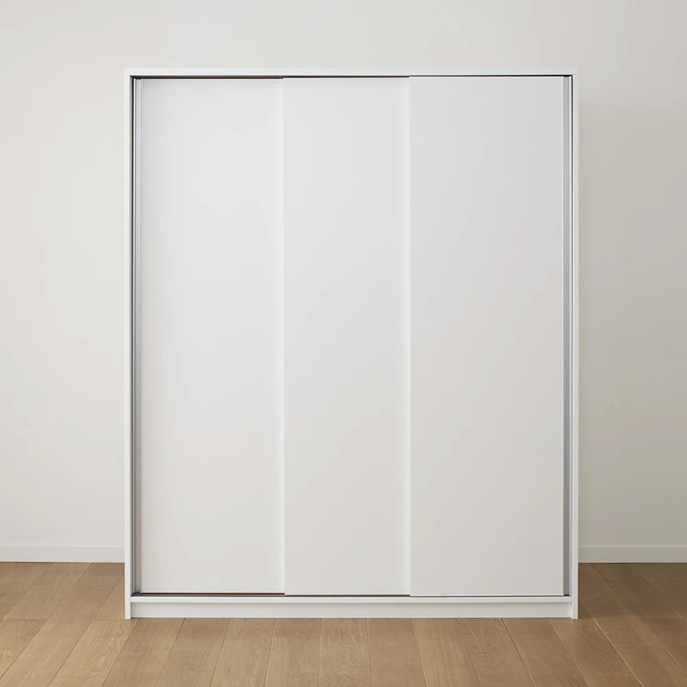 ワイドに開く3枚引き戸。引き戸仕様の扉は連動して動く3連式で開閉がラク。3枚引き戸の開口部は2枚引き戸より広いので、衣類をスムーズに出し入れできます。