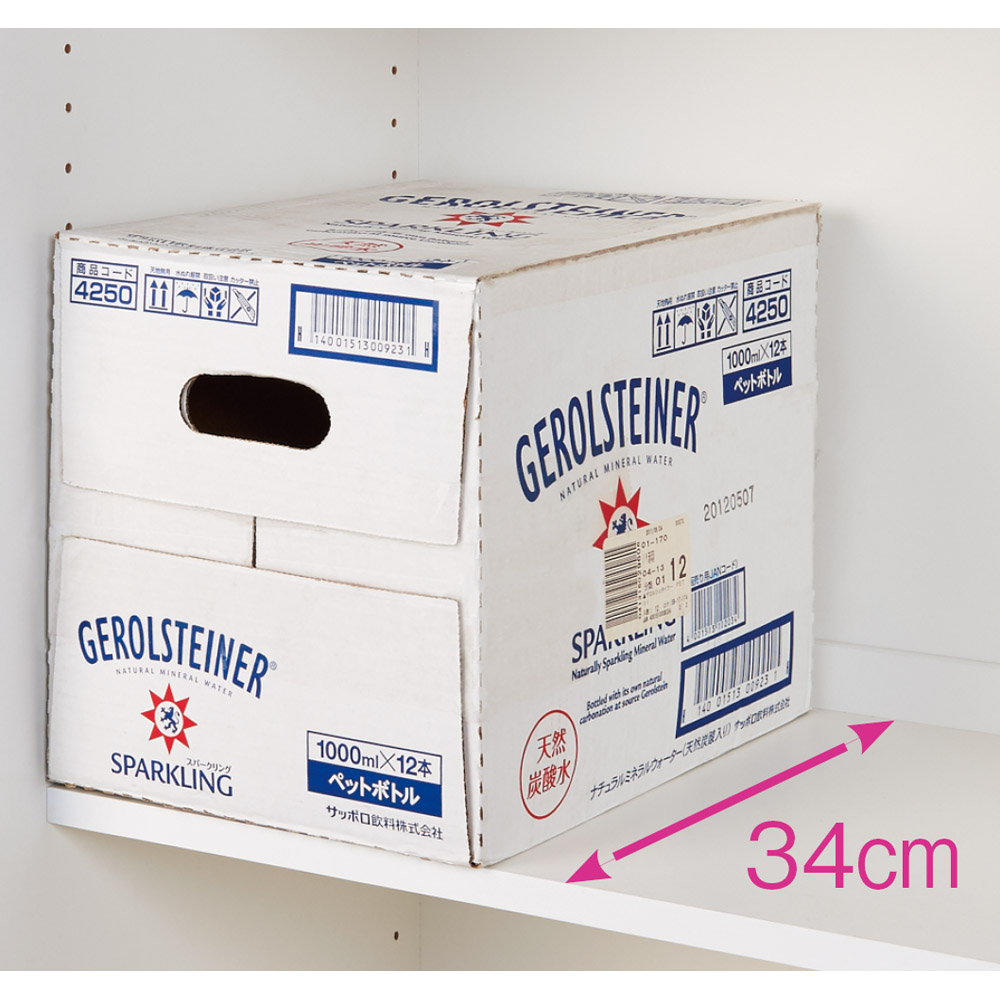 棚の奥行内寸は34cm。2Lペットボトル6本入りのケースが箱ごと入るサイズ設計です。