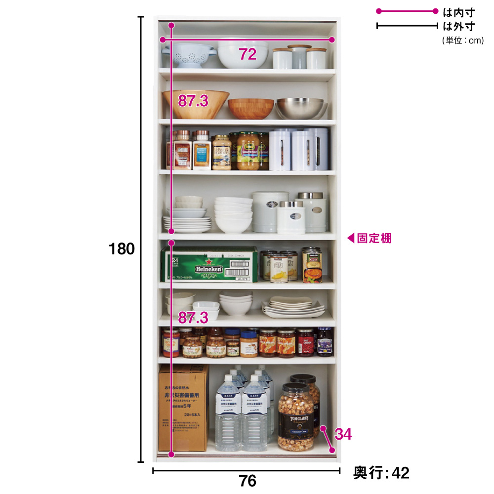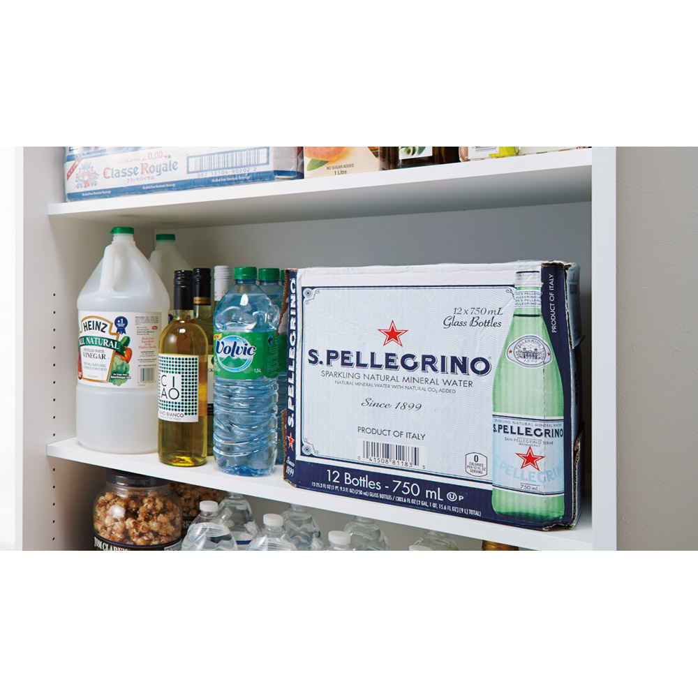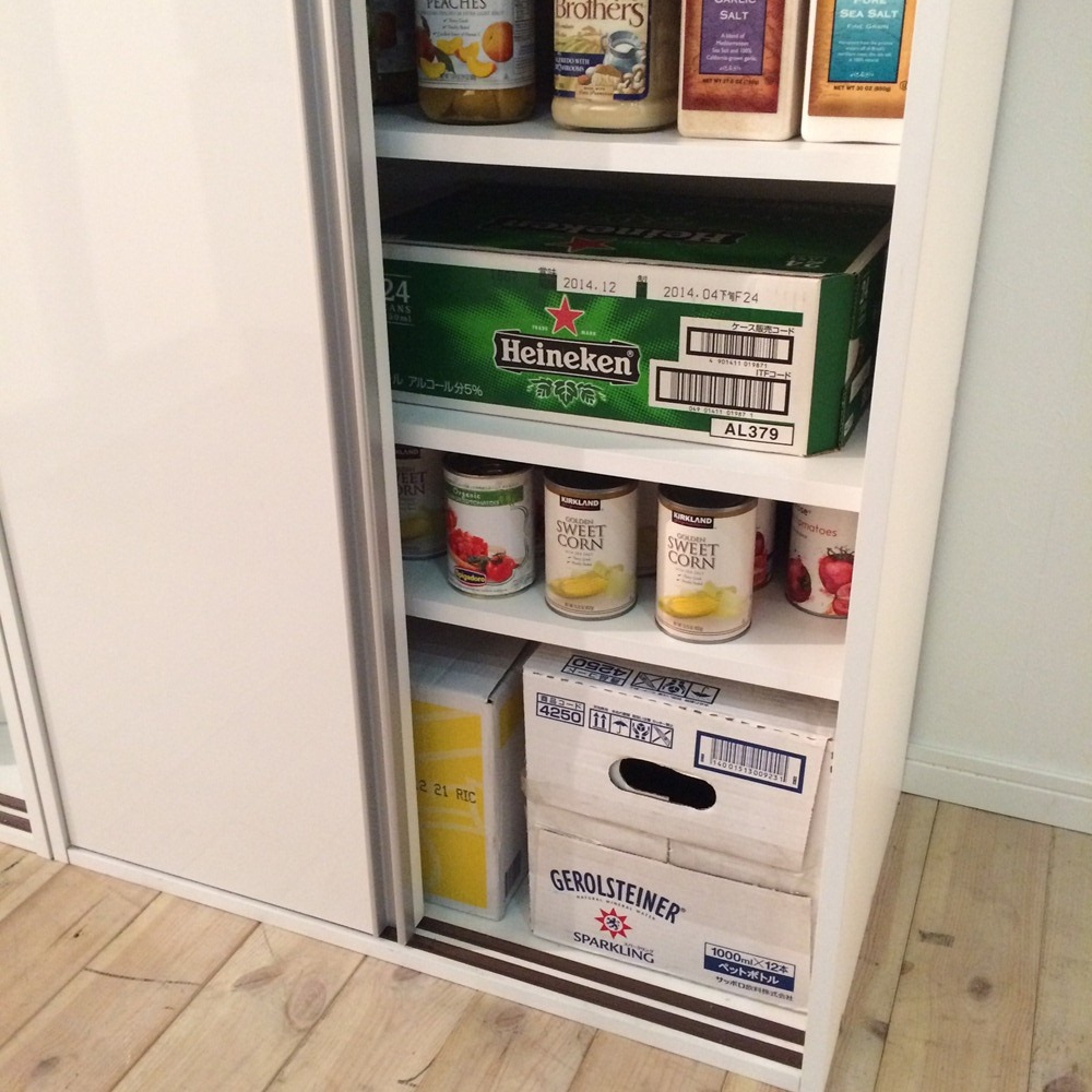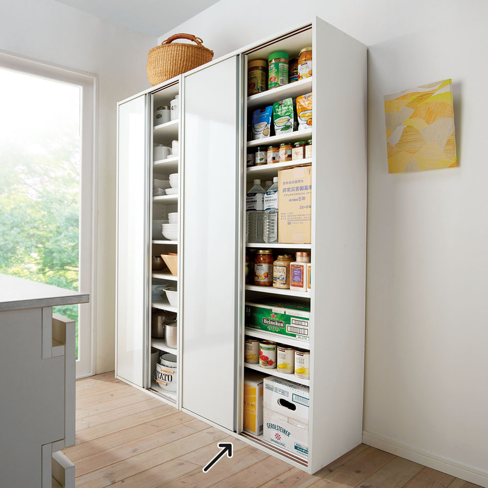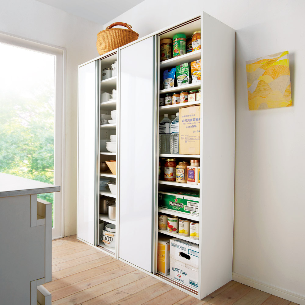 飲料のまとめ買いや防災備蓄を大量収納できる全体耐荷重約100kgの頑丈キッチン収納家具。食器や食品を入れた収納棚を省スペースな引き戸扉ですっきり隠せて、造り付けパントリーのようなデザインの人気のキッチンボード。おしゃれなシステムキッチンになじむ人気のデザインでリフォームにもおすすめです。使用例(ブラウン幅76cm)全体耐荷重100kg!大量収納できる頑丈ストッカー飲料のまとめ買いや防災備蓄を安心して収納できる、スリムなキッチンすき間収納。省スペースな引き戸扉ですっきり隠せば、まるで造り付けパントリーのよう。収納イメージ(ホワイト幅76cm お届け商品のサイズ)パントリーのようにたっぷり収納防災備蓄品などから日常使いの食器やキッチン用品まで、たっぷりしまえる省スペース設計の収納庫。サイズは選べる4タイプ。幅46cm・61cm・76cm・91cmからお選びください。使用例(ホワイト 左から幅61cm・76cm)狭い場所でも使いやすい引き戸の扉開閉スペースを取らない引き戸は、狭いキッチンでも出し入れしやすく、2人でキッチンで作業していてもスムーズに出し入れできます。たっぷり収納しても、中のごちゃつきを引き戸の扉でサッと隠すことも。飲料ストックを箱ごと収納2Lペットボトル6本入りのケースが箱ごと収納できるサイズ設計(棚板奥行34cm)。キッチンに置くと雑然と見える箱入りの飲料ストックを、箱ごと置いておけます。重い物も置ける頑丈な棚板棚板は、1段あたり約20kgまでの重量に耐えられる仕様です。積層して強度を増した、頑丈な「積層合板」を使っています。全体耐荷重は約100kg。その実力を確認するために、第三者公的機関で表示耐荷重の約2倍(合計200kg)を重りを使った「耐荷重試験」を実施。異常なしと認められました。棚板は高さ調節可能3cm間隔で高さ調節ができる、可動棚板6枚付き。ホワイト幅90cm美しい光沢素材はお手入れも簡単一般的なシステムキッチンのインテリアにマッチするように、光沢仕上げのポリエステル化粧合板を使用。水ハネや汚れも簡単に拭き取れます。スムーズに開閉できる引き戸裏に滑車が付いているので、軽い力でもなめらかに開閉ができます。幅76cmタイプ(左からホワイト・ブラウン)安心と信頼の国内生産品熟練の家具職人がひとつずつ丁寧に仕上げたキッチン収納・食品ストッカー・食器棚です。細部の丁寧な仕上がりなど、国産品ならではの高品質をお楽しみください。引っ越しやリフォームのタイミングにもおすすめ。