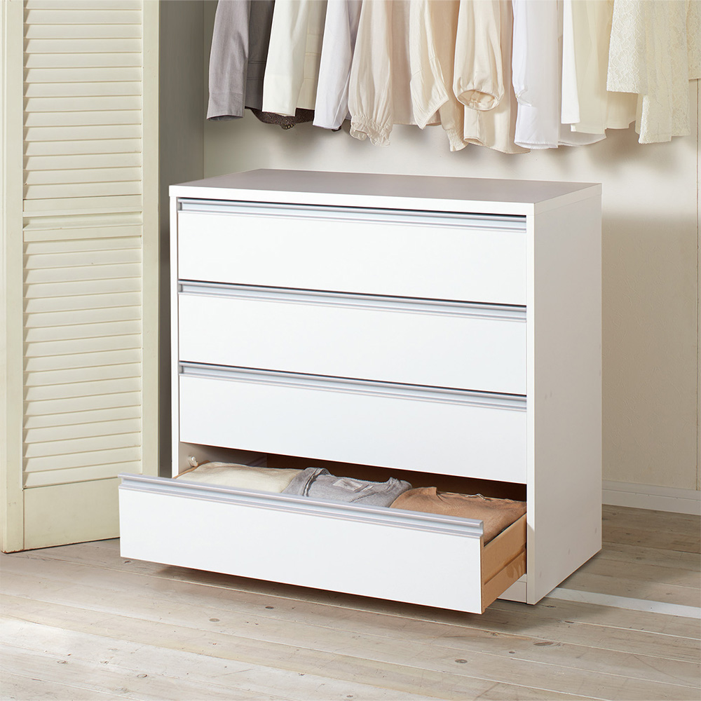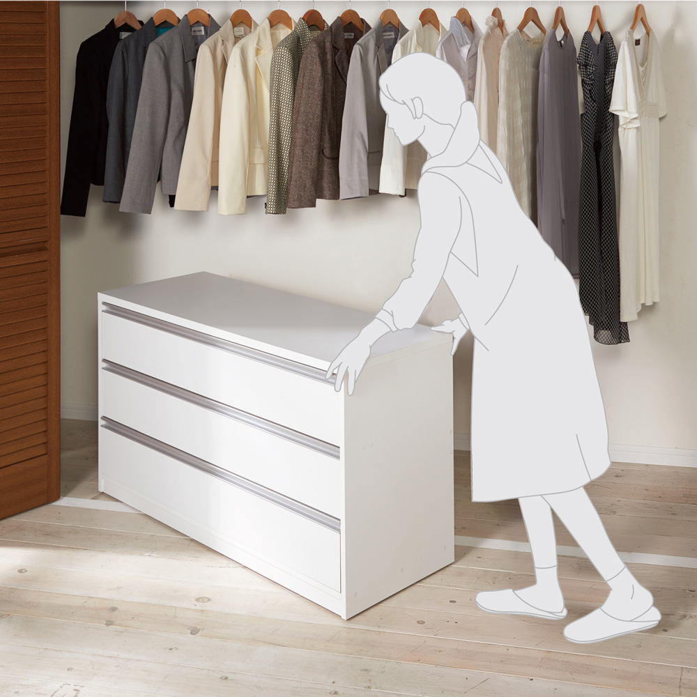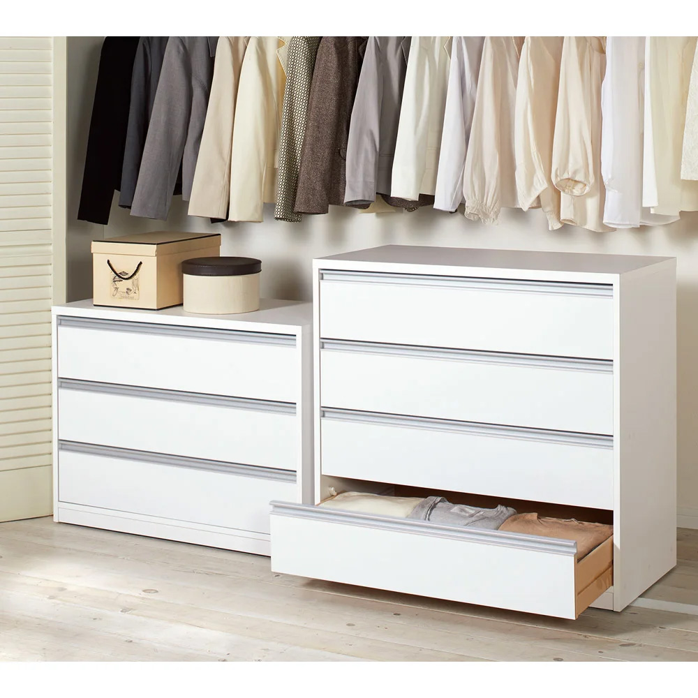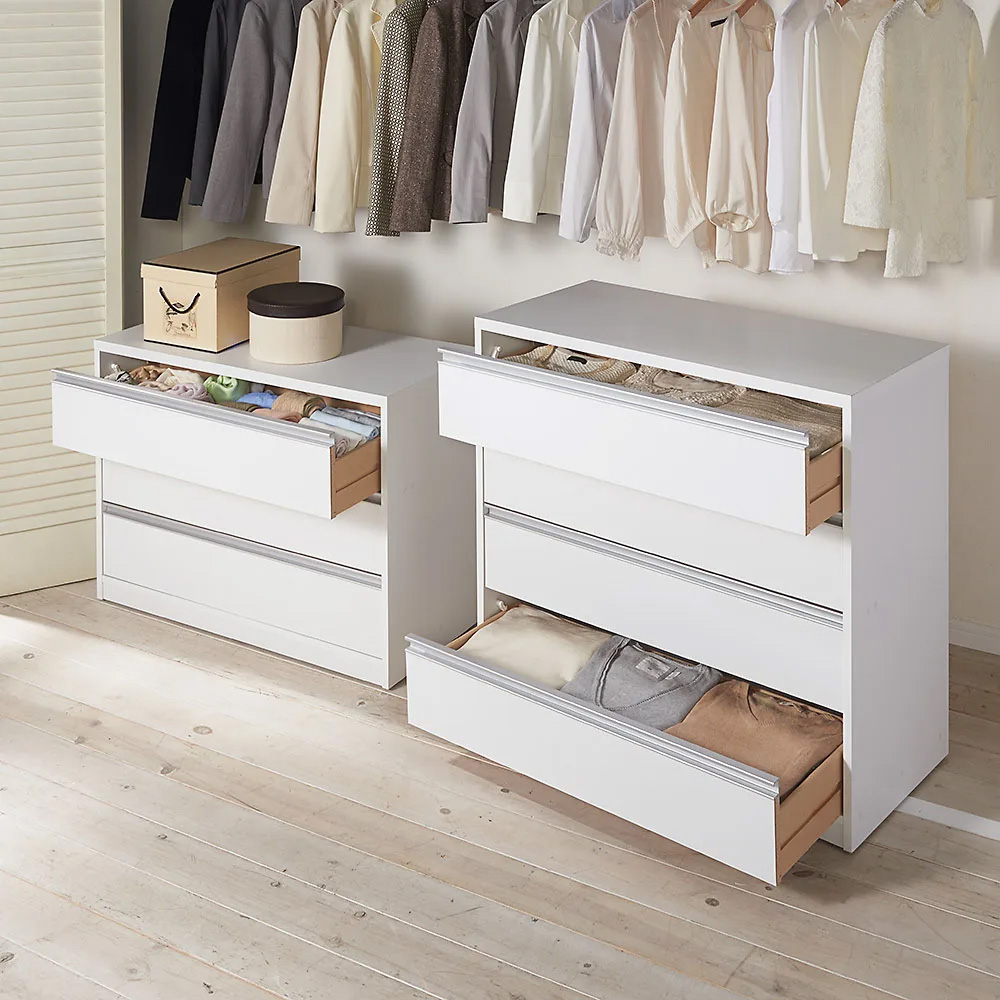 コーディネート例 隠しキャスター付きなのでクローゼットから前へ簡単に出せます。 ※お届けは(写真右)幅90cm・4段タイプです。