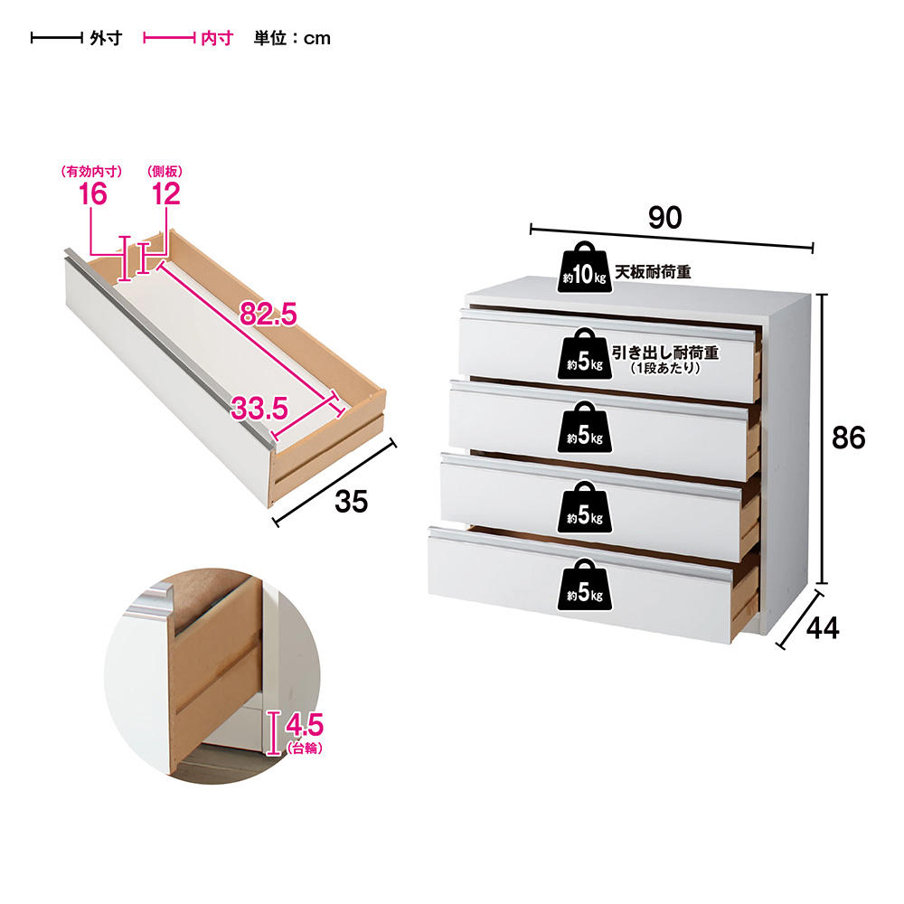 引き出し有効内寸 幅82.5cm 奥行33.5cm 高さ16cm。