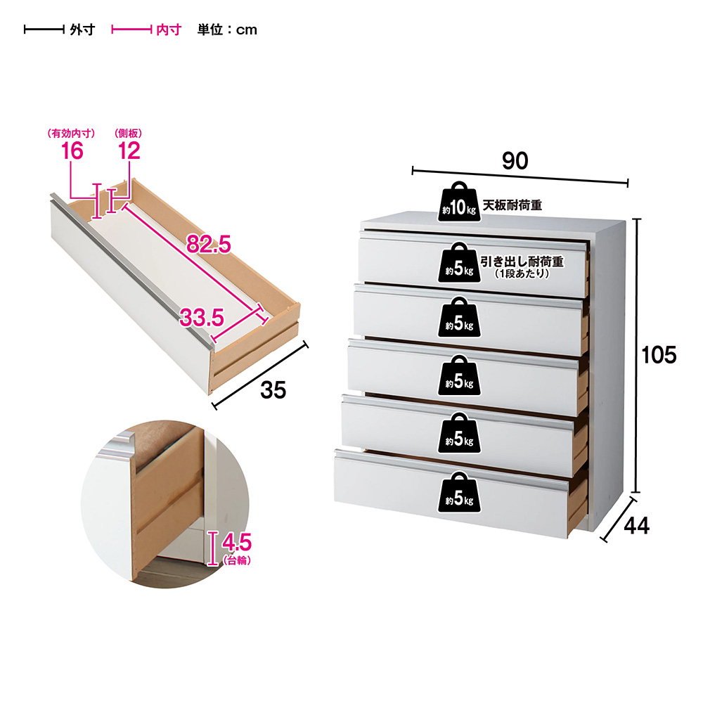引き出し有効内寸 幅82.5cm 奥行33.5cm 高さ16cm。