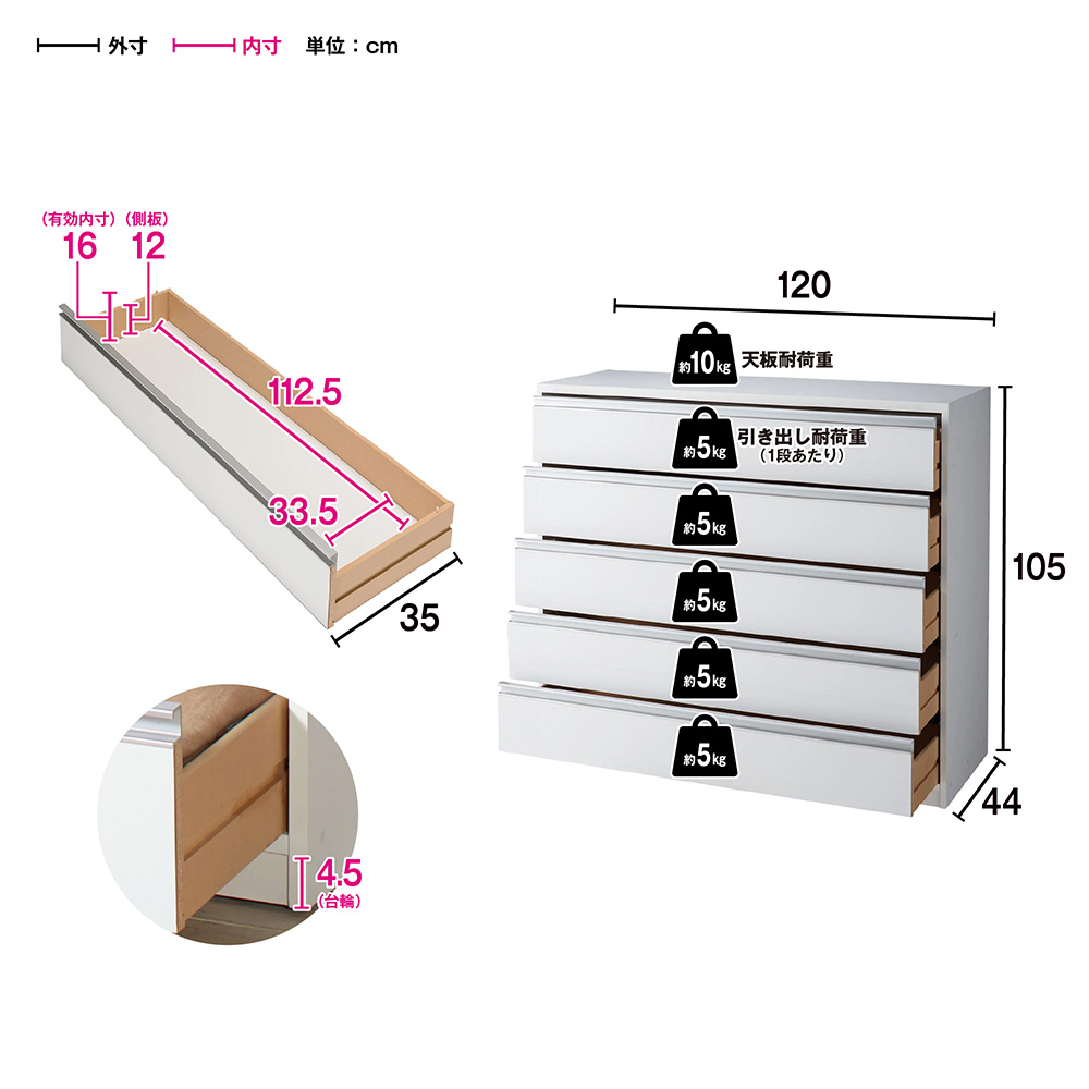 引き出し有効内寸 幅112.5cm 奥行33.5cm 高さ16cm。