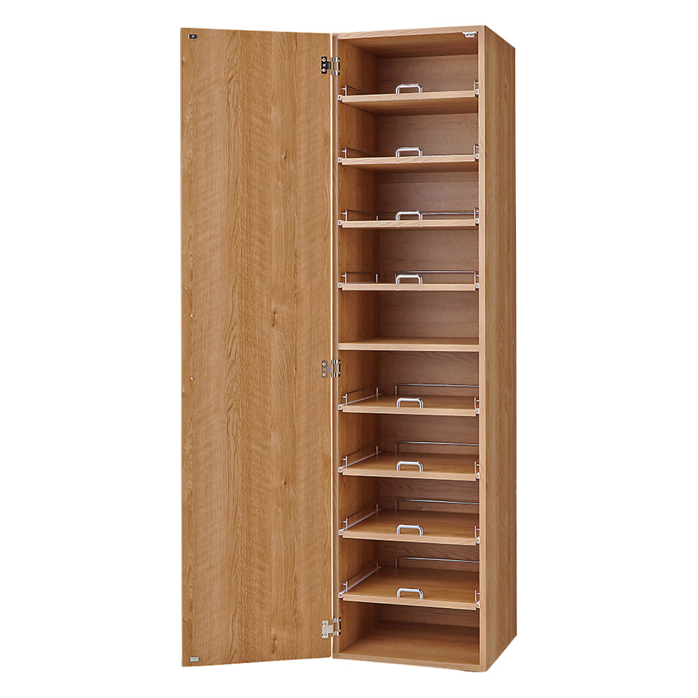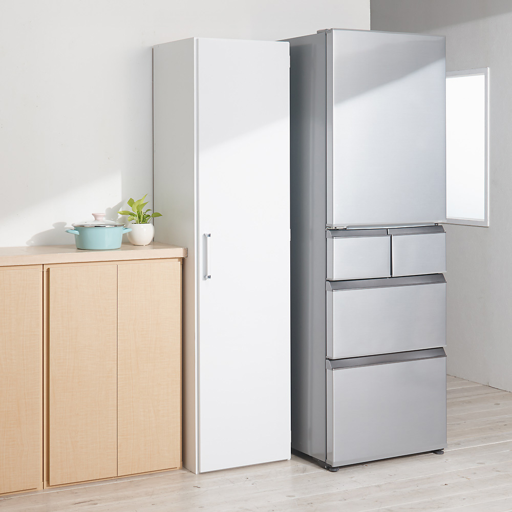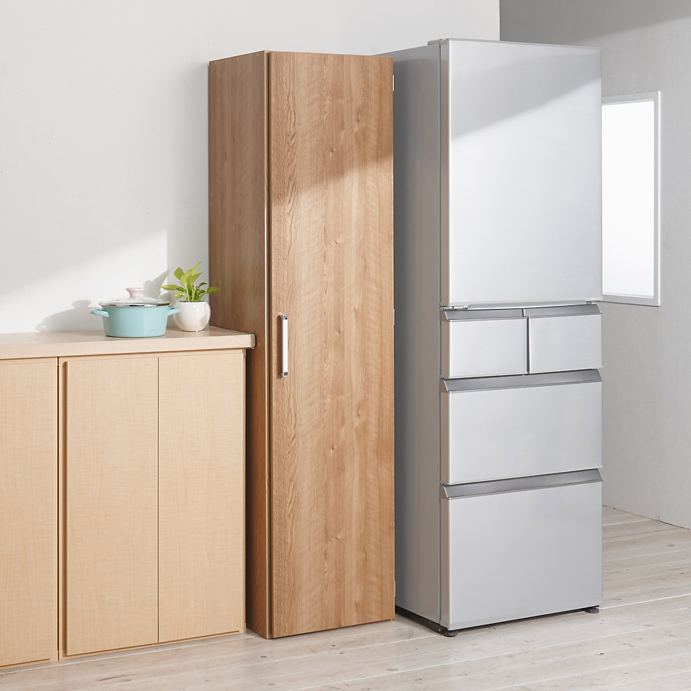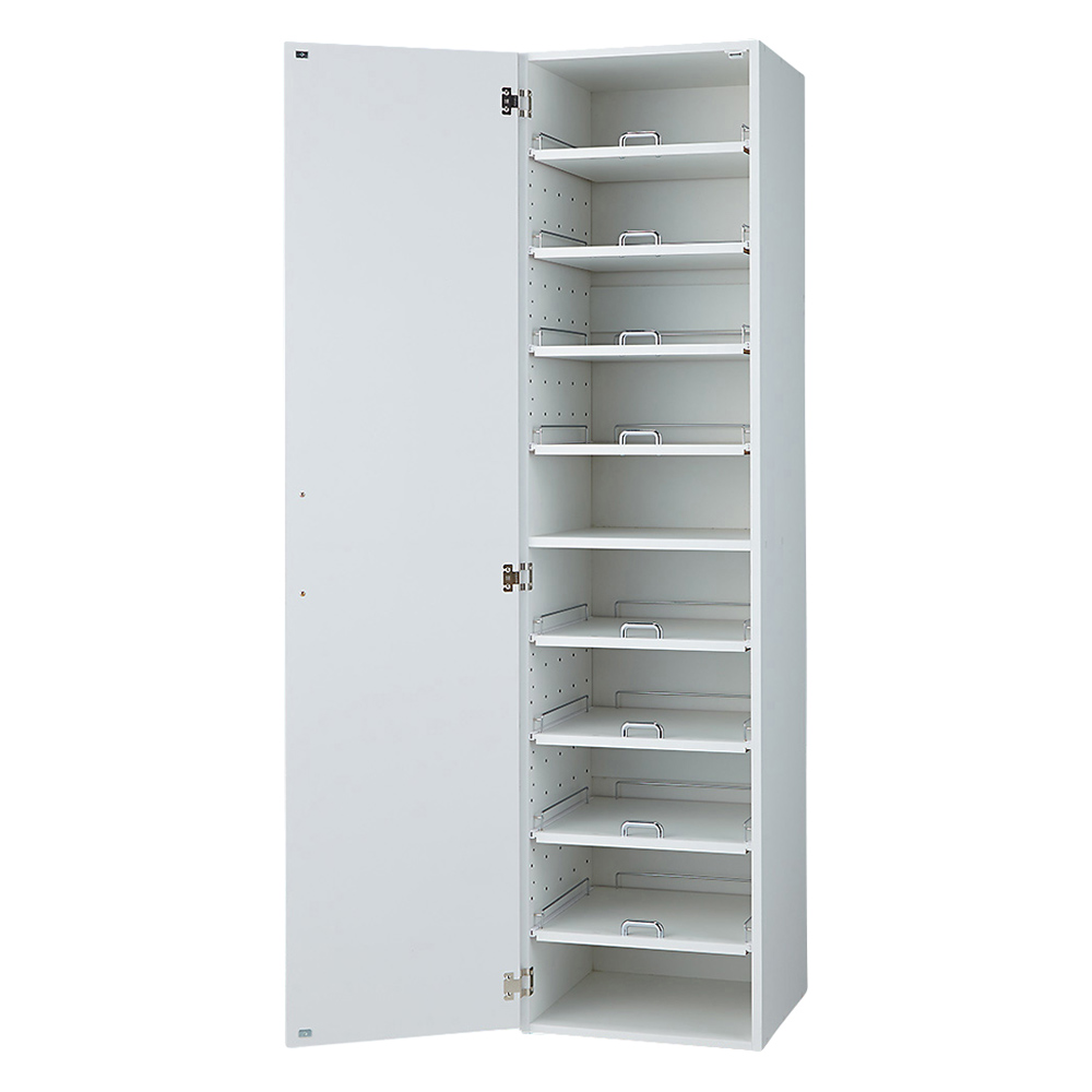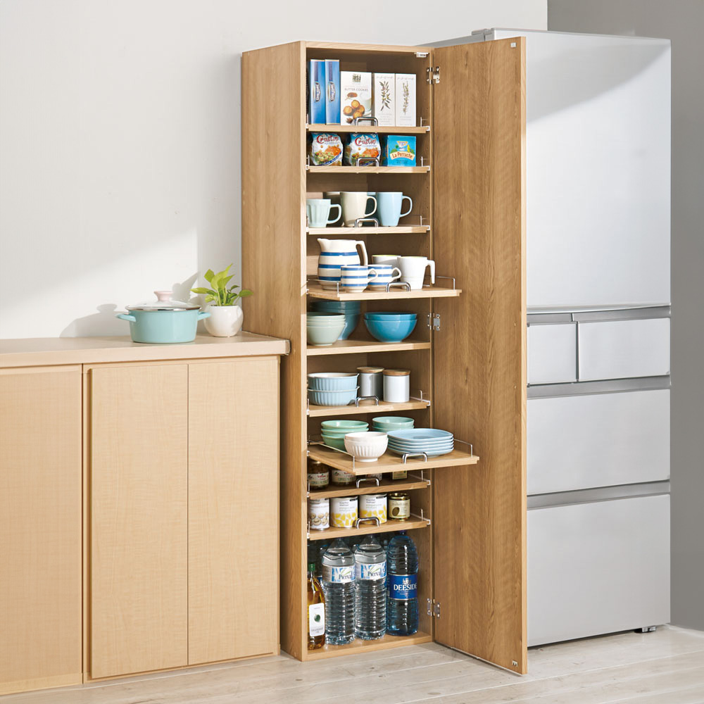 「食器の取り出しやすさ」にこだわった食器棚!棚板がスライドするから、探しやすく、出し入れのストレスが軽減するのが嬉しい、アイディア収納です。使用例(ナチュラル幅45cmタイプ)忙しい毎日をサポートする食器棚、その秘密は「スライド式棚板」毎日の家事、特にキッチン周りの整理整頓は時間も労力も必要ですよね。でも、「奥のものを取り出しやすい食器棚」があれば、その悩みを解消できます。この食器棚の最大の特徴、それはスライド式の棚板です。奥行きのある収納スペースでもスムーズに物を出し入れできるので、棚板の一番奥のものを取り出すときも、収納するときも、使い勝手が格段に向上します。スペースの有効利用で、キッチンがもっと広く感じられるこの食器棚は、スペース効率を最大限に追求しています。スライド式棚板を採用することでキッチンをすっきり保ち、狭い空間でも広々と使えます。「食器の取り出しやすさ」にこだわった食器棚スライド式だから奥の食器もラクに取り出せます。「手前の食器を取り出してから奥の食器を出す」という手間を軽減。奥行きを生かして大量収納も実現。食器の種類に応じて高さ調整可能スライド式棚板は、6cm間隔で高さ調整が可能。収納する食器の高さに応じて、お好みの高さに設定してお使いいただけます。また、スライド棚はストッパー付きなので、抜け落ちる心配はありません。お手入れしやすい素材ホワイトはポリエステル化粧合板で、汚れてもお手入れも簡単。使用例(ナチュラル幅75cm)デザインと機能性を兼ね備えた理想の食器棚見た目にも美しく、機能性にも優れたこの食器棚は、どんなキッチンにも馴染むデザインです。使い勝手のよさはもちろんのこと、シンプルで洗練された外観はインテリアにもなじみます。お届け商品は「幅45cmタイプ」収納スペースに合わせて3サイズから選べますご自宅のキッチンサイズ別に幅45・60・75cmの3タイプから、ご自宅のサイズに合わせてお選びいただけます。幅45cmタイプカラーはホワイト・ナチュラルの2色