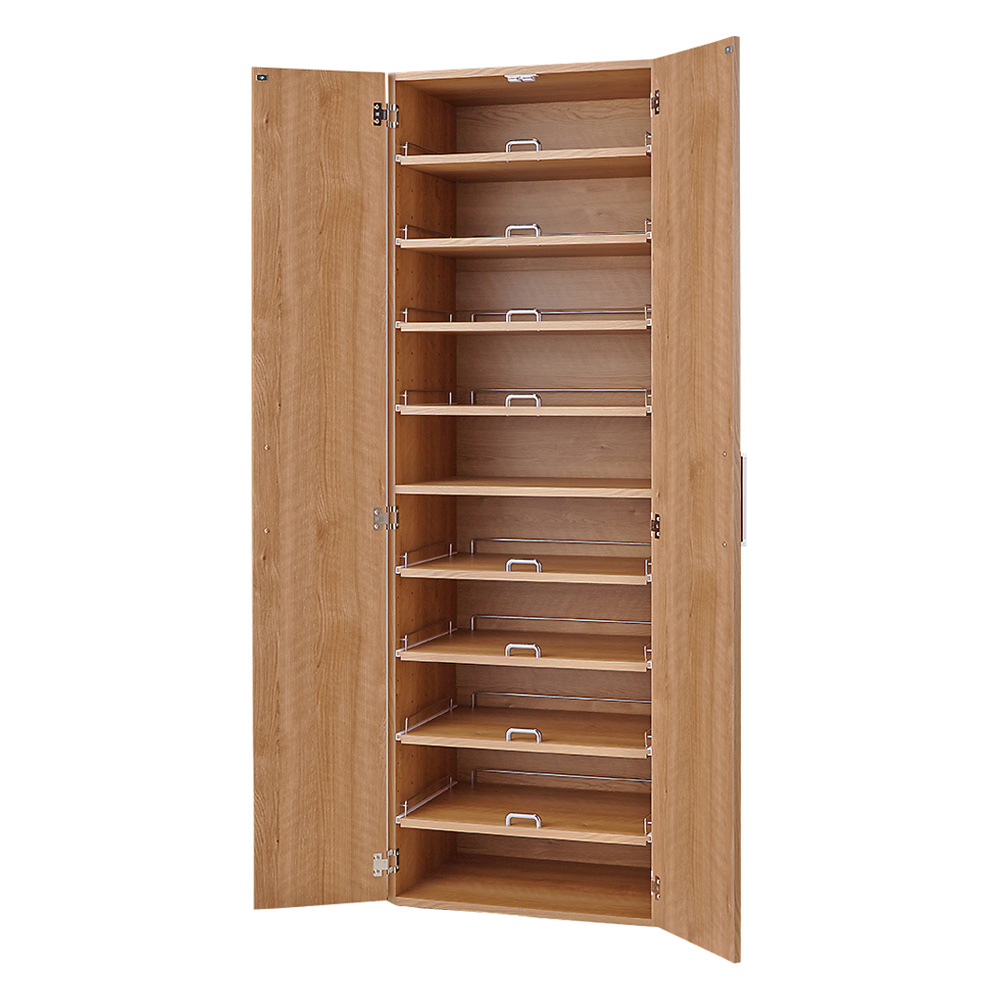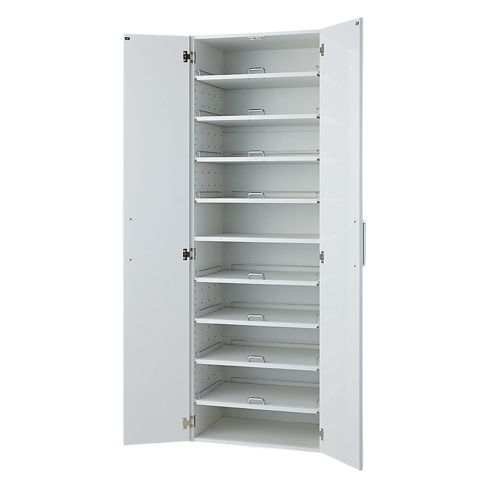 「食器の取り出しやすさ」にこだわった食器棚!棚板がスライドするから、探しやすく、出し入れのストレスが軽減するのが嬉しい、アイディア収納です。使用例(ナチュラル幅60cmタイプ)忙しい毎日をサポートする食器棚、その秘密は「スライド式棚板」毎日の家事、特にキッチン周りの整理整頓は時間も労力も必要ですよね。でも、「奥のものを取り出しやすい食器棚」があれば、その悩みを解消できます。この食器棚の最大の特徴、それはスライド式の棚板です。奥行きのある収納スペースでもスムーズに物を出し入れできるので、棚板の一番奥のものを取り出すときも、収納するときも、使い勝手が格段に向上します。スペースの有効利用で、キッチンがもっと広く感じられるこの食器棚は、スペース効率を最大限に追求しています。スライド式棚板を採用することでキッチンをすっきり保ち、狭い空間でも広々と使えます。「食器の取り出しやすさ」にこだわった食器棚スライド式だから奥の食器もラクに取り出せます。「手前の食器を取り出してから奥の食器を出す」という手間を軽減。奥行きを生かして大量収納も実現。食器の種類に応じて高さ調整可能スライド式棚板は、6cm間隔で高さ調整が可能。収納する食器の高さに応じて、お好みの高さに設定してお使いいただけます。また、スライド棚はストッパー付きなので、抜け落ちる心配はありません。お手入れしやすい素材ホワイトはポリエステル化粧合板で、汚れてもお手入れも簡単。使用例(ナチュラル幅75cm)デザインと機能性を兼ね備えた理想の食器棚見た目にも美しく、機能性にも優れたこの食器棚は、どんなキッチンにも馴染むデザインです。使い勝手のよさはもちろんのこと、シンプルで洗練された外観はインテリアにもなじみます。お届け商品は「幅60cmタイプ」収納スペースに合わせて3サイズから選べますご自宅のキッチンサイズ別に幅45・60・75cmの3タイプから、ご自宅のサイズに合わせてお選びいただけます。幅60cmタイプカラーはホワイト・ナチュラルの2色