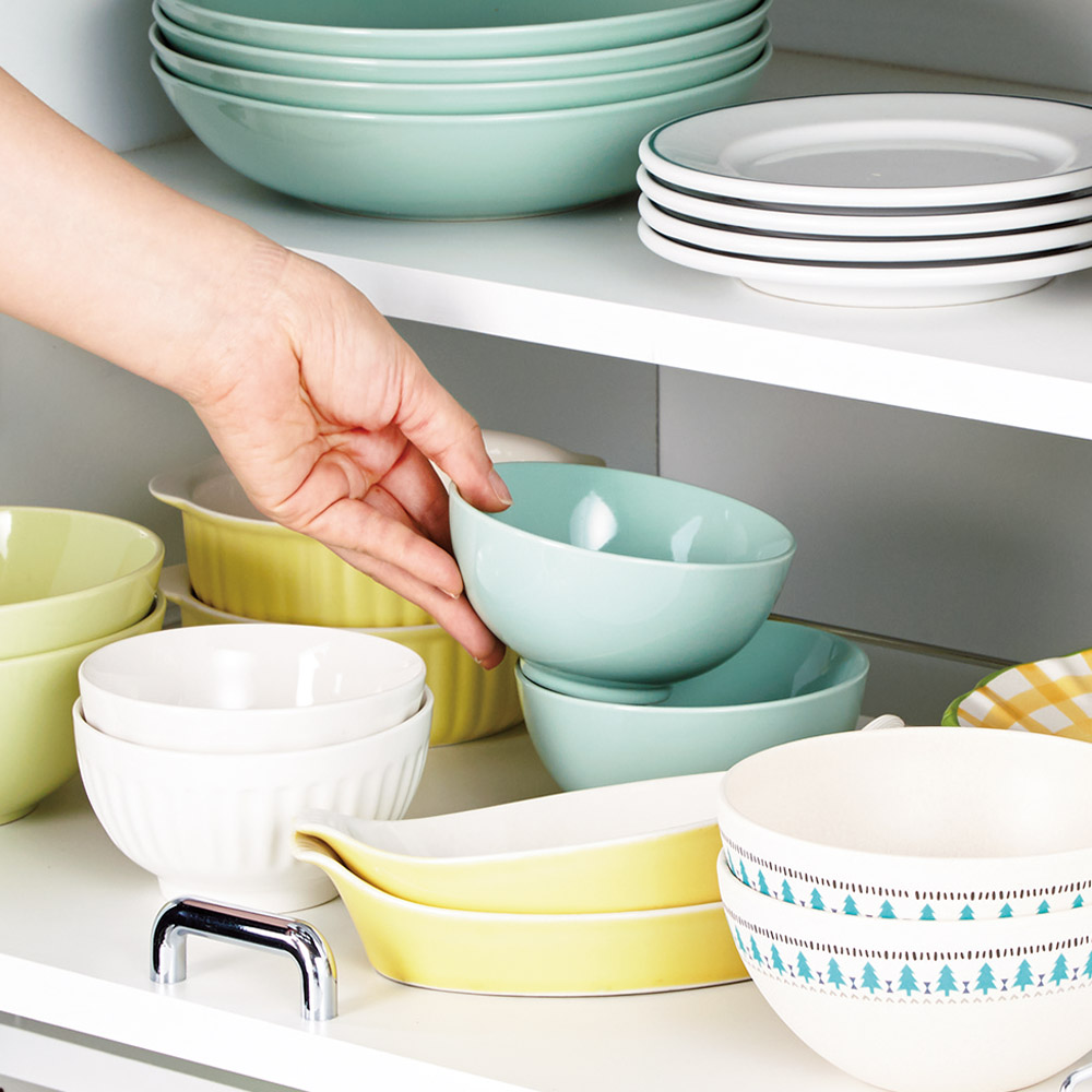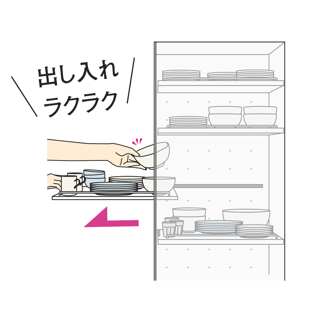スライド式だから奥の食器もラクラク。奥行を活かして大量収納が可能。奥の食器もラクに取り出せます。