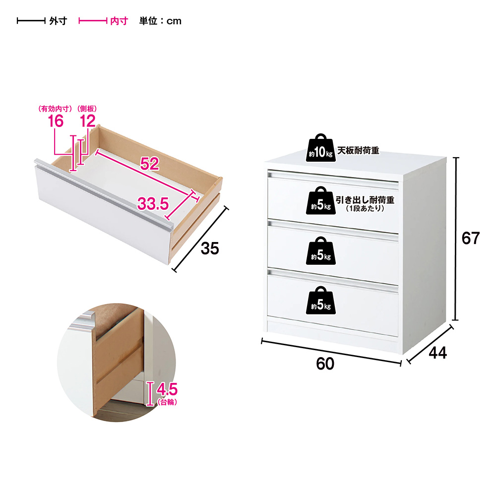 引き出し有効内寸 幅52cm 奥行33.5cm 高さ16cm