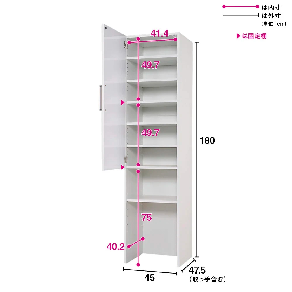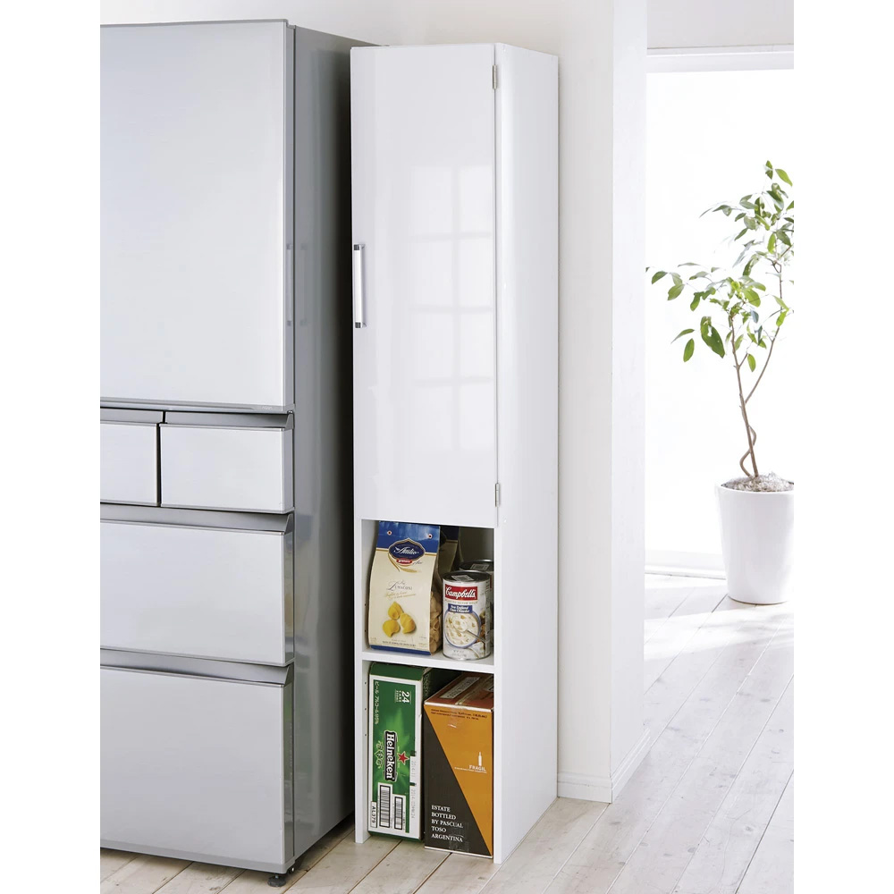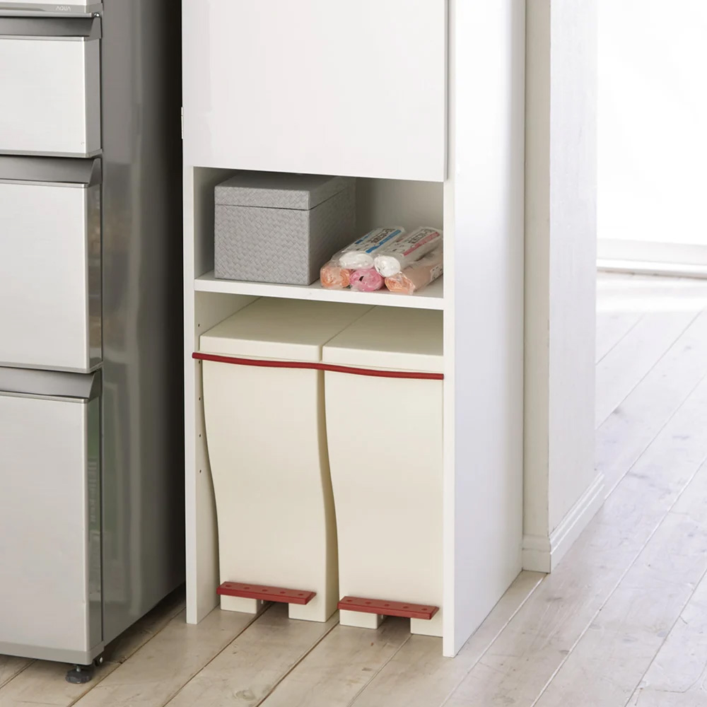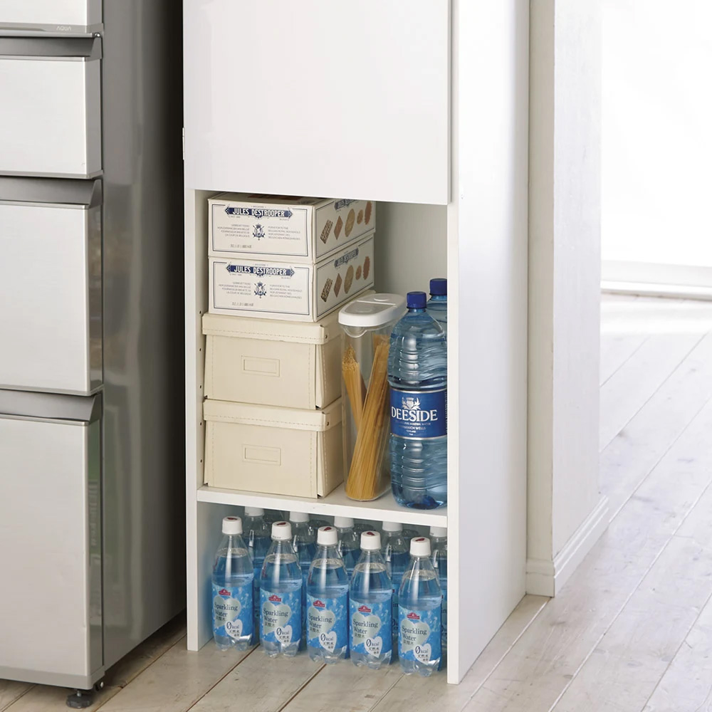 デッドスペースになりがちなゴミ箱の上が便利な収納スペースになっちゃうキッチン隙間ストッカー。オープン部にはゴミ箱以外にも、段ボールや重たい飲料ケース、脚立などが収納できます。ゴミ箱上に収納スペースができる便利なキッチンストッカー◆デッドスペースになりがちなゴミ箱の上にもたっぷりの収納スペースを確保しました。◆幅25〜45cmまでの5cm刻みで、キッチンのちょっとしたスペースにもぴったり収まります。◆上段は扉付きで収納物を綺麗に隠して収納できます。固定棚板1枚と、可動棚板4枚付きで、3cm間隔で高さ調節ができます。◆下段のオープン部は使い道がいろいろ。内寸高さ75cmで、ゴミ箱以外にも重い飲料ケースや脚立、段ボールなどが床置きできます。6cm間隔で高さ調節ができる可動棚板が1枚付いているので、ゴミ袋のストックなどを収納するのに便利です。◆前面は光沢のあるポリエステル化粧合板で高級感のある仕様です。◆扉は左右どちらでも設置可能なので、ご自宅の設置場所に合わせて組立てることができます。置き場所に合わせて選べる5サイズ展開◆ご自宅のキッチンに合わせて、幅25・幅30・幅35・幅40・幅45の5サイズからお選びいただけます。◆奥行も47.5cmとたっぷりあるので、スリムながら、大量収納が叶います。