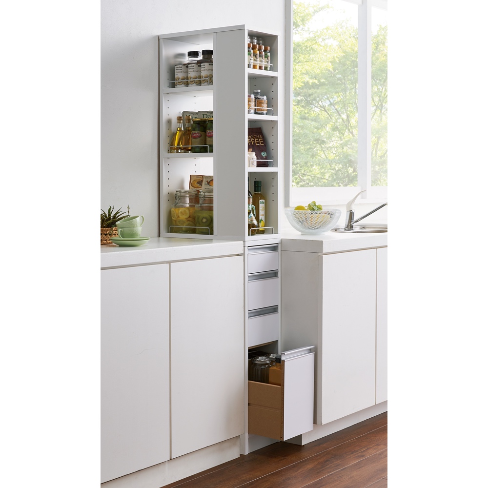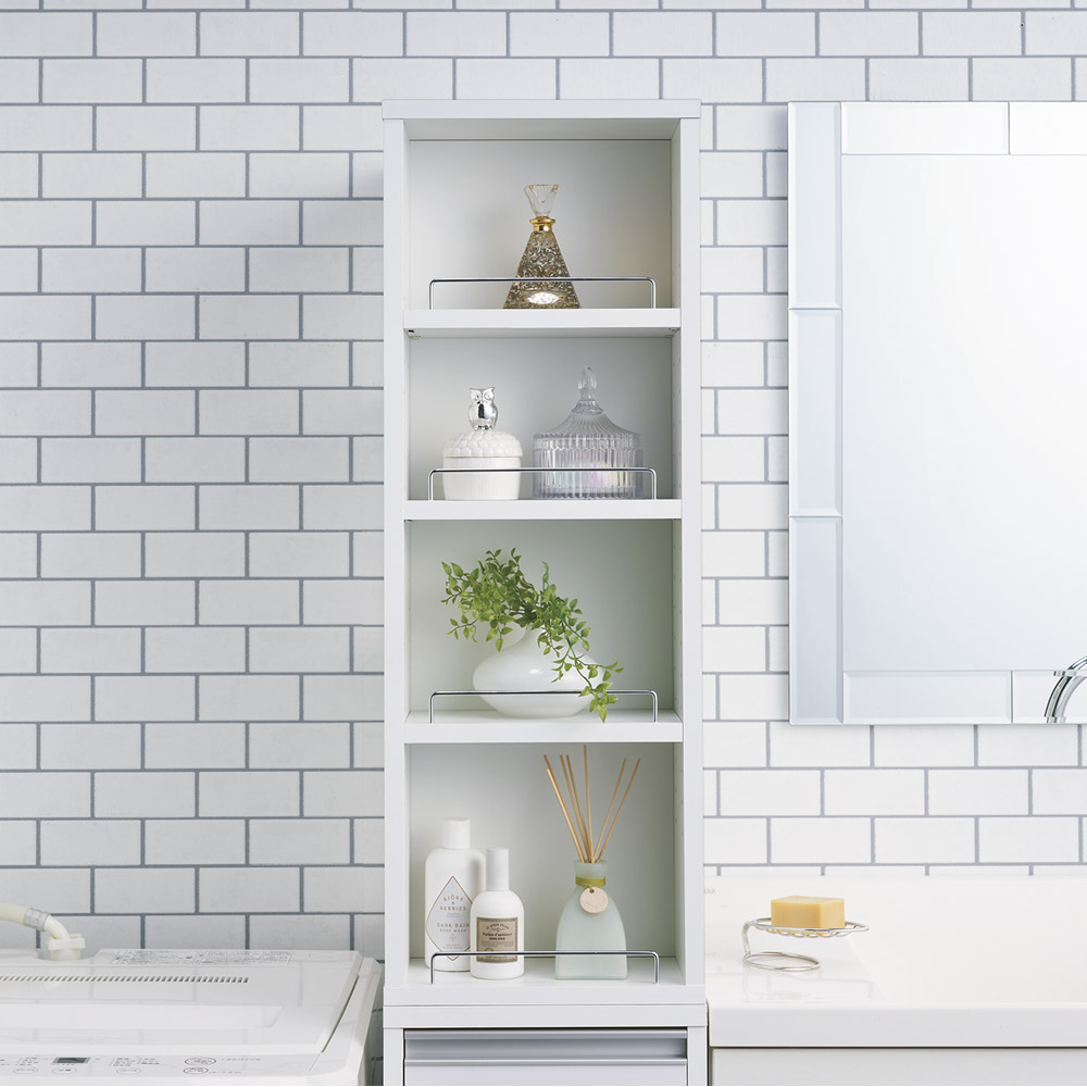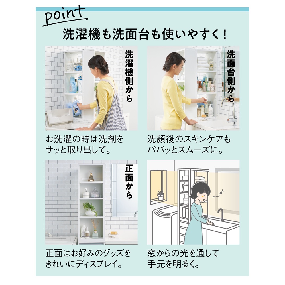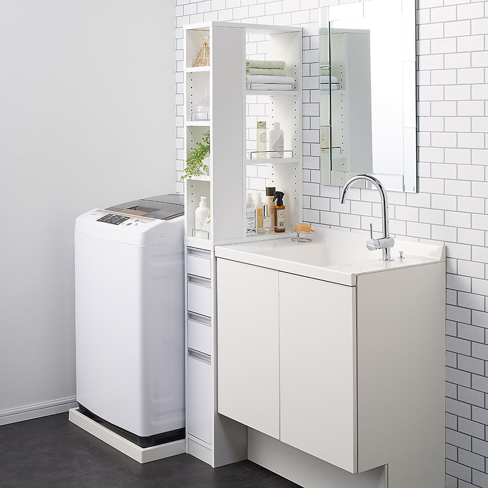 「取り出しやすい収納」が狭い洗面所の使い勝手を良くします!3面オープンだから、収納物がひと目でわかり、片側からは洗剤を、もう片側からは化粧品がすぐに取り出せます。下部のチェストにはバスタオルや洗剤の収納に。女性目線で選ばれる、洗面所や洗濯機横の隙間家具●幅は15cm、20cm、25cm、30cmからお選びいただけます。●洗面所にぴったりの奥行44.5cm。●清潔感が大事な洗面所におすすめの爽やかなホワイト色です。●シンプルなデザインなので狭い洗面所でも圧迫感を感じさせません。ポイント(1)3面オープン棚だからすぐに取り出せる、整理も簡単です●洗面台と洗濯機の間に設置すると使い勝手がアップ!●オープン棚は細かなものが落ちにくいこぼれ止めバーが付いています。●棚板は3cm間隔で高さ調整が可能です。●サニタリーの隙間だけでなく、キッチンのすき間でも使いやすい収納庫です。ポイント(2)下部のチェストには洗面所まわりの収納を入れてスッキリ●引き出しには洗剤やドライヤーなど洗面所の収納が入ります。●収納場所に困るタオル収納にもおすすめです。●最下段の引き出しは深さが31.5cmあるので、背の高いボトル洗剤も入ります。ポイント(3)水まわりで使いやすい素材を使用しました●前面は水ハネや汚れに強い光沢仕上げの素材です。●側面、棚板には汚れてもお手入れがラクなハードコート紙を使用しました。●汚れてもお手入れ簡単なので、お掃除もラクラクです。