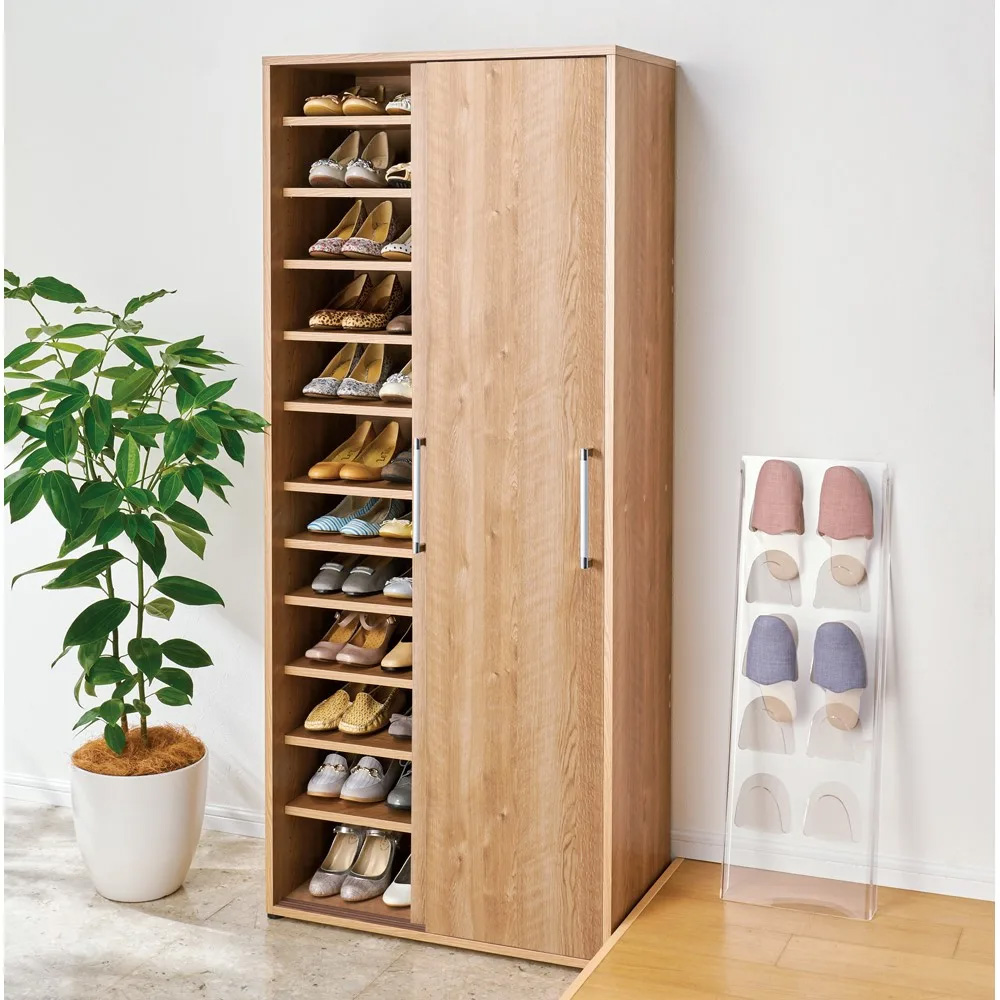 木のぬくもりあふれるデザインと開閉が邪魔にならない引き戸式扉が便利な下駄箱。狭い玄関でも使いやすい人気の引き戸タイプで、たくさん靴の収納ができる大容量収納家具です〜狭い玄関でも使えて開閉スムーズな引き戸玄関収納〜◆スペースを取らない引き戸式の靴箱はシューズラックのアイデア商品です。◆幅77cmタイプは48足の靴を収納できます。(靴の大きさにより収納足数は変わります)◆もちろん男性の靴も収納できるように奥行サイズに余裕を持たせました。(内寸奥行約32.5cm)◆引き戸扉は軽い力でスムーズに開閉できる機能付き。◆引き戸扉裏の下部に車輪が付いているので引っ掛かりなく楽に開閉できます。◆お出かけ前と帰宅後の靴の出し入れがストレスなく快適にご使用いただけます。◆底面には玄関の床のガタツキを調整できるアジャスター付き。〜美しい木目のデザインでおしゃれに目隠し〜◆天然木の木目を忠実に再現した、高級プリント紙使用。木目の美しさをうっとりと引き立てます。◆お客様の目に触れやすい玄関のごちゃつきをすっきり目隠しできる省スペース収納。◆木目が美しい天然木調の表面材を使用。置くだけで玄関がほっと落ち着く憩いの空間に。◆あたたかみと味わい深さを感じるブラウン色で玄関をシックに演出します。◆玄関インテリアとしておしゃれなシンプルデザインであなたの玄関スペースを彩ります。〜安心の国産家具〜◆安心の日本製。国内の職人が日本の工場で、心をこめて丁寧に仕上げております。