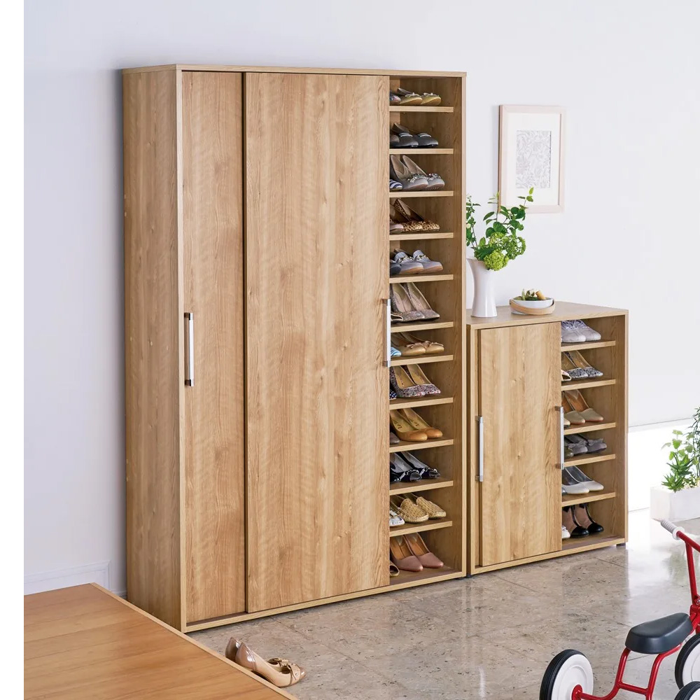 木のぬくもりあふれるデザインと開閉が邪魔にならない引き戸式扉が便利な下駄箱。狭い玄関でも使いやすい人気の引き戸タイプで、たくさん靴の収納ができる大容量収納家具です〜狭い玄関でも使えて開閉スムーズな引き戸玄関収納〜◆スペースを取らない引き戸式の靴箱はシューズラックのアイデア商品です。◆幅114cmタイプは72足の靴を収納できます。(靴の大きさにより収納足数は変わります)◆もちろん男性の靴も収納できるように奥行サイズに余裕を持たせました。(内寸奥行約32.5cm)◆引き戸扉は軽い力でスムーズに開閉できる機能付き。◆引き戸扉裏の下部に車輪が付いているので引っ掛かりなく楽に開閉できます。◆お出かけ前と帰宅後の靴の出し入れがストレスなく快適にご使用いただけます。◆底面には玄関の床のガタツキを調整できるアジャスター付き。〜美しい木目のデザインでおしゃれに目隠し〜◆天然木の木目を忠実に再現した、高級プリント紙使用。木目の美しさをうっとりと引き立てます。◆お客様の目に触れやすい玄関のごちゃつきをすっきり目隠しできる省スペース収納。◆木目が美しい天然木調の表面材を使用。置くだけで玄関がほっと落ち着く憩いの空間に。◆あたたかみと味わい深さを感じるブラウン色で玄関をシックに演出します。◆玄関インテリアとしておしゃれなシンプルデザインであなたの玄関スペースを彩ります。〜安心の国産家具〜◆安心の日本製。国内の職人が日本の工場で、心をこめて丁寧に仕上げております。