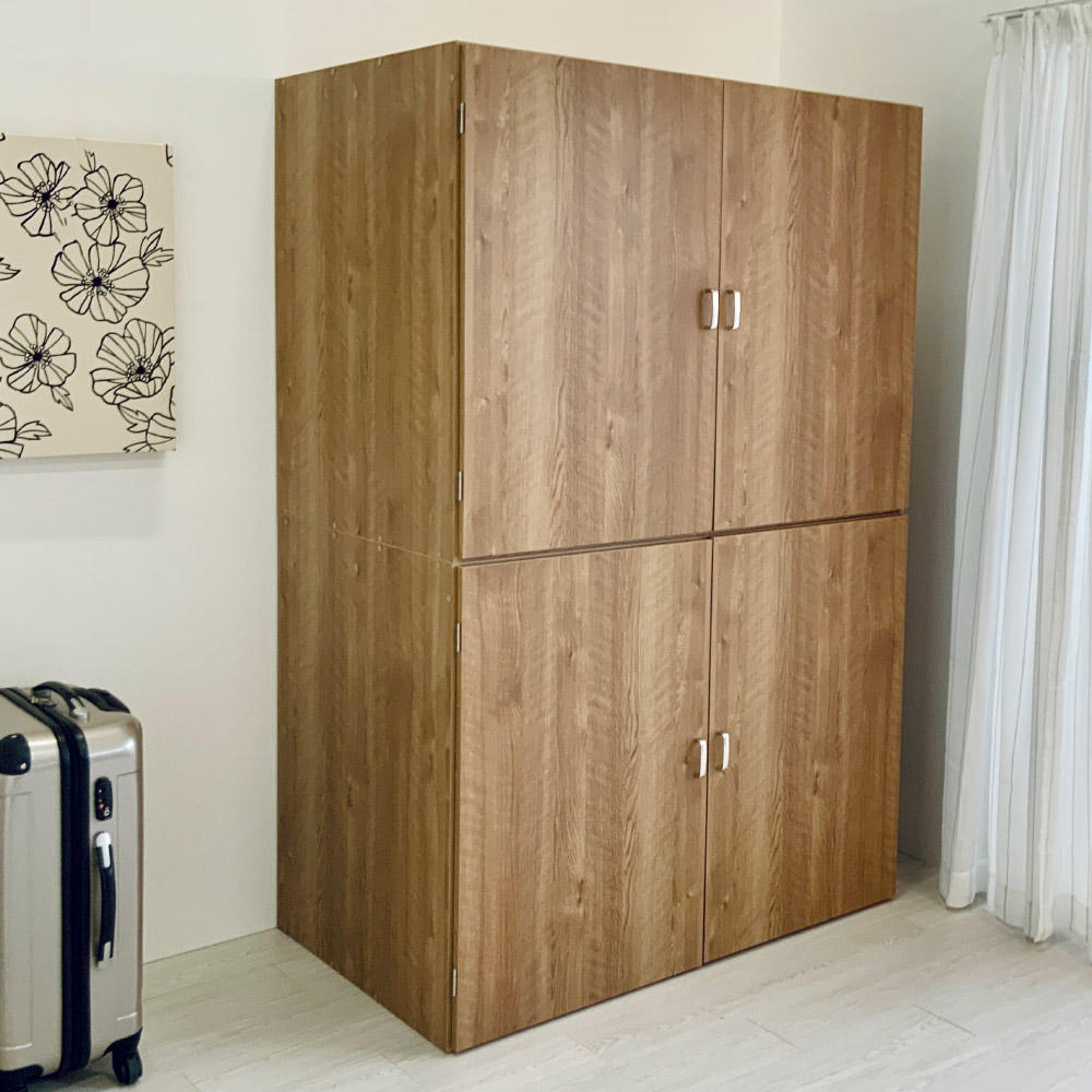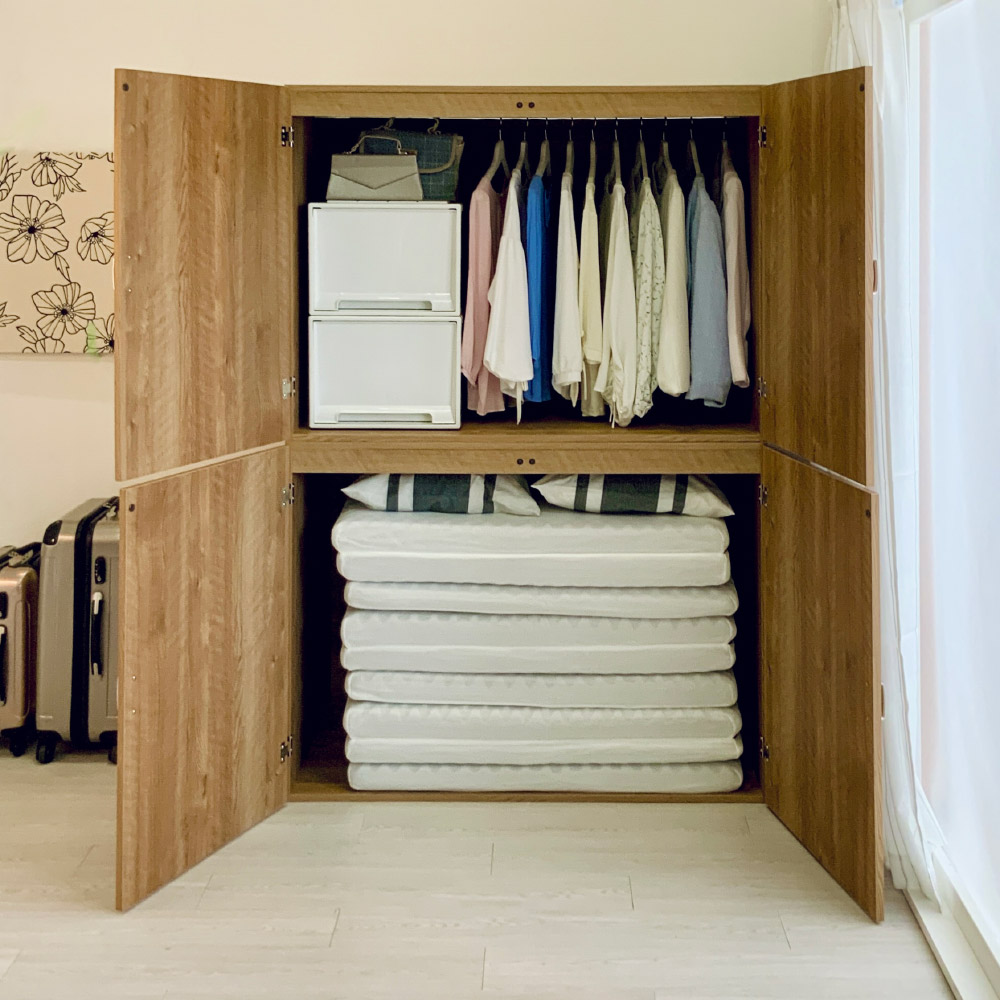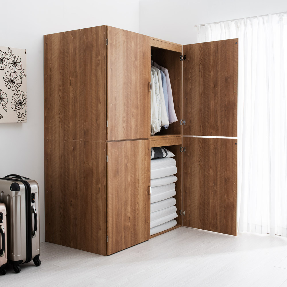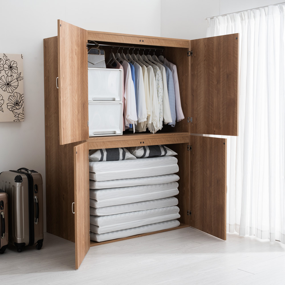片づく人気の大型収納がリニューアル。押入れ代わりになる収納たんすです。ご自宅の収納場所が足りないとお悩みの方におすすめ。寝具や季節家電、スーツケースなどの収納場所に。取り外し可能なハンガーバー付きでクローゼットハンガーとしても使えます。使用例(幅120cm お届け商品のサイズ)布団や家電が収納できる大型収納庫置き場所に困る布団、家電をまとめて収納できる、押入れ代わりになる収納タンスです。折り畳みマットレスや掃除機など収納しづらいものもラクに入ります。幅90cm、幅120cmの2タイプからお選びいただけます。※組立式の商品です。使用例(幅120cm)どんなお部屋にもなじむナチュラルなデザイン優しい天然木調の木目柄で、洋室にもなじむスッキリしたデザイン。納戸や寝室など、どんなお部屋にもピッタリです。空いたお部屋の収納スペースや、クローゼット収納としてもおすすめ。使用例(幅90cmタイプを横に並べて設置)横に並べるとロータイプの収納庫に!タンスの上下を分割して横に並べて使うことも可能。横に並べると、圧迫感のないロータイプのタンスとしても使えます。扇風機や加湿器など、季節ごとに使う家電や、スーツケースなど場所を取る物も一括収納できて、衣替えや模様替えもスムーズです。使用例(幅120cm)幅のある収納ケースなども入ります奥行たっぷりでマットレスも収納しやすい!有効奥行内寸は、66.5cm。お客様用の折り畳みマットレスや子供布団、座布団など大型アイテムもたっぷり収納できます。取り外し可能なハンガーバー付きハンガーバー2本付きで、クローゼットハンガーとして使えます。ハンガーバー下までの高さは約81cmあり、ジャケットやセーター、スカートも整頓しやすくなります。衣裳部屋にもおすすめ。取り外し可能なので、高さのある家電や掃除用具の収納もカンタン!タンス上下の連結は、ジョイントでしっかり固定転倒防止の金具付き壁面に付属の金具で固定し、転倒を防止できます。幅120cm・奥行71cm(扉を90度に開けた時…約130cm)・高さ180cm幅120cmタイプ扉は左右それぞれ外側に約215度まで開きます