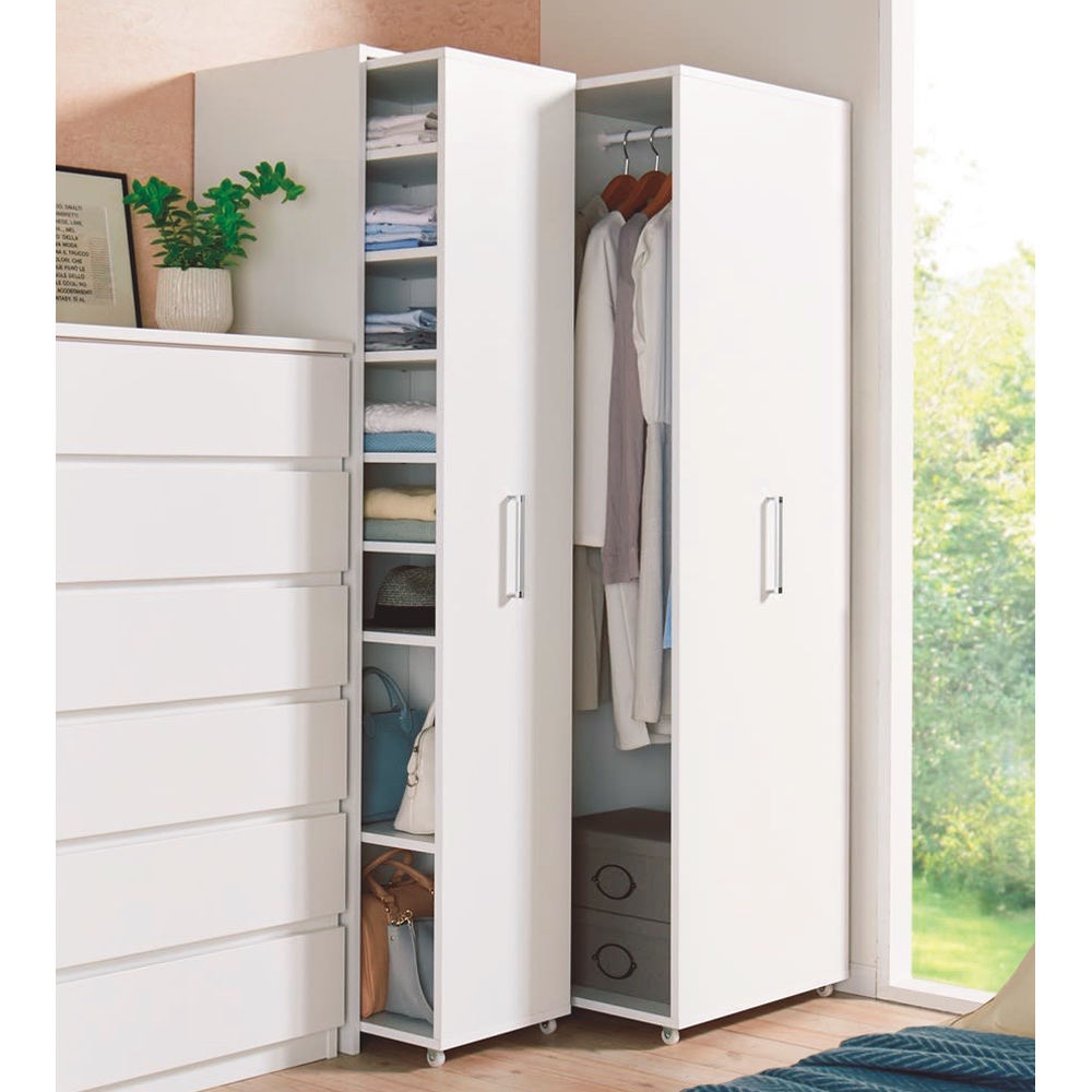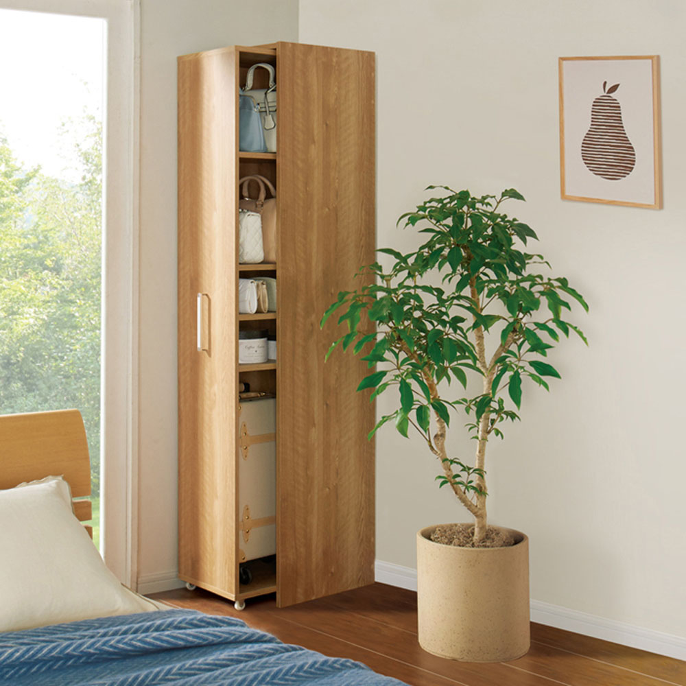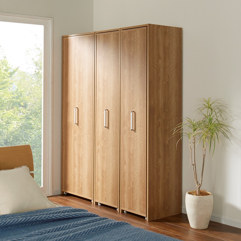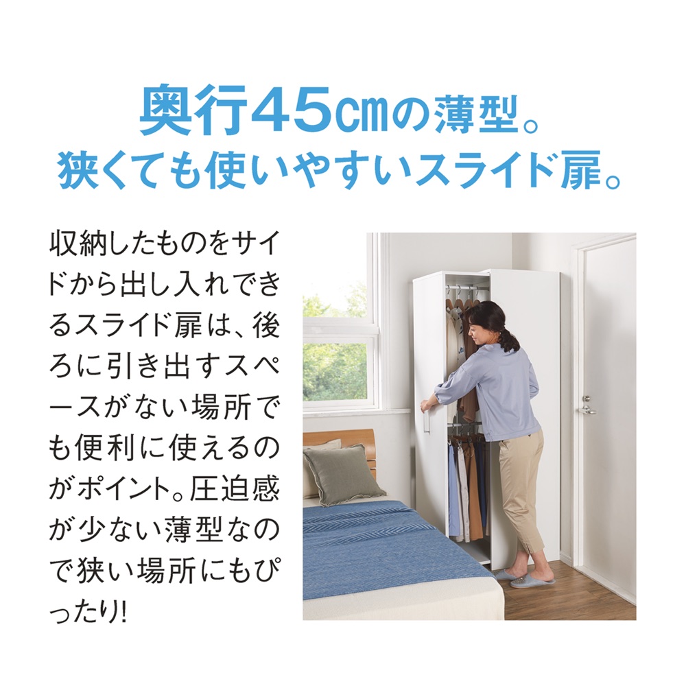 本商品は「薄型で隠せる収納 衣類収納ロッカー 棚タイプ」です。【スライド式ロッカータイプ】の国産衣類収納家具がついに登場!「一般的な扉の付いた衣類収納家具(奥行60cm前後)では部屋になかなか置けなくて困る」そんな方に向けて贈る奥行45cmでしっかり隠せる収納!コンパクトな設置はもちろん、しっかりとした収納力もウリです。 コーディネート例(左:ホワイト棚タイプ、右奥:ハンガータイプ)省スペースで使いやすい!スライド式の薄型衣類収納扉付きの衣類収納が欲しいけれど、スペースが限られている…。そんなお悩みに応える衣類収納ロッカーです。奥行45cmの薄型。スライド扉で使いやすく、隠して見た目もスッキリ。衣類に合わせ、シリーズ品のハンガータイプ(幅60cm)・こちらの棚タイプ(幅40cm)をお選びいただけます。ブラウン 棚タイプ(扉を引き出した状態)たたむ収納・小物収納に便利な棚タイプ幅40cmで、棚板9枚(固定棚1枚含む)の仕様。棚板8枚は、収納物の高さに応じて調節できます(固定棚を基準に、上と下でそれぞれ3cm間隔21段階の可動設置が可能)。棚板を取り外しての使用もOK。ブラウン 棚タイプシンプルなデザインとコンパクトなサイズ感取っ手は大きめのシルバーを採用。見た目が美しく、取っ手位置も計算しているため出し入れしやすく掴みやすいのもポイントです。 コーディネート例(左:ホワイト棚タイプ、右:ハンガータイプ)部屋に馴染みやすいホワイト・ブラウンの2色シンプルで清潔感ある印象のホワイト、ナチュラルな木目が美しい天然木調のブラウン。コーディネート例(左:ブラウンハンガータイプ、中央・右:棚タイプ)服を探すのもしまうのもラク引き出せば中身を全部見渡せるから、出し入れがラク。ハンガータイプ、棚タイプを組み合わせれば、部屋の一角をワードローブとして活用できます。コーディネート例(左:ブラウンハンガータイプ、中央・右:棚タイプ)奥行45cmだから見た目スッキリ扉を閉めておけば、圧迫感がなくスッキリとした印象です。収納物に合わせて調節可能な棚板たたんだ衣類がしっかり収まるサイズ感。洋服の落下がないよう、全面背板がついています。また、棚板の高さ調節・取り外しができ、背の高いカバンや小型ケース等の収納にも便利。ブラウン ハンガータイプ狭くても使いやすいスライド式の扉サイドから出し入れできるスライド扉は、後ろに引き出すスペースがない場所でも使いやすい。扉を引き出す方向は、置く場所に合わせて、左右どちらに引き出すか組立時に選べます。小型キャスター付きで出し入れスムーズ転倒防止の金具付き