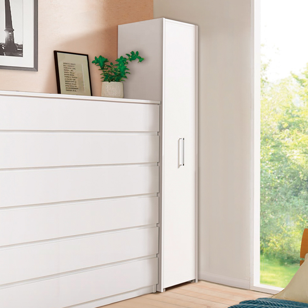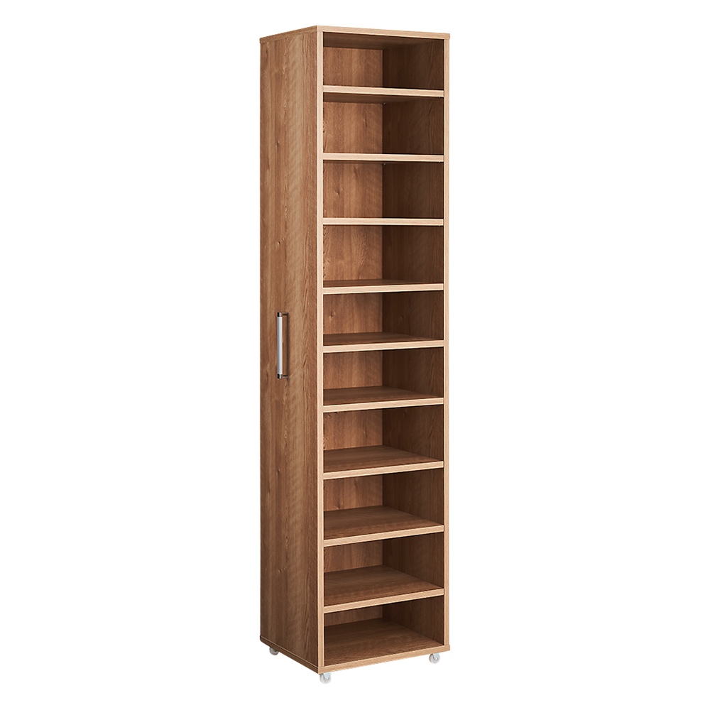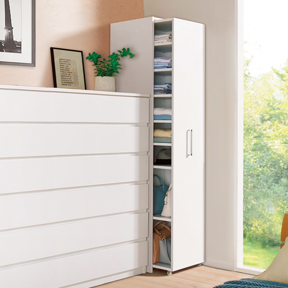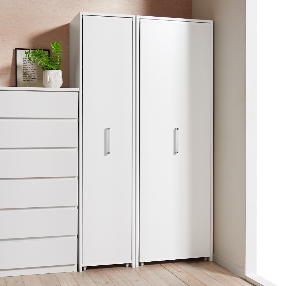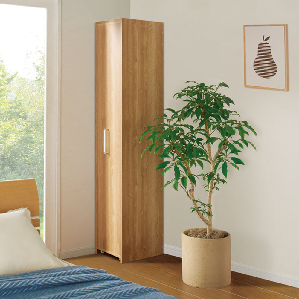 本商品は「薄型で隠せる収納 衣類収納ロッカー 棚タイプ」です。【スライド式ロッカータイプ】の国産衣類収納家具がついに登場!「一般的な扉の付いた衣類収納家具(奥行60cm前後)では部屋になかなか置けなくて困る」そんな方に向けて贈る奥行45cmでしっかり隠せる収納!コンパクトな設置はもちろん、しっかりとした収納力もウリです。 コーディネート例(左:ホワイト棚タイプ、右奥:ハンガータイプ)省スペースで使いやすい!スライド式の薄型衣類収納扉付きの衣類収納が欲しいけれど、スペースが限られている…。そんなお悩みに応える衣類収納ロッカーです。奥行45cmの薄型。スライド扉で使いやすく、隠して見た目もスッキリ。衣類に合わせ、シリーズ品のハンガータイプ(幅60cm)・こちらの棚タイプ(幅40cm)をお選びいただけます。ブラウン 棚タイプ(扉を引き出した状態)たたむ収納・小物収納に便利な棚タイプ幅40cmで、棚板9枚(固定棚1枚含む)の仕様。棚板8枚は、収納物の高さに応じて調節できます(固定棚を基準に、上と下でそれぞれ3cm間隔21段階の可動設置が可能)。棚板を取り外しての使用もOK。ブラウン 棚タイプシンプルなデザインとコンパクトなサイズ感取っ手は大きめのシルバーを採用。見た目が美しく、取っ手位置も計算しているため出し入れしやすく掴みやすいのもポイントです。 コーディネート例(左:ホワイト棚タイプ、右:ハンガータイプ)部屋に馴染みやすいホワイト・ブラウンの2色シンプルで清潔感ある印象のホワイト、ナチュラルな木目が美しい天然木調のブラウン。コーディネート例(左:ブラウンハンガータイプ、中央・右:棚タイプ)服を探すのもしまうのもラク引き出せば中身を全部見渡せるから、出し入れがラク。ハンガータイプ、棚タイプを組み合わせれば、部屋の一角をワードローブとして活用できます。コーディネート例(左:ブラウンハンガータイプ、中央・右:棚タイプ)奥行45cmだから見た目スッキリ扉を閉めておけば、圧迫感がなくスッキリとした印象です。収納物に合わせて調節可能な棚板たたんだ衣類がしっかり収まるサイズ感。洋服の落下がないよう、全面背板がついています。また、棚板の高さ調節・取り外しができ、背の高いカバンや小型ケース等の収納にも便利。ブラウン ハンガータイプ狭くても使いやすいスライド式の扉サイドから出し入れできるスライド扉は、後ろに引き出すスペースがない場所でも使いやすい。扉を引き出す方向は、置く場所に合わせて、左右どちらに引き出すか組立時に選べます。小型キャスター付きで出し入れスムーズ転倒防止の金具付き