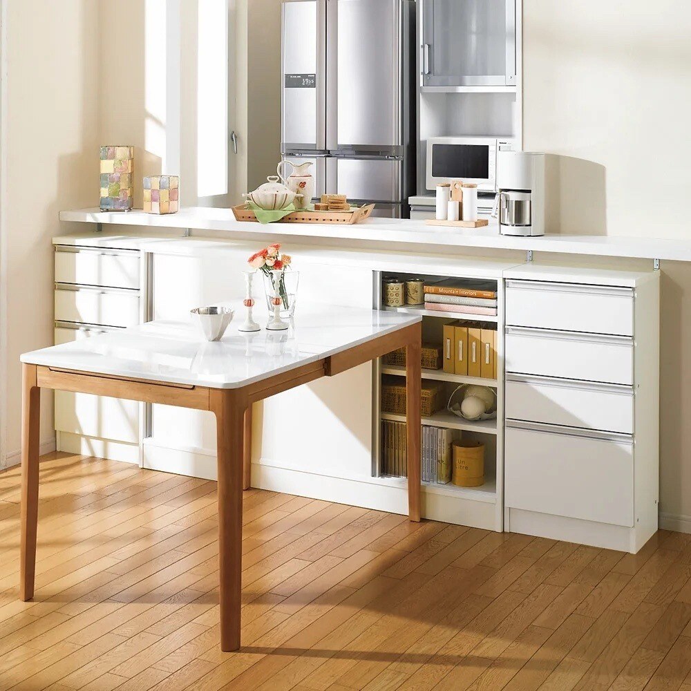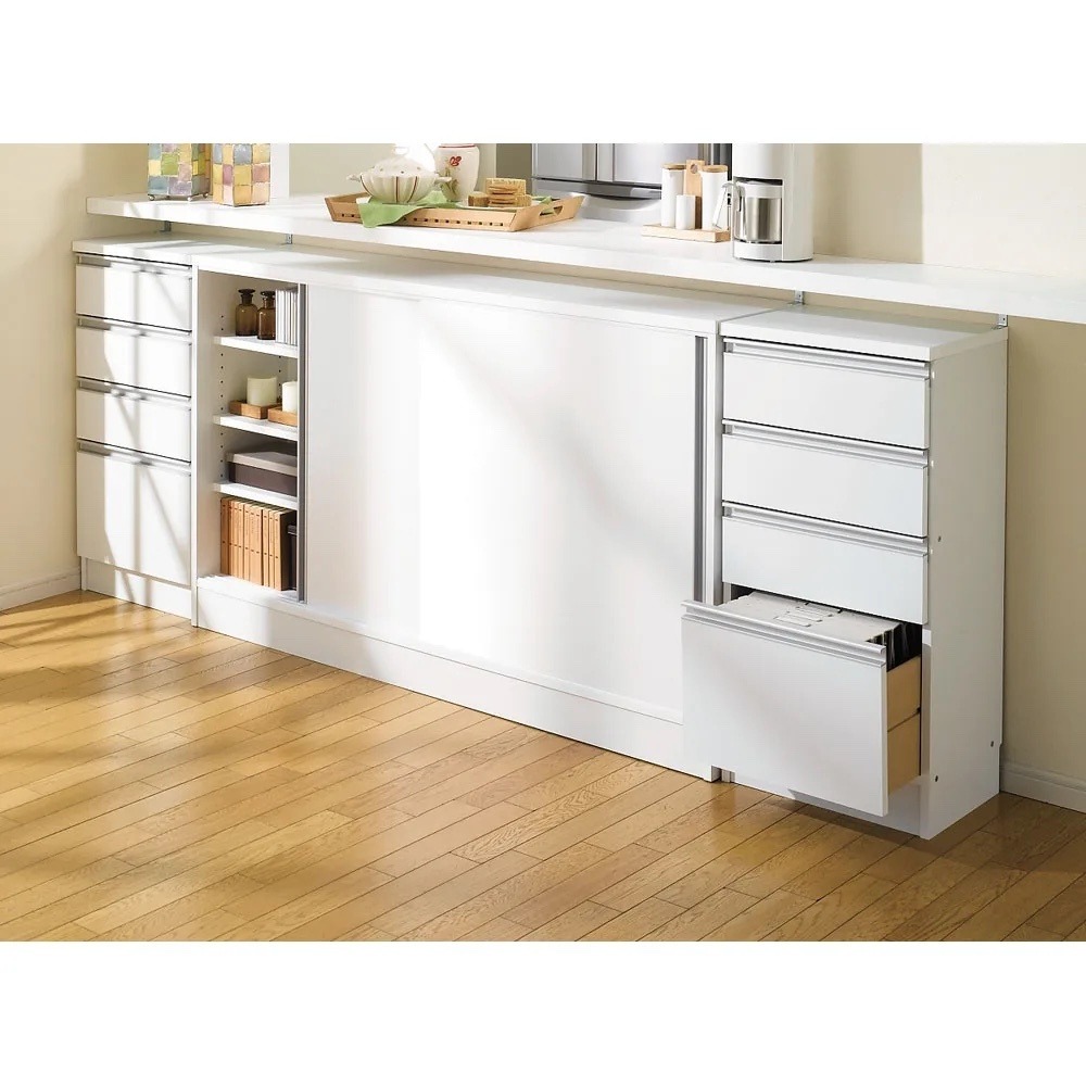 シリーズ商品組合せ例 ※写真左から別売りの引き戸タイプ幅150cm奥行30cm、引き出しタイプ幅45cm奥行30cm。