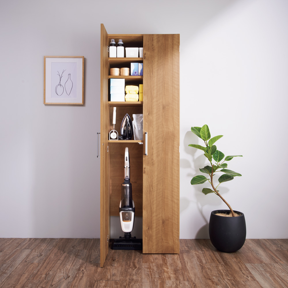 使用イメージ(ア)ブラウン 下段には高さがある掃除機やゴミ箱も入ります。 ※写真は別売りの幅60cmタイプです。