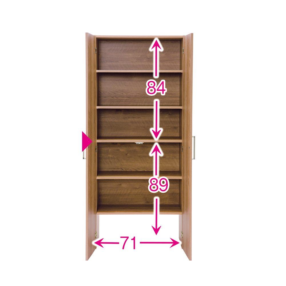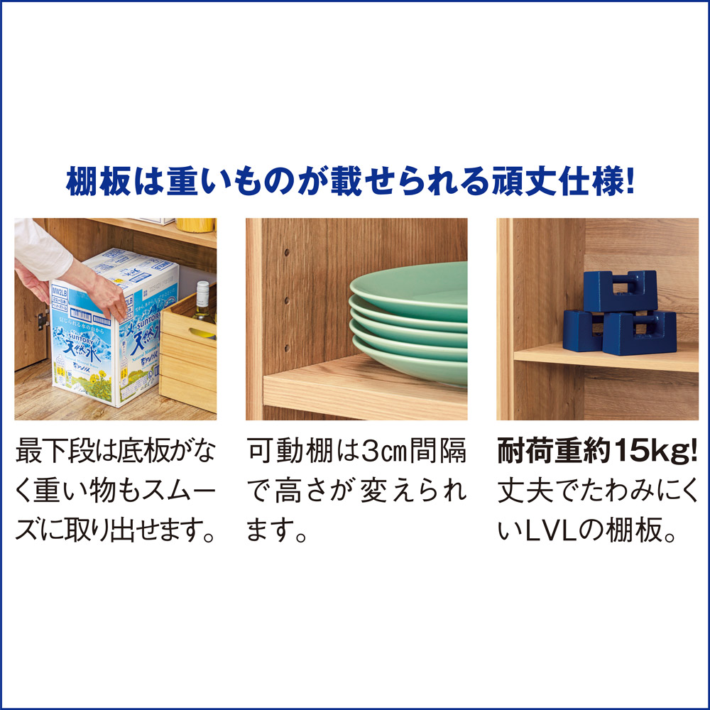 飲料ケースや大量の食器、食品ストックなどがぎっしり収まり、コスパも優秀な収納庫。底板がないため重い物、かさばる物が直置きできて、出し入れもラク!たっぷり入って家中で活躍する包容力抜群のパントリー●「買い置きしたものを収める場所がない」「ストック類が点在していてすっきり片付かない」とお悩みの方に役立つ大容量パントリーです。●自宅に造りつけの収納スペースがなく、なんとなくのラックでお茶を濁している…という状態の方にもおすすめ。●あちこちに置いていた物が一か所にまとめられて、家事動線が短縮できます。●扉付きなので、生活感あふれる物もすっきり隠せて見た目もスマート。●幅75cm奥行42cmでリビングやダイニングにも置きやすく、178cmの高さを活かして大量収納できるのが魅力。●扉は両開き。中身がひと目で把握でき、ストックの買い忘れや買い過ぎを防ぐメリットも。●キッチンでは、買い置きした調味料や食品ストック、ホットプレートやボウル等の調理器具、飲料ケースやお米など、さまざまな物が見やすくひとまとめにできます。●リビングでは、掃除機やお掃除用品、アイロン・ミシンなどの重い物、ティッシュケースやトイレットペーパーの予備など見せたくない物を目隠ししながらすぐ出せる場所に置けて便利です。書類やファイルボックスなど、テレワーク用品の収納にも。●洗面所では、洗剤ストック・タオル類、ドライヤーや美容家電、ハンガーやピンチといった洗濯用品、バケツや脱衣かごなどごちゃつきがちな物が整理できて、空間がすっきり片付きます。●玄関スペースが広い家なら、納戸使いも!ゴルフバッグやスケートボード、ボールやスキー靴、クーラーボックスなど玄関置きしたい物がたっぷり収まります。●床から89cmの高さに固定棚があり、計4枚の可動棚付き(固定棚の上にも下にも設定できます)。棚板は3cm間隔で高さ調節できるため、物のサイズに合わせて効率のよい収納が可能。ホットプレートや大皿等の薄い物も、背の高いボトル類も見やすく整理できます。下部はオープンスペースでフレキシブルに収納できる●固定棚より下は底板のないオープンスペース。重い物やかさばる物が持ち上げずに出し入れできます。●飲料ケース、ウォーターサーバーの予備、お米といった重い物はもちろん、新聞・雑誌・段ボールなどを回収日まで一時置きしたり、キャスター付きのスーツケースを入れたりと、直置きのメリットが最大限に生かせます。●キッチンのゴミ箱が通路を塞ぐなら、下部スペースを定位置に!89cmの高さがまるまる活かせるので、蓋の開閉もその場でできて、ゴミ捨てがスムーズ。●お子さまのおもちゃも背伸びしないで届く場所にあれば、「自分で出してお片付けまで」の習慣が生まれそう♪●下部オープンスペースにも可動棚を取り付けることができ、棚板は3cm間隔で高さ調節できます。丈夫でたわみにくいLVL棚板採用で、重い物もおまかせ!●「収納ラックに詰め込み過ぎて壊してしまった」という経験のある方も安心してお使いいただける頑丈仕様です。●棚板にはミルフィーユのような積層合板を、幾層にも重ねて耐荷重をアップしているLVLを採用。●合計5枚の棚板(固定棚1枚・可動棚4枚)に、たわみや歪みを気にせずガシガシ置けます。●固定棚の耐荷重は約15kg、可動棚1段当たりの耐荷重も約15kg!ぎっしり詰め込んでも安心です。どこに置いても絵になるルックスで長く使える●取っ手は高級感のあるアルミ製。見た目がスマートで、開閉時にも力が入れやすい縦長の形状です。●色は木目調で落ち着いた印象の(ア)ブラウンと、清潔感あふれる(イ)ホワイトをご用意。●キッチンだけでなく、リビングやダイニングルーム、洗面所や玄関に置いてもなじむデザインです。●頑丈仕様でビジュアルも素敵なパントリーなのに、価格は抑えめ。コストパフォーマンスのよさにもご注目ください!●狭めの場所にも置きやすい幅60cmタイプもあります。●丈夫で丁寧なつくりの日本製です。シリーズ商品のご案内総耐荷重約75kg!食器からストックまで入るキッチンパントリー収納庫は以下のシリーズ商品がございます。・幅60cm・幅75cm