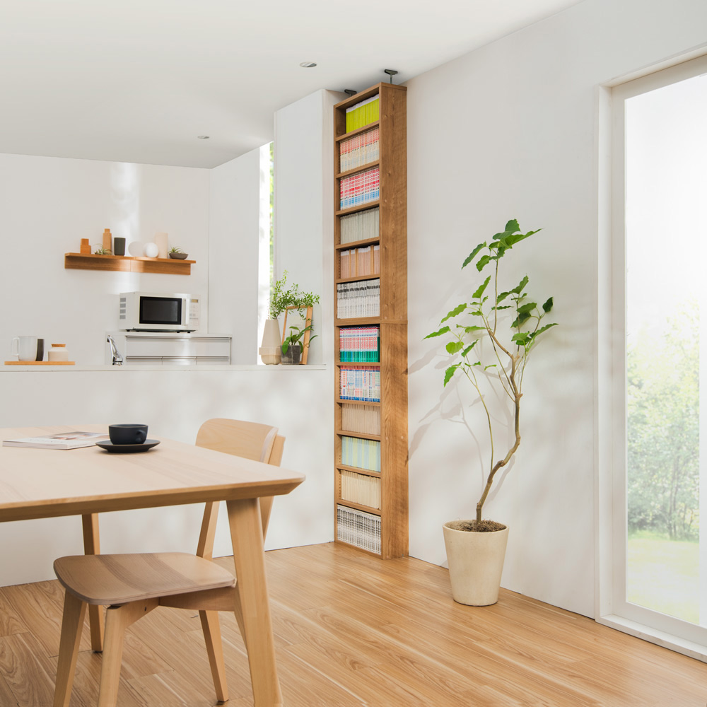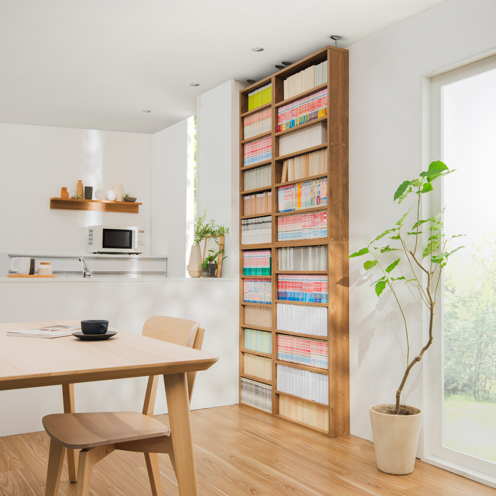 奥行15cmの超薄型、1.5cmピッチで細かく調節できる可動棚など、最小限のスペースで最大限効率よく収納するために設計された、薄型突っ張りコミックラックです。細かく調節できる可動棚でコミックの効率収納を極めた薄型本棚●奥行15cm、最小限の薄型で圧迫感を出さずにコミックを大量収納できます。●1.5cmピッチの棚板調整が可能で、判型の異なるコミックも効率的に収納できます。●天井まで有効活用できるハイタイプは、薄型でも安心の天井突っ張り式です。●国内でひとつひとつ丁寧に仕上げた日本製。安心して長くお使いいただけます。置き場所や使い方に合わせて、幅と高さ、カラーが選べます●高さは117cmのロータイプと234cmのハイタイプ、幅は45cmと60cmの計4タイプをご用意しました。(このページはハイタイプ幅45cmの販売ページです)●ロータイプはリビングの窓下やベッドサイドなど、ちょっとしたスペースにもスッキリ収まります。●ハイタイプをコミックで埋め尽くしても、薄型なので圧迫感がありません。●インテリアに合わせて、優しい風合いの(ア)ホワイトと、落ち着いた印象の(イ)ブラウンが選べます。コミックの収納問題を、壁に溶け込むようなスマート本棚で一気に解決●奥行15cmの薄型なので、玄関や廊下、階段の踊り場でも邪魔になりません。●段ボールにしまい込んでいたお気に入りのコミックも、全部並べられます。●コツコツ集めたコミックコレクションをひと目で見渡せる、憧れのお部屋も実現します。