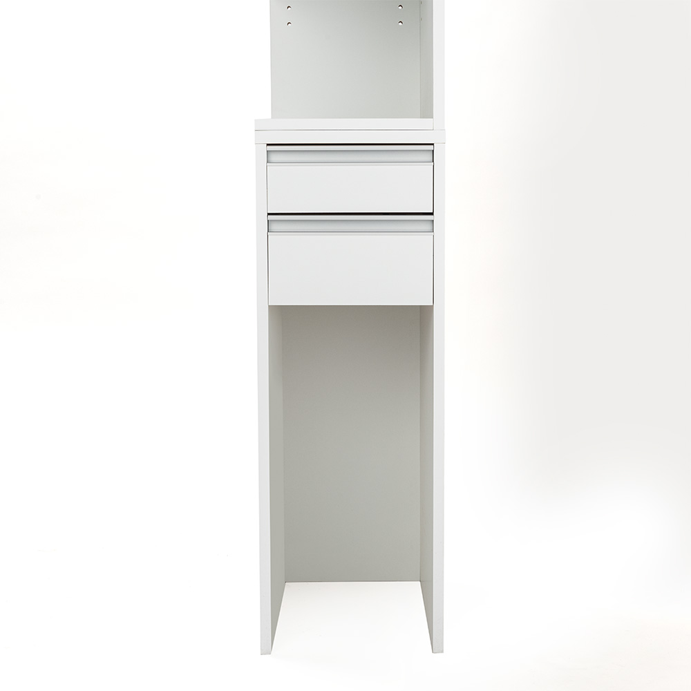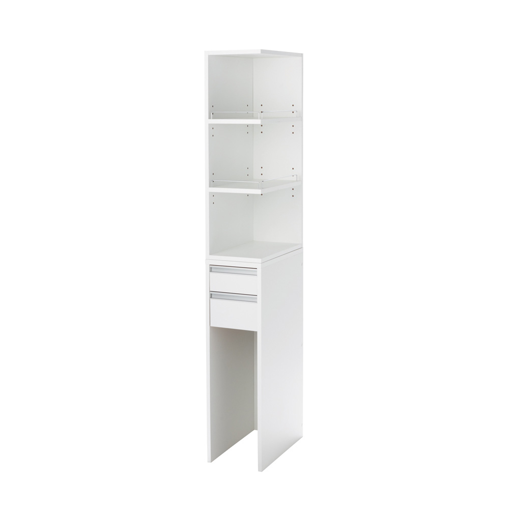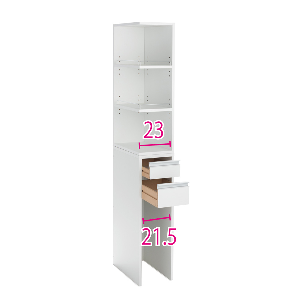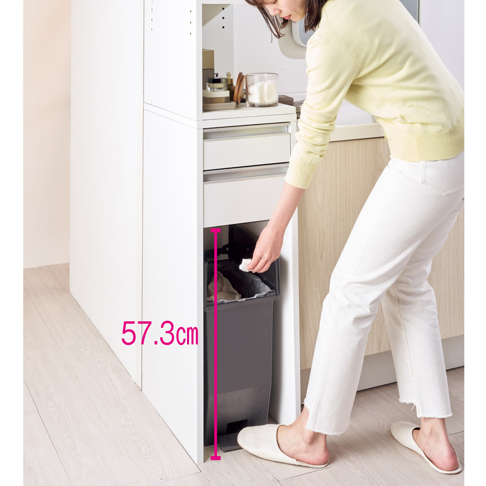 コスメ収納からゴミ箱まで、洗面の“ほしい”を1カ所に。棚板部分は前面とサイドが開いた2面オープン仕様で、洗面台の前に立ったままスキンケア用品などの出し入れが簡単。底板がないので下部にゴミ箱を置けて、洗面で出たゴミもさっと捨てられます。洗面所でスキンケアやメイクをする方にうれしい機能を、スリムに集約●洗顔後、洗面所でそのままスキンケアやメイクをしたい方におすすめの収納庫です。●狭い洗面所でも場所をとらず、すき間に収まる幅20cm、幅25cm、幅30cmの3タイプをご用意。●見た目はスリムでも奥行が44.5cmあるので、かさばるメイク落としシートのケースやドライヤーなどの美容家電までたっぷり収納できます。●忙しい朝や少しでも早く寝たい夜も、ここだけでスキンケアやメイクが全て完結できるので時短に!スキンケア用品やコスメの収納、作業スペース、ゴミ捨てを1台で●洗面台に置ききれない化粧水などのボトルやメイク用品も、棚と引き出しにすっきり収納。●中天板はメイクブラシやスタイリング剤なども気軽に置けて、作業台としても活躍します。●下部のオープンスペースにはゴミ箱が置けるので、途中で出たゴミもさっと捨てられて便利。●家族が置きっぱなしにしたゴミや落ちた髪の毛などを拾って、いちいち捨てに行くストレスも解消します。サイドからも物を出し入れしやすい2面オープン棚が便利●上段には可動棚板2枚付き。3cm間隔で5段階に高さ調節できるので、背の高いボトルも置けます。●棚板は2方向から物が出し入れできる仕様。必要な物がひと目で見つかり、探す手間いらず。●前面とサイドに小物の落下を防ぐこぼれ止め付き。こぼれ止めを外して棚板をフルで使うことも可能。●上段オープン部は組立時に、左右どちら向きにも設定できます。細部まで使いやすさの工夫をプラス●本体には傷や汚れに強い素材を使用し、お手入れが簡単です。●引き出しはスムーズに開閉するスライドレール付き。(ストッパーはついていません)●下段の引き出しを外せば、下部のオープンスペースに背の高いゴミ箱も置けます。●側面は裏側もお手入れ簡単な化粧仕上げ。見えても美しいので、いろいろなシーンにマッチ。洗面所以外でも使えるので、生活環境が変わってもずっと活躍!●転勤やお子さまの巣立ちなど、暮らしに変化はつきもの。●引っ越しや模様替えで置けなくなった家具も、別の場所で便利に役立てば長く愛用できます。●アイデア満載のディノス家具なら費用のかさむ造り付け家具やリフォームなしでも、すっきり片付く快適な空間づくりをお楽しみいただけます。■たとえば、こんな場所でも■●洗濯機の横に置いて、洗剤や洗濯小物、詰め替えレフィルの収納や脱衣カゴの置き場に。●キッチンのすき間に置いてスパイスやカトラリーを収納、下部は重量のある水やお米の床置きにも。●お部屋のドレッサーの横にサブ収納として。ディスプレイ感覚でボトルを飾っても素敵。●上下を分割して横並びでも置けるので、ロータイプの収納として使うことも可能です。信頼と安心の国内工場での生産品です●国内の工場で1台ずつ丁寧に仕上げた安心の日本製。●細部の丁寧な仕上がりなど、品質の高さは国産品ならではです。●毎日過ごす場所にはストレスなく使えるものを、とお考えの方におすすめの収納家具です。シリーズ商品のご案内ゴミ箱がしまえるオープンすき間収納庫は以下のシリーズ商品がございます。※このページは幅25cmタイプの販売ページです。・幅20cm・幅25cm・幅30cm