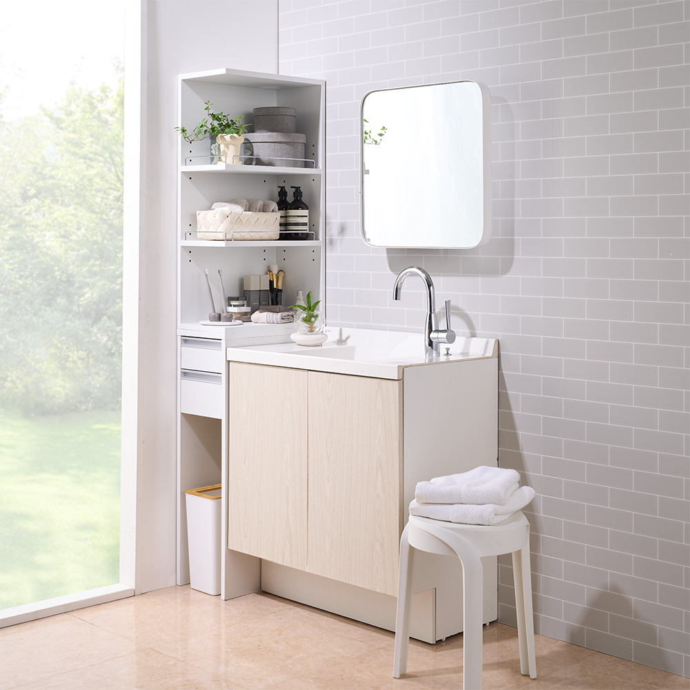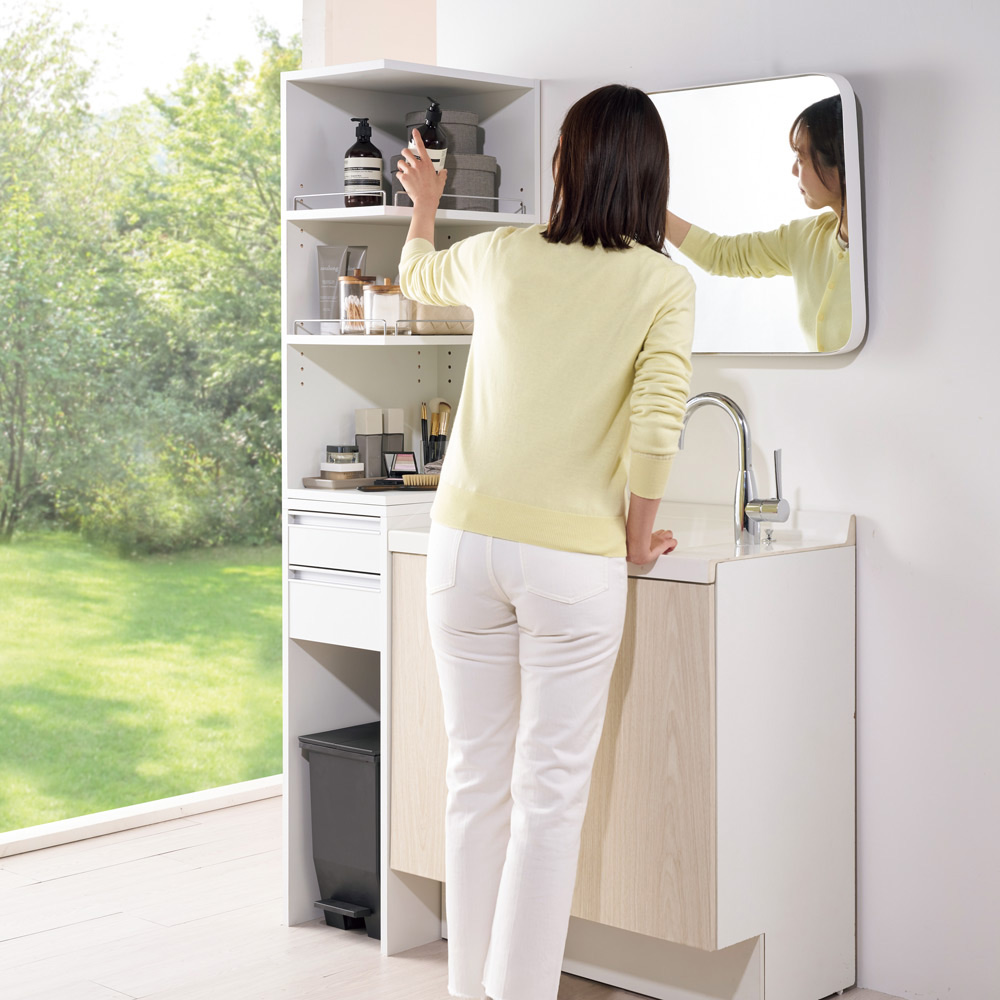 使用イメージ 洗面でメイク、スキンケアをした後、その場でゴミを捨てられます。底板がないのでゴミ箱も置けます。 ※写真は別売りの幅30cmタイプです。