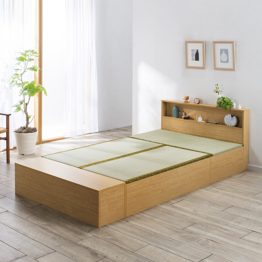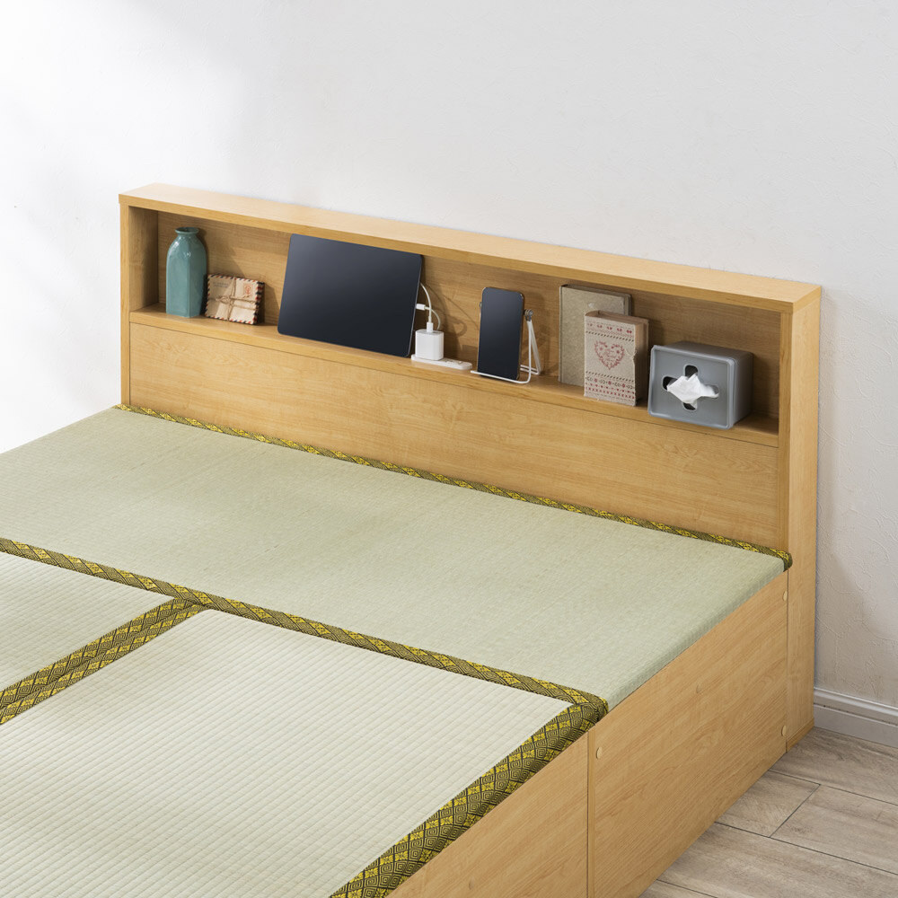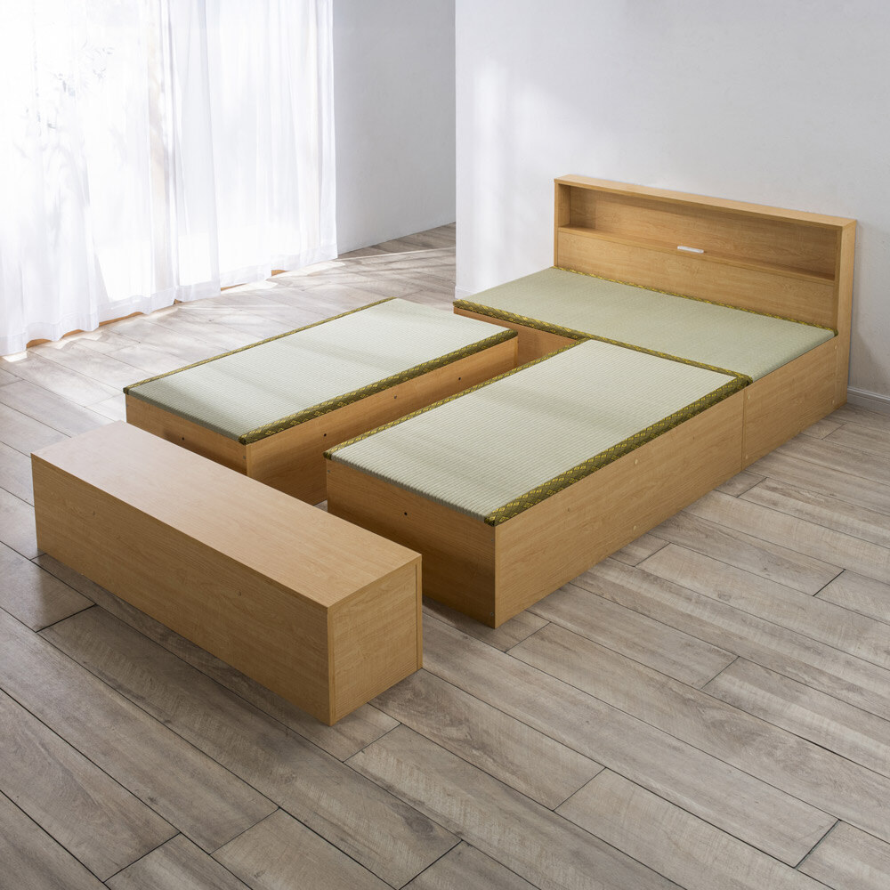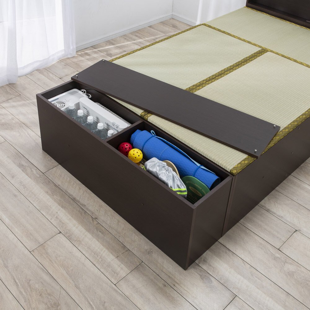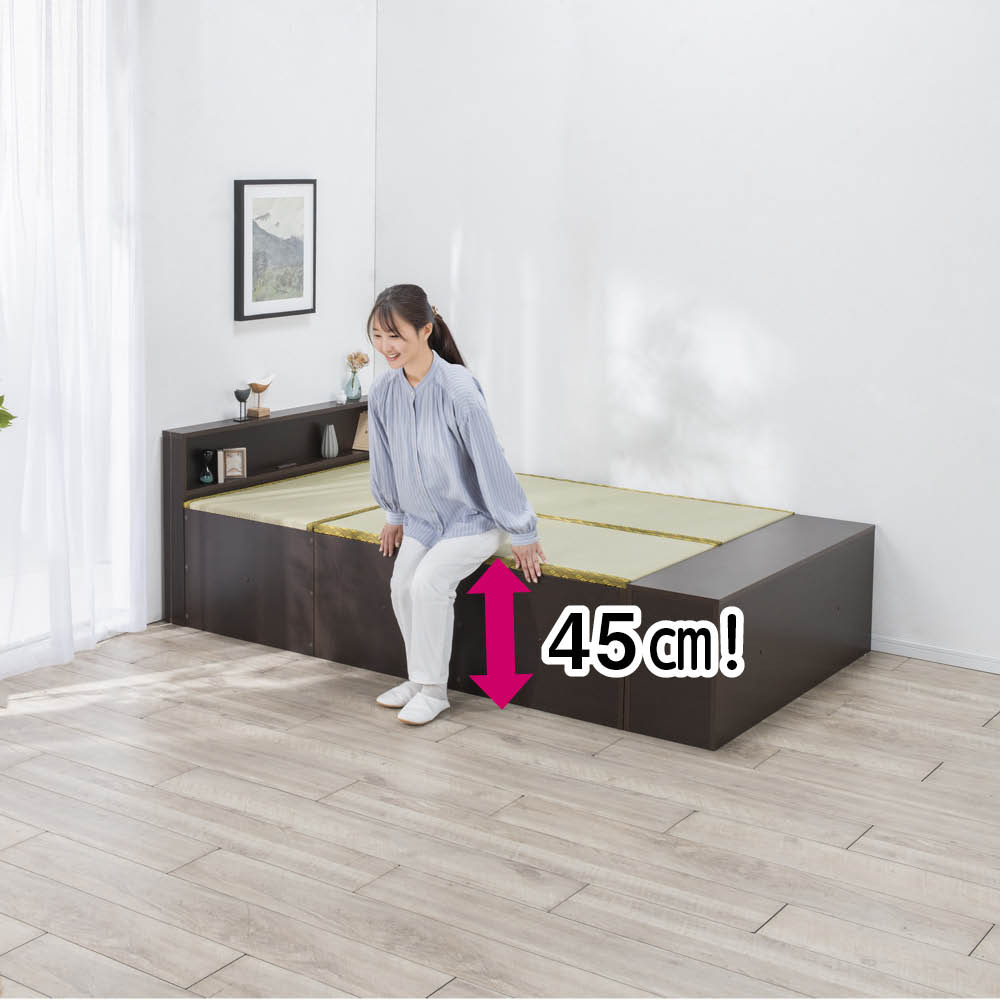 爽やかない草の香りに包まれて眠る、あの懐かしいやすらぎ感を、お部屋のリフォームなしで楽しめる畳ベッドです。立ち座りしやすい高さ45cm。内側は、なんと900Lという驚くほど大容量の収納庫で、たっぷり物をしまえます。5つのユニットに分割もできるので、畳ベンチやリビングの小上がりなどとしても。ナチュラル ※写真は別売りの高さ31cmタイプ「やすらぎ」と「収納」の1台2役で、洋室でも和のくつろぎを洋室にも、手軽に和室のようなくつろぎ空間が誕生する畳ベッド。近頃は和室のないご家庭も増えていますが、これなら設置するだけ。内部は収納庫なので、収納場所不足のお宅にもうれしい仕様です。お家をすっきりさせながら、畳の懐かしいやすらぎ感に心を癒されてみてはいかがでしょうか。ナチュラル ※写真は別売りの高さ31cmタイプ畳の下に物をたっぷり入れられて、出し入れも簡単ボックス状の本体に畳張りのふたをのせた仕様なので、開け閉めも、物の出し入れも簡単。中に入っている物がひと目でわかり、迷子を防げます。ダークブラウン驚くほどに大容量!! こんなにたくさん入っちゃう!?高さ31cmタイプには約590L、別売りの高さ45cmタイプにはなんと約900Lもの収納スペースがあり、写真右の収納物が実際にすべて収まります(かさ上げはしていません)。フットボードまで収納庫というムダのない仕様で、置き場所に困るアイテムをまとめて収納できます。“隠す収納”で散らかっていたお部屋もすっきりすること間違いなし!! ※構造上、仕切りは取り外せません。ナチュラル ※写真は別売りの高さ31cmタイプ布団派の方も自然にベッド生活になじめます床面高さ31cmという安心感のある高さで、落ち着いて眠れます。使い慣れた布団がそのまま使えるのも、うれしいポイントです。い草の清々しい香りで、お部屋の空気も爽やかに香りがもたらすリラックス効果や自然な調湿性も、い草の魅力。い草の下にウレタンパッドを重ねてあるので肌あたりがよく、ごろ寝も快適です。ナチュラル5つのユニットは組替え自由で、いろいろな使い方が可能3つの畳ユニットとヘッドボード、フットボードを合わせた5ユニット構造。別の部屋で使いたいときも、分割すればドアを楽に通れます。連結する際はジョイントボルトでしっかり固定して、一体化できるので安心。ダークブラウンフットボード+畳ユニットで、小さな和の癒しコーナーをベッドを使わなくなっても、ユニットに分けてお家の複数の場所で使うことも可能。窓辺にベンチとして置いたり、リビングに小上がりをつくってお昼寝したり。ヘッドボードは小物が置ける飾り棚、フットボードはローテーブル風の使い方も。暮らし方の変化に対応でき、長くご愛用いただけます。細部まで丁寧なつくりは、職人が1点1点仕上げた日本製ならではヘッドボードの棚板は、眼鏡やティッシュボックスなどちょっとしたものが置けて便利。コンセントもついているのでスマートフォンの充電もOK。写真上:ナチュラル 写真下:ダークブラウン明るい雰囲気のナチュラル、落ち着きあるブラウンの2カラーシンプルなデザインで和風になりすぎない、和モダンなおしゃれ感も魅力のひとつ。お部屋に違和感なくとけこみ、はじめからそこにあったかのようになじんでくれます。