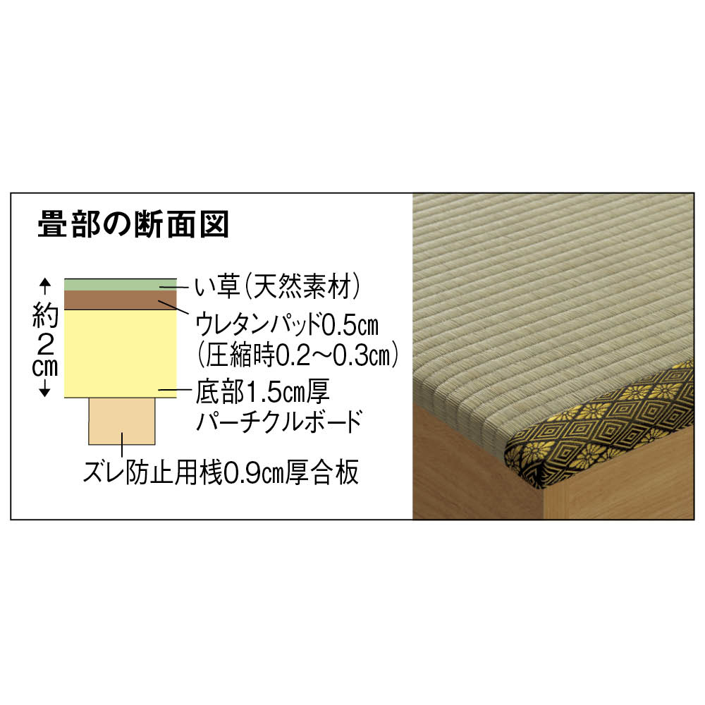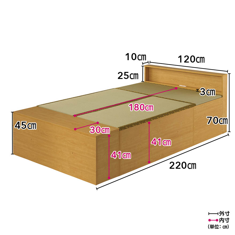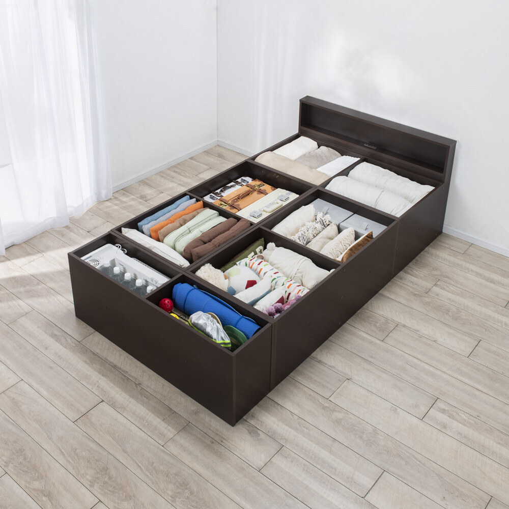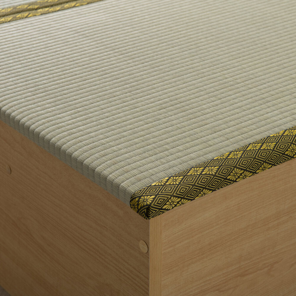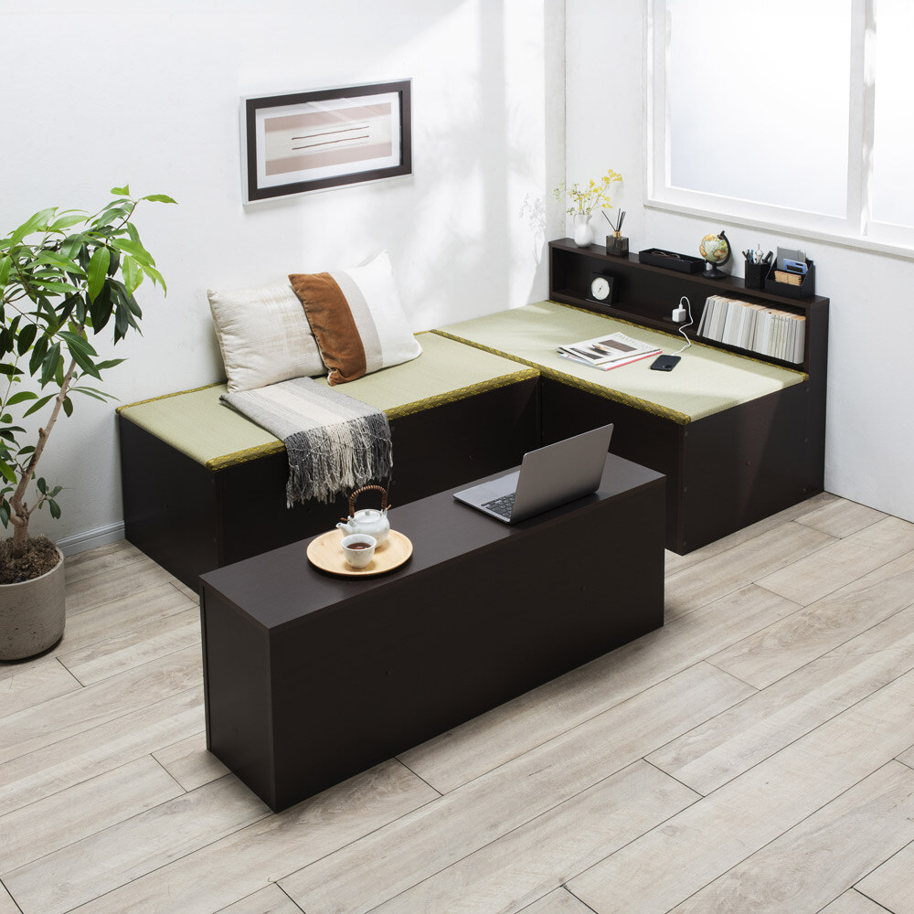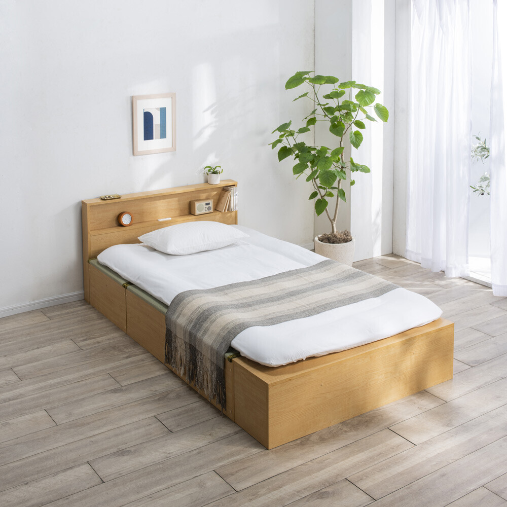 爽やかない草の香りに包まれて眠る、あの懐かしいやすらぎ感を、お部屋のリフォームなしで楽しめる畳ベッドです。立ち座りしやすい高さ45cm。内側は、なんと900Lという驚くほど大容量の収納庫で、たっぷり物をしまえます。5つのユニットに分割もできるので、畳ベンチやリビングの小上がりなどとしても。ナチュラル ※写真は別売りの高さ31cmタイプ「やすらぎ」と「収納」の1台2役で、洋室でも和のくつろぎを洋室にも、手軽に和室のようなくつろぎ空間が誕生する畳ベッド。近頃は和室のないご家庭も増えていますが、これなら設置するだけ。内部は収納庫なので、収納場所不足のお宅にもうれしい仕様です。お家をすっきりさせながら、畳の懐かしいやすらぎ感に心を癒されてみてはいかがでしょうか。ナチュラル ※写真は別売りの高さ31cmタイプ畳の下に物をたっぷり入れられて、出し入れも簡単ボックス状の本体に畳張りのふたをのせた仕様なので、開け閉めも、物の出し入れも簡単。中に入っている物がひと目でわかり、迷子を防げます。ダークブラウン驚くほどに大容量!! こんなにたくさん入っちゃう!?高さ31cmタイプには約590L、別売りの高さ45cmタイプにはなんと約900Lもの収納スペースがあり、写真右の収納物が実際にすべて収まります(かさ上げはしていません)。フットボードまで収納庫というムダのない仕様で、置き場所に困るアイテムをまとめて収納できます。“隠す収納”で散らかっていたお部屋もすっきりすること間違いなし!! ※構造上、仕切りは取り外せません。ナチュラル ※写真は別売りの高さ31cmタイプ布団派の方も自然にベッド生活になじめます床面高さ31cmという安心感のある高さで、落ち着いて眠れます。使い慣れた布団がそのまま使えるのも、うれしいポイントです。い草の清々しい香りで、お部屋の空気も爽やかに香りがもたらすリラックス効果や自然な調湿性も、い草の魅力。い草の下にウレタンパッドを重ねてあるので肌あたりがよく、ごろ寝も快適です。ナチュラル5つのユニットは組替え自由で、いろいろな使い方が可能3つの畳ユニットとヘッドボード、フットボードを合わせた5ユニット構造。別の部屋で使いたいときも、分割すればドアを楽に通れます。連結する際はジョイントボルトでしっかり固定して、一体化できるので安心。ダークブラウンフットボード+畳ユニットで、小さな和の癒しコーナーをベッドを使わなくなっても、ユニットに分けてお家の複数の場所で使うことも可能。窓辺にベンチとして置いたり、リビングに小上がりをつくってお昼寝したり。ヘッドボードは小物が置ける飾り棚、フットボードはローテーブル風の使い方も。暮らし方の変化に対応でき、長くご愛用いただけます。細部まで丁寧なつくりは、職人が1点1点仕上げた日本製ならではヘッドボードの棚板は、眼鏡やティッシュボックスなどちょっとしたものが置けて便利。コンセントもついているのでスマートフォンの充電もOK。写真上:ナチュラル 写真下:ダークブラウン明るい雰囲気のナチュラル、落ち着きあるブラウンの2カラーシンプルなデザインで和風になりすぎない、和モダンなおしゃれ感も魅力のひとつ。お部屋に違和感なくとけこみ、はじめからそこにあったかのようになじんでくれます。