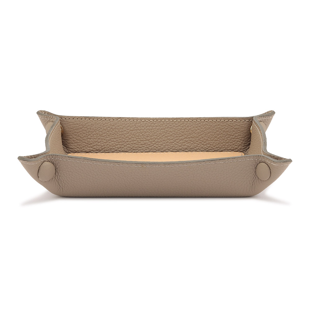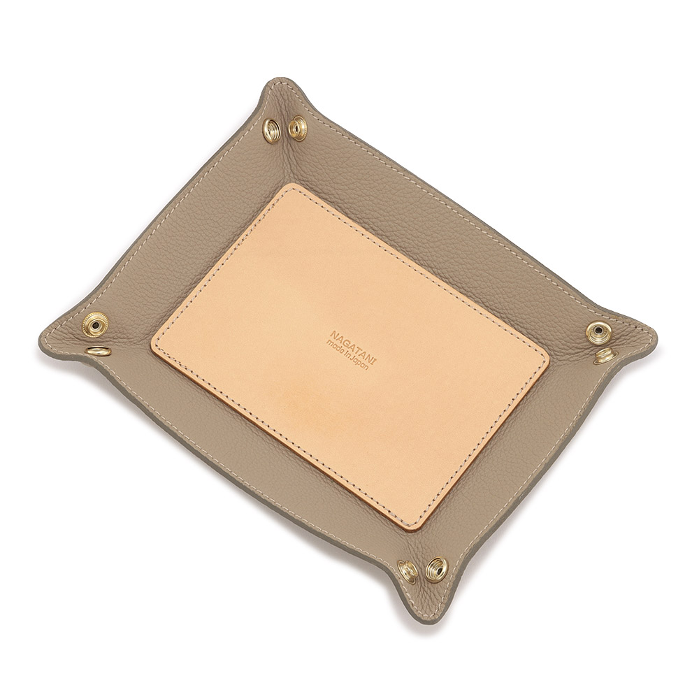Nagatani スモールレザーグッズ誠実さと確かな技術で信頼を集める日本の名匠「 ナガタニ」。一流メゾンも惚れこむドイツの老舗タンナー製レザーの革小物は、大切な人へのギフトにも。キップシュリンクレザーの手触り、品格美を手近にドイツ「ウェインハイマー」社の希少なキップシュリンクレザー「エスポワール」。ふっくらとソフトな手触り、傷が目立ちにくく、美しい細かなシボが特徴です。四隅のボタンを外すとフラットになるトレー。内底にはヌメ革を使用して美しさとリッチ感をプラス。旅行先での小物整理にも便利。
