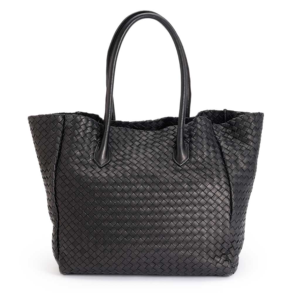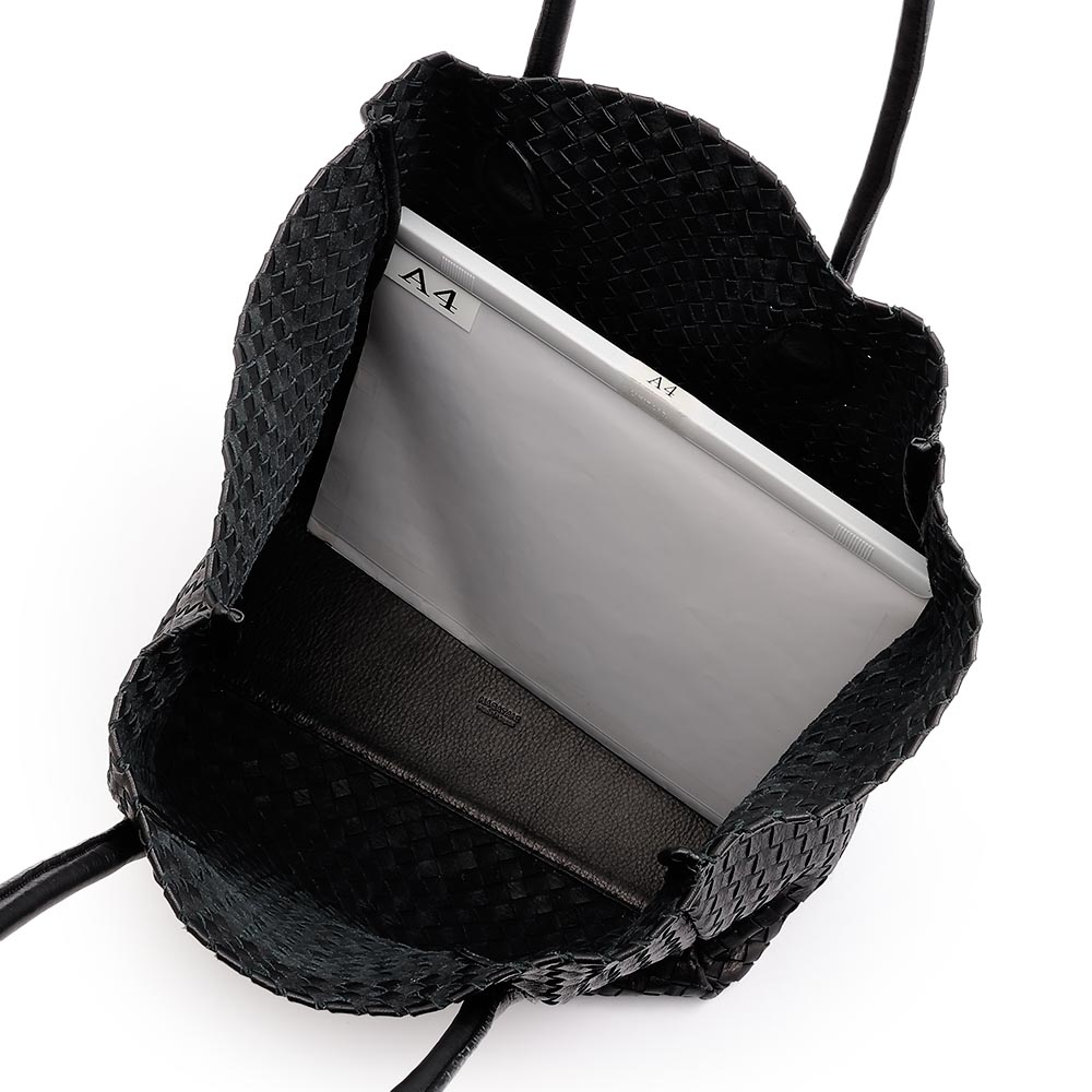 佇まいを整える上質雑貨品格あるデザインに軽やかな清涼感を添えて凛とした優美さだけでなく、最新のトレンドと機能性もブラッシュアップ。麗しの小物で、サマー・コーディネートの総仕上げを。鞣し、裁断、差し編みと日本の技術の粋を尽くして日本製の薄く丈夫な衣料用レザーを丹念に編み込んだビッグトート。口元の折り返しや裏地のない仕様は丁寧で美しく、大容量の本革バッグとは思えない軽さです。肩当たり、手馴染みの良い丸手仕様のロングハンドルは、荷物の多い日も快適。