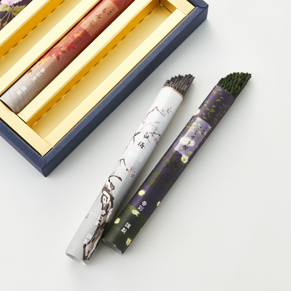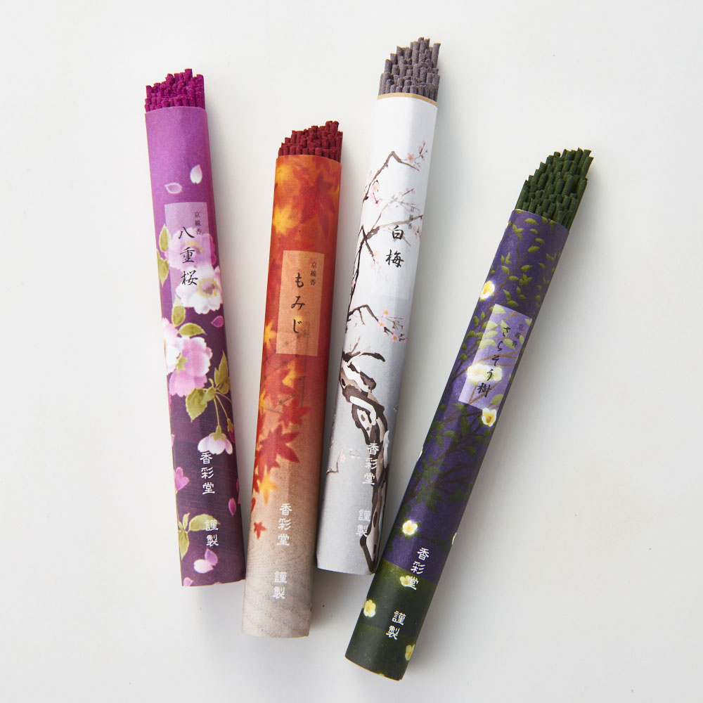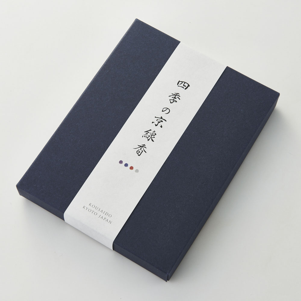 京都の「香」専門店「香彩堂」から、伝統の香りを現代にアレンジした、ご進物に人気の四季をテーマとした香り4種をお気軽に楽しめる詰め合わせをお届け致します。テーマ毎に4種の香りをご用意[八重桜]美しく咲き誇る八重桜をイメージして原料にこだわって調合しました。香り高く上質な煙の少ない京線香です。[さらそう樹]夜のとばりに静かに佇む沙羅双樹をイメージして原料にこだわって調合しました。香り高く爽やかな煙の少ない京線香です。[もみじ]深まる秋の色づく紅葉をイメージして原料にこだわって調合しました。香り高く繊細な煙の少ない京線香です。[白梅]雪景色に凛とした彩りを添える白梅をイメージして原料にこだわって調合しました。香り高く気品溢れる煙の少ない京線香です。四季のお線香は、従来、相反する要素である「香り立ち」と「煙の少なさ」の両方を目指し研究を重ね開発されました。拘り抜いた原料を独自の製法で調合した煙の少ないお線香です。お仏前用としてもお部屋用としてもご使用頂けます。【香彩堂】京都の烏丸通仏光寺に本店を構える「香」専門店の「香彩堂」。「香彩堂」では、伝統的な香りを継承し追及する一方で、京都らしく斬新な「和のお香」と、ハーブを使用して心身を癒すアロマテラピーの考え方に基づいた「洋のイノセンス」の両方を取り揃えています。