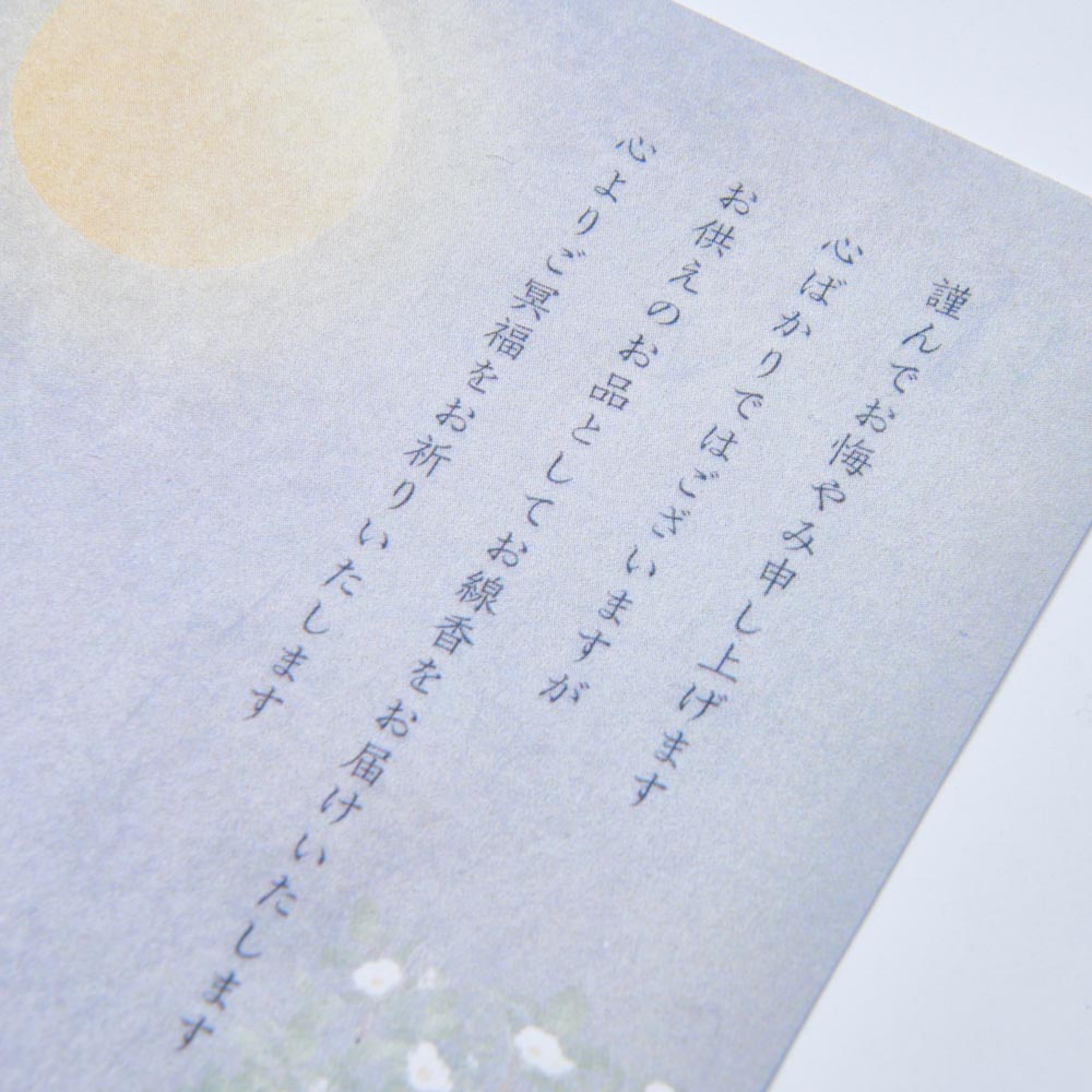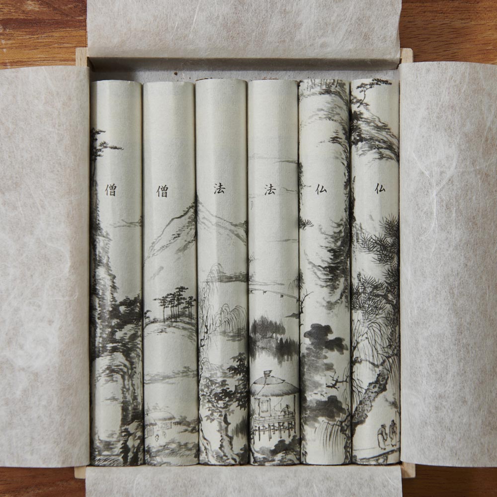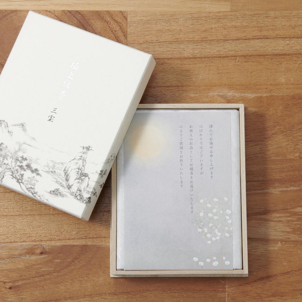 京都の「香」専門店「香彩堂」から、伝統の香りを現代にアレンジした、ご進物に大変お勧めの逸品『極上線香』4種詰め合わせです。喪中ハガキをいただいた際の「御供」にふさわしいご挨拶文入り。極上線香3種の香りの詰め合わせです。3種(仏、法、僧)各3束ずつ入っておりそれぞれ品位ある香りが漂います。●仏…白檀、安息香、柑橘などの香りを調合した、ほのかに甘く落ち着いた香り。●法…白檀、松葉、杉などの香りを調合した、透明感のある森林浴の香り。●僧…白檀、紅梅、鈴蘭などの香りを調合した、春の訪れを告げる花の香り。極上線香は、拘り抜いた原料を独自の製法で調合した香り高いお線香です。京都の烏丸通仏光寺に本店を構える「香」専門店の「香彩堂」。「香彩堂」では、伝統的な香りを継承し追及する一方で、京都らしく斬新な「和のお香」と、ハーブを使用して心身を癒すアロマテラピーの考え方に基づいた「洋のイノセンス」の両方を取り揃えています喪中ハガキをいただいた時に「御供」としてお送りする際にふさわしいご挨拶文入りです。
