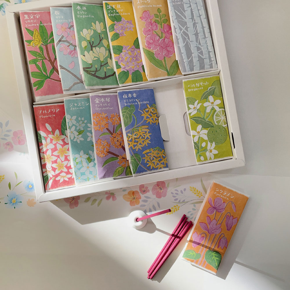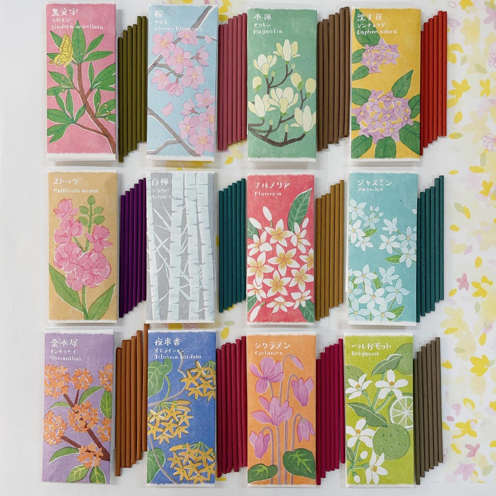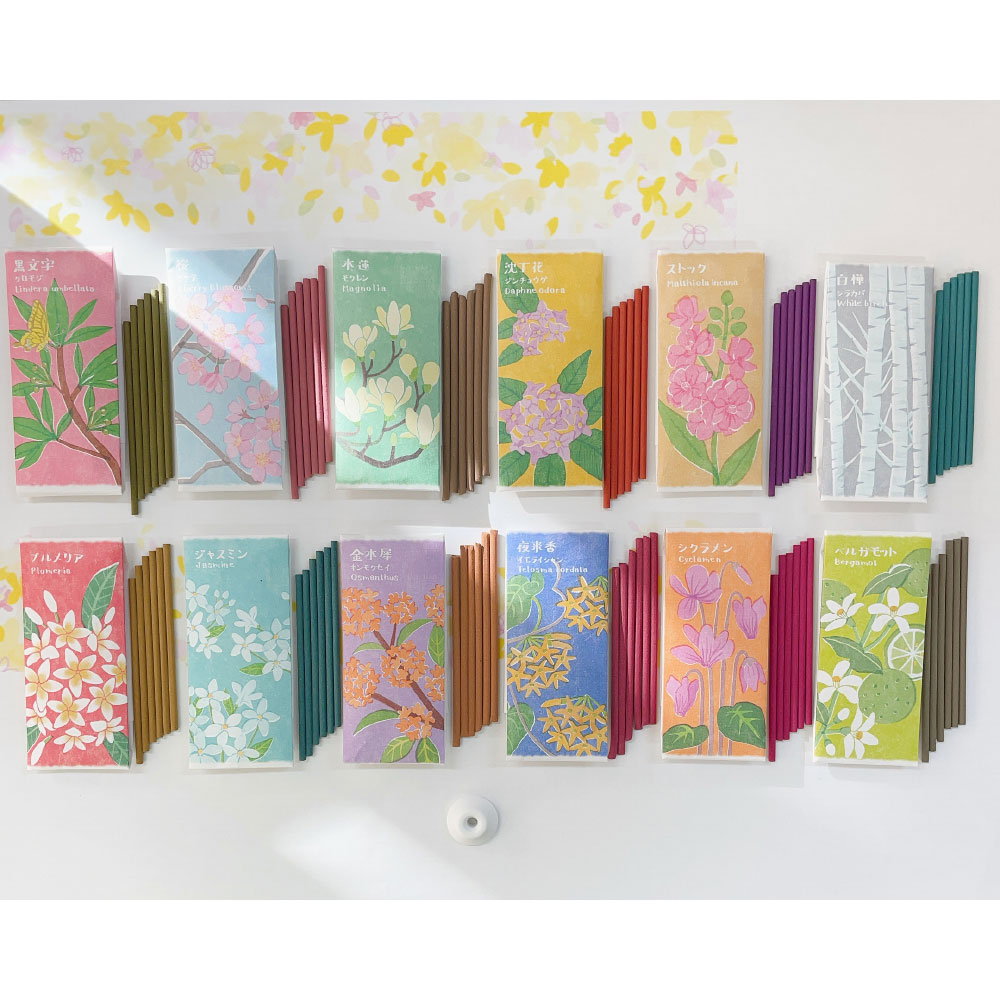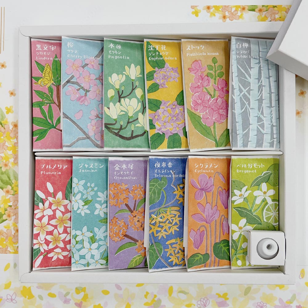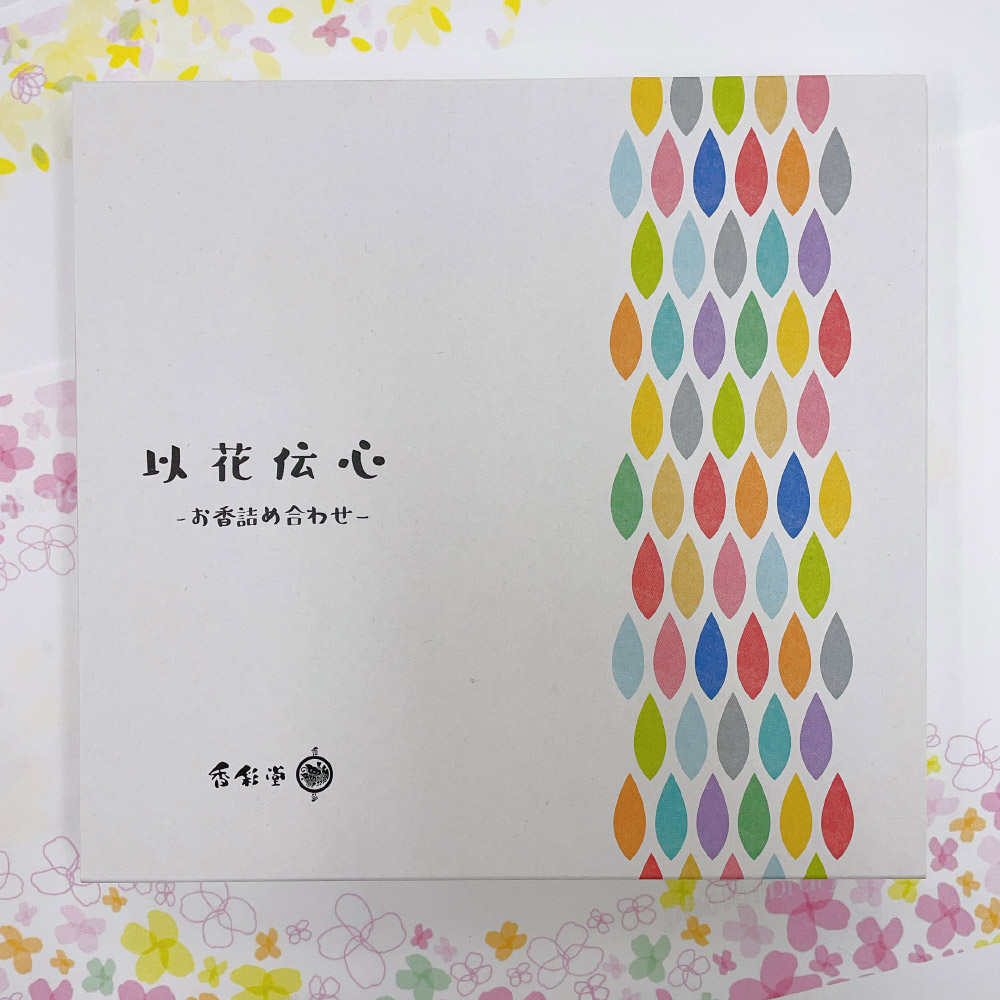 四季を美しく彩る花木に包まれた『以花伝心』詰め合わせ。その姿、香り、色彩、不変の美に、私たちは心を寄せてきました。“花で心を伝えたい”香りにこだわり作った『以花伝心』。移ろう四季と共に、12種類の心地よい香りがセットとなった詰め合わせです。気分や雰囲気でお好みの香りをお楽しみください。【12種類の香り】●黒文字(クロモジ)…凛として爽やかな、黒文字の香り●桜(サクラ)…華やかに舞う桜の香り●木蓮(モクレン)…気高く咲く木蓮の香り●沈丁花(ジンチョウゲ)…春の訪れを告げる、心休まる沈丁花の香り●ストック…パウダリーで甘く華やかな、ストックの香り●白樺(シラカバ)…森の香気に包まれるような、清々しい白樺の香り●プルメリア…南風が運ぶ、甘やかなプルメリアの香り●ジャスミン…夏の訪れを告げる、濃厚なジャスミンの香り●金木犀(キンモクセイ)…秋の始まりを告げる、金木犀の香り●夜来香(イエライシャン)…夜の帳りに拡がる、甘く懐かしい夜来香の香り●シクラメン…冬に咲く、気高いシクラメンの香り●ベルガモット…柑橘の爽やかさと華やかさを併せ持つベルガモットの香り〜『香彩堂』とは〜京都の烏丸通仏光寺に本店を構える「香」専門店の「香彩堂」。「香彩堂」では、伝統的な香りを継承し追及する一方で、京都らしく斬新な「和のお香」と、ハーブを使用して心身を癒すアロマテラピーの考え方に基づいた「洋のイノセンス」の両方を取り揃え、京の風趣を反映させた香り作りにこだわっています。「香」を通じて皆様の生活に豊かな彩りと心の豊かさをお届けします。