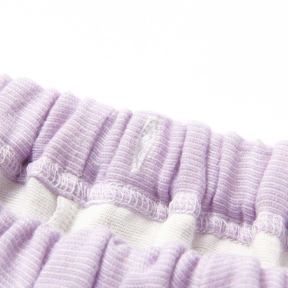 パジャマの衿元(首の後ろ部分)とパンツの左脇に、アクアチタン含浸テープを使用しています。 パープル