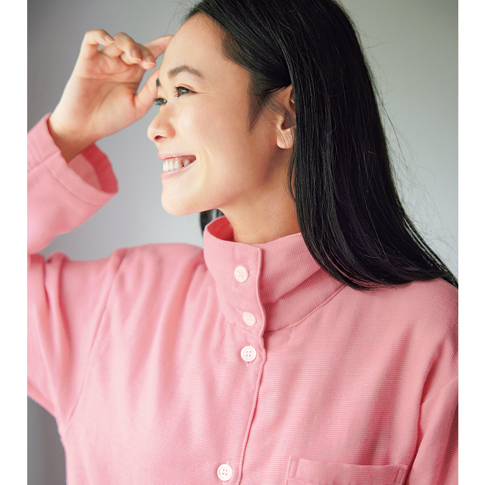 コーラルピンク 衿を立ててボタンを止めれば首元あったか