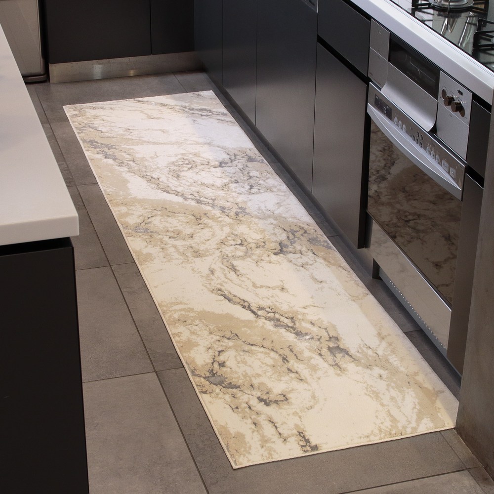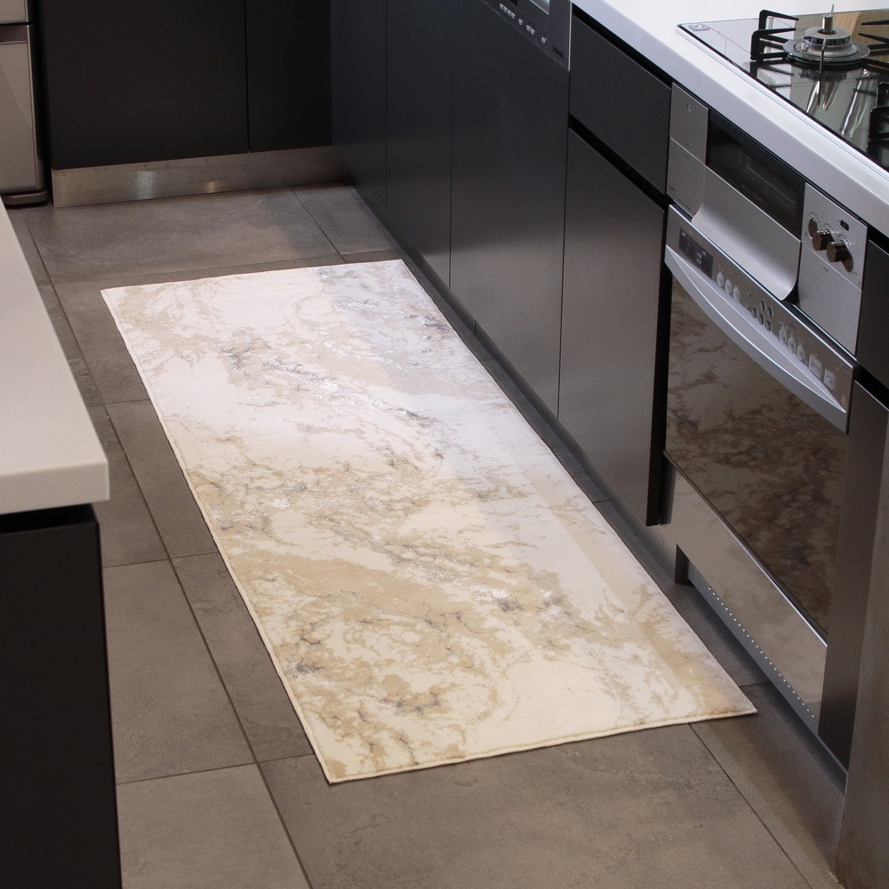 この一枚で自慢のくつろぎ空間に!光沢糸のきらめきとしっとりとした質感が魅せる大理石柄でラグジュアリーなフラットタイプのトルコ製ロングマット。落ち着いた大人の色合いで人気のベージュ系〈ベロニカ〉。インテリアをエレガントシックに。プレミアムなデザインと質感の「Grandex」シリーズ/フラットタイプ高級感あふれるしっとりとした肌ざわりと、高密度な毛足でしっかり感のある踏み心地のロングマット。自然をモチーフに、光沢糸を効果的に使用しモダンに仕上げた、毛足の短いフラットタイプ。落ち着いた色合いに浮かび上がるリュクスなきらめきは、幅広いインテリアに合わせやすいエレガントシックなデザインです。トルコ製の丈夫なウィルトン織りで、長く愛用できるのも魅力。幅約60cmで長さが3サイズからお選びいただけます。ラグジュアリー感あふれるデザインと質感は、1枚敷くだけで、ソファの足元やキッチンを贅沢な癒しの空間に。同柄のラグマットやフロアマットもご用意。トータルでコーディネートできる豊富なサイズバリエーションで、いつもの日常空間がたちまちグレードアップします!ギフトとしてもおすすめです。※商品・サイズによって柄の出方が異なります。※見る方向や照明により、柄や光沢糸の色の見え方に濃淡があります。【ポイント1】トルコ製高級マットシリーズ「Grandex(グランデックス)」「Grandex(グランデックス)」は、欧米ホテル御用達のベルギーマットメーカーVANDEWIELE(バンデビーレ)社製の織機を使用し織り上げた、しっとりと心地よい肌ざわりの高級マットシリーズです。トルコ製ならでの洗練されたデザインと上質なクオリティーで、ワンランク上のスペシャル感を。【ポイント2】きらめく素材を使用したデザイン性の高いフラットタイプ大理石柄は流れるようなマーブル模様の微妙な色の重なりを繊細な色使いと織りで表現。短めのカットパイルを使用したフラットタイプです。しっとりとした質感に映え、上品なツヤ感のあるシルバーの光沢糸の美しさは、敷くだけでリビングを華やかでリュクスなくつろぎ空間に。新春のしつらえや、大切なお客様をお迎えする、インテリアの装いにも相応しい“魅せマット”です。【ポイント3】密度の高い重厚感のあるウィルトン織り全厚約10ミリ、毛足約8ミリで、密度の高いボリューム感。VANDEWIELE社製の織機で仕上げたウィルトン織りです。しっとりとした心地よい足触りと、重厚感のあるカーペットのような贅沢な踏み心地を味わえます。■ウィルトン織りとは?18世紀より伝わる機械織りのカーペットを作る手法です。細やかな柄を精密に描き出すことができます。高密度に織り上げることで弾力性と耐久性に富み、丈夫で長持ちするのも特徴。【ポイント4】お家で手軽にお洗濯OK!汚れたら洗濯機で丸洗いできるので、清潔に使えます。※洗濯機でお洗濯する場合は必ずネットをご使用ください。※乾燥機・ドラム式洗濯機は使用できません。洗濯機に入らない場合は手洗いしてください。