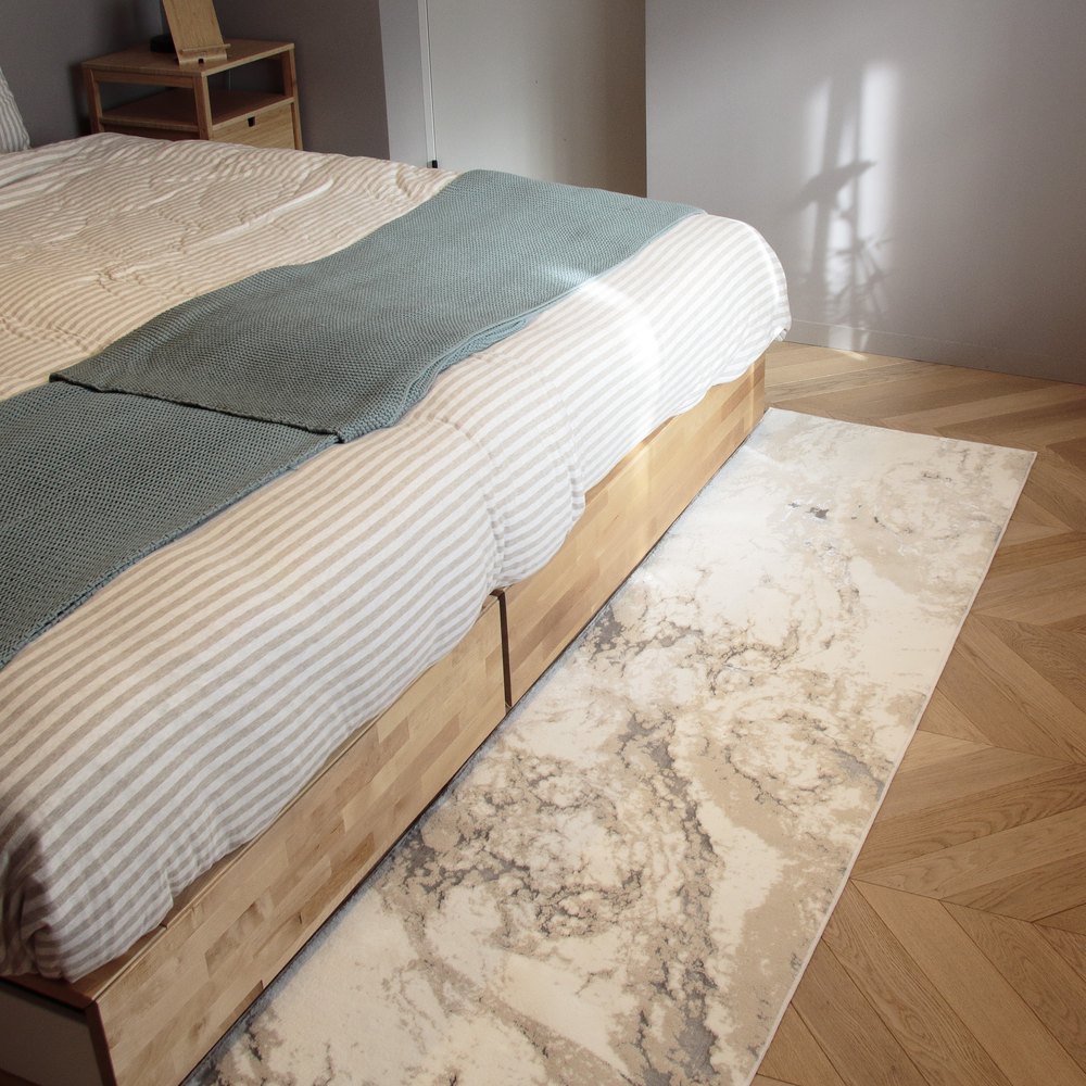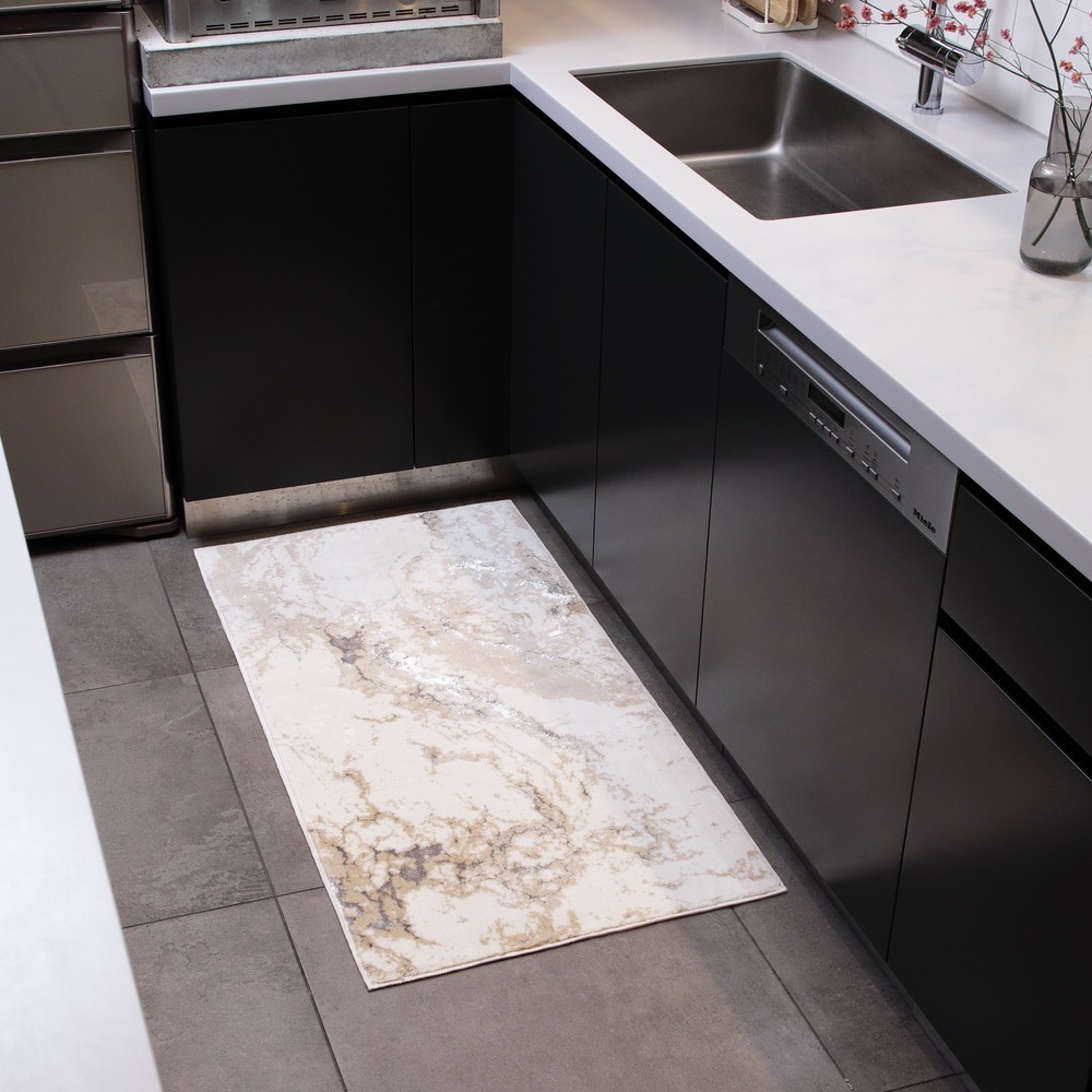 この一枚で自慢のくつろぎ空間に!光沢糸のきらめきとしっとりとした質感が魅せる大理石柄でラグジュアリーなフラットタイプのトルコ製ロングマット。落ち着いた大人の色合いで人気のベージュ系〈ベロニカ〉。インテリアをエレガントシックに。プレミアムなデザインと質感の「Grandex」シリーズ/フラットタイプ高級感あふれるしっとりとした肌ざわりと、高密度な毛足でしっかり感のある踏み心地のロングマット。自然をモチーフに、光沢糸を効果的に使用しモダンに仕上げた、毛足の短いフラットタイプ。落ち着いた色合いに浮かび上がるリュクスなきらめきは、幅広いインテリアに合わせやすいエレガントシックなデザインです。トルコ製の丈夫なウィルトン織りで、長く愛用できるのも魅力。幅約60cmで長さが3サイズからお選びいただけます。ラグジュアリー感あふれるデザインと質感は、1枚敷くだけで、ソファの足元やキッチンを贅沢な癒しの空間に。同柄のラグマットやフロアマットもご用意。トータルでコーディネートできる豊富なサイズバリエーションで、いつもの日常空間がたちまちグレードアップします!ギフトとしてもおすすめです。※商品・サイズによって柄の出方が異なります。※見る方向や照明により、柄や光沢糸の色の見え方に濃淡があります。【ポイント1】トルコ製高級マットシリーズ「Grandex(グランデックス)」「Grandex(グランデックス)」は、欧米ホテル御用達のベルギーマットメーカーVANDEWIELE(バンデビーレ)社製の織機を使用し織り上げた、しっとりと心地よい肌ざわりの高級マットシリーズです。トルコ製ならでの洗練されたデザインと上質なクオリティーで、ワンランク上のスペシャル感を。【ポイント2】きらめく素材を使用したデザイン性の高いフラットタイプ大理石柄は流れるようなマーブル模様の微妙な色の重なりを繊細な色使いと織りで表現。短めのカットパイルを使用したフラットタイプです。しっとりとした質感に映え、上品なツヤ感のあるシルバーの光沢糸の美しさは、敷くだけでリビングを華やかでリュクスなくつろぎ空間に。新春のしつらえや、大切なお客様をお迎えする、インテリアの装いにも相応しい“魅せマット”です。【ポイント3】密度の高い重厚感のあるウィルトン織り全厚約10ミリ、毛足約8ミリで、密度の高いボリューム感。VANDEWIELE社製の織機で仕上げたウィルトン織りです。しっとりとした心地よい足触りと、重厚感のあるカーペットのような贅沢な踏み心地を味わえます。■ウィルトン織りとは?18世紀より伝わる機械織りのカーペットを作る手法です。細やかな柄を精密に描き出すことができます。高密度に織り上げることで弾力性と耐久性に富み、丈夫で長持ちするのも特徴。【ポイント4】お家で手軽にお洗濯OK!汚れたら洗濯機で丸洗いできるので、清潔に使えます。※洗濯機でお洗濯する場合は必ずネットをご使用ください。※乾燥機・ドラム式洗濯機は使用できません。洗濯機に入らない場合は手洗いしてください。