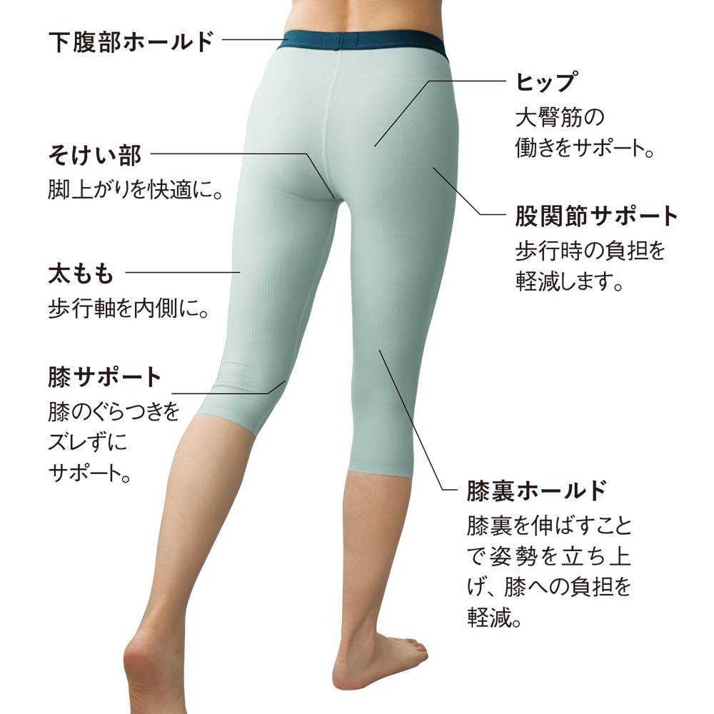 股関節から膝まで1枚でサポート整形外科医監修監修の素肌感覚のスパッツで歩行をラクに薄地でラクなのに、これ1枚でしっかりサポート。腰やひざの負担を軽くし、軽やかな歩行に。通気性がよく、アウターにひびきにくいのも◎【ポイント】1)薄いのにしっかりサポート独自のパワープリントラインが体の部位に応じた強さでサポート。動作字の負担を軽減します。2)軽くて、動きにフィット心地よく伸びて吸い付くようにフィットするから、動きがラク3)着脱しやすい
