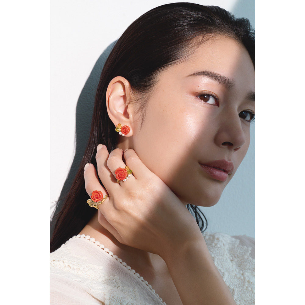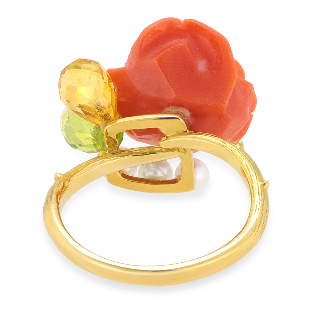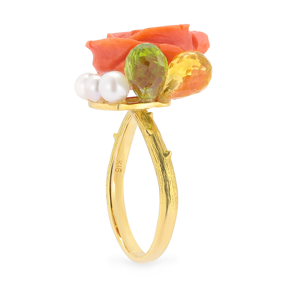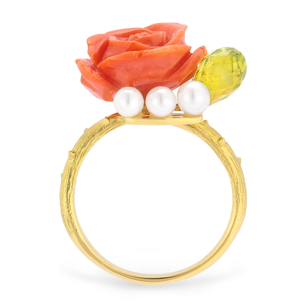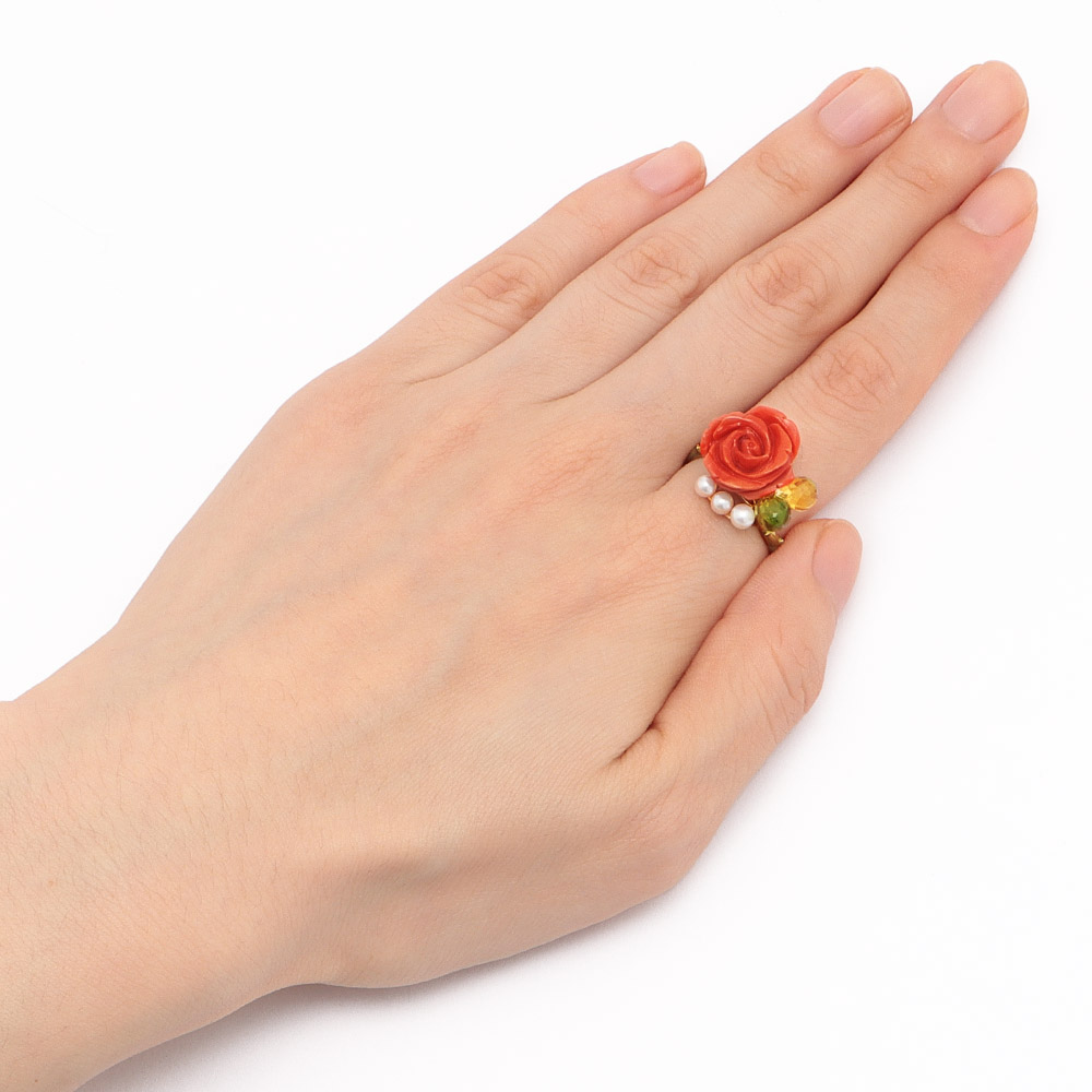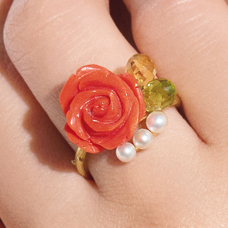 精緻な細工が織りなす構築美 イタリアン・ジュエリーカトリック教徒の一大行事、聖年(2025ジュビリー)を前に、世界の注目を集めるイタリアに思いを馳せて…。歴史と共に進化し続けるジュエリーの世界をご紹介します。薔薇モチーフの珊瑚で内なるかわいらしさを肌に映してオレンジがかった朱色が特長の地中海珊瑚のジュエリーは、イタリアの精緻な彫りの伝統を受け継ぐもの。珊瑚の薔薇を色石でカラフルに彩ったシリーズをご紹介。珊瑚にシトリンやペリドット、ベビーパールを添えた愛らしくも華やかなリングです。