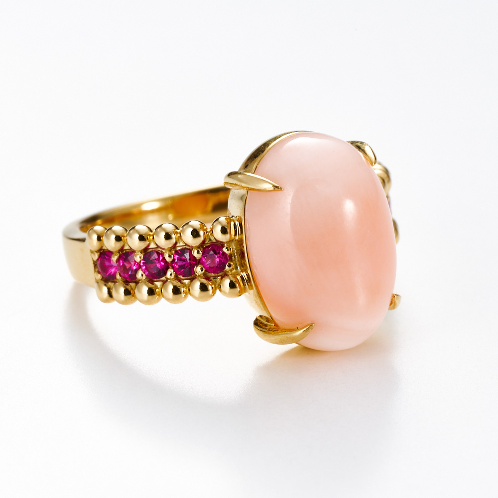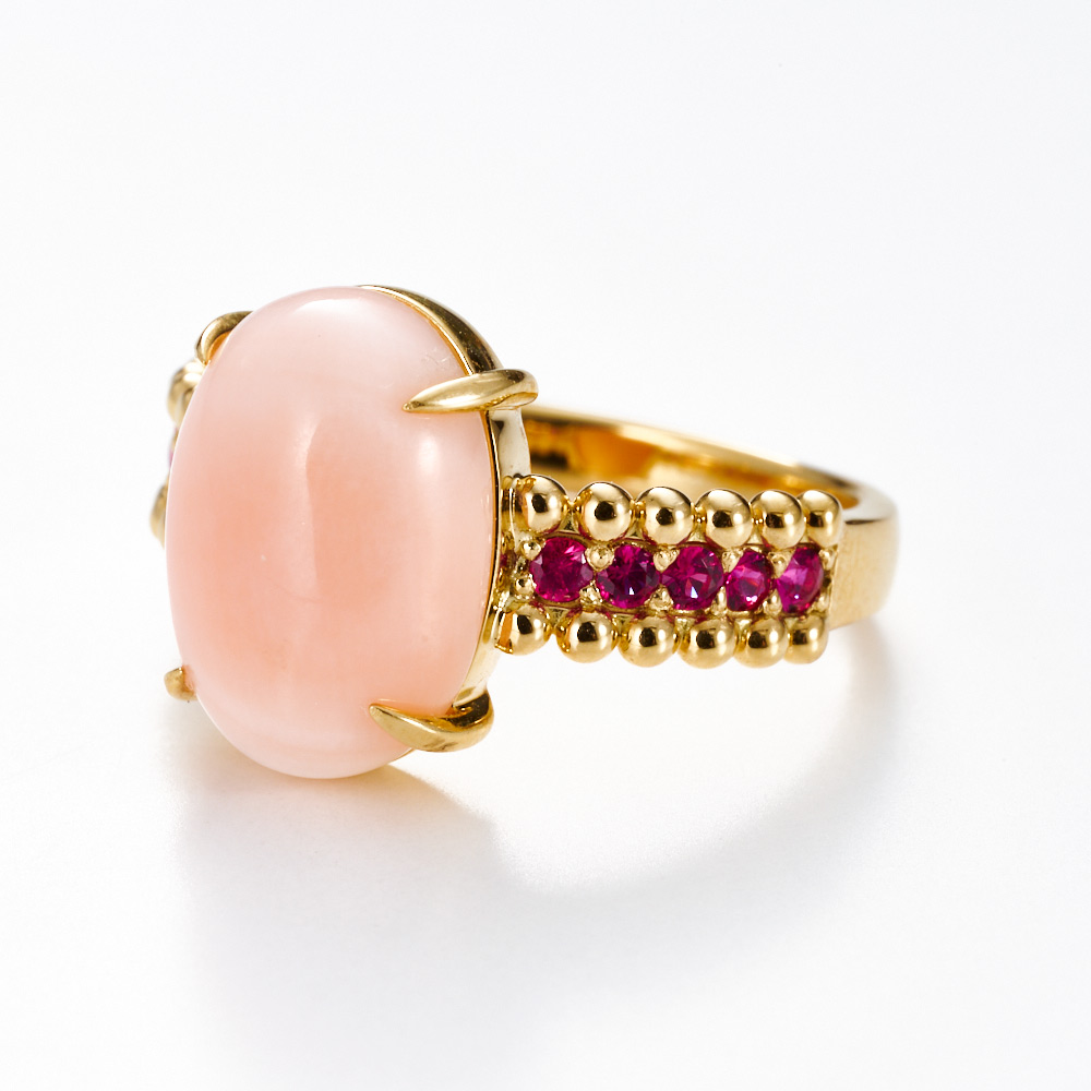 ピンク珊瑚のオーバルカボションカットの個性派リング。つるんと艶やかなカボションカットのピンク珊瑚にルビーを組み合わせ、パワーの出る赤系カラーでまとめました!ゴールドの丸珠を上下に繋ぎ、ぽこぽことしたフォルムがユニークかつ愛らしいデザイン。間のメレストーンをダイヤモンドではなくルビーにすることで、さらにユニークで印象的な1本に仕上げています。