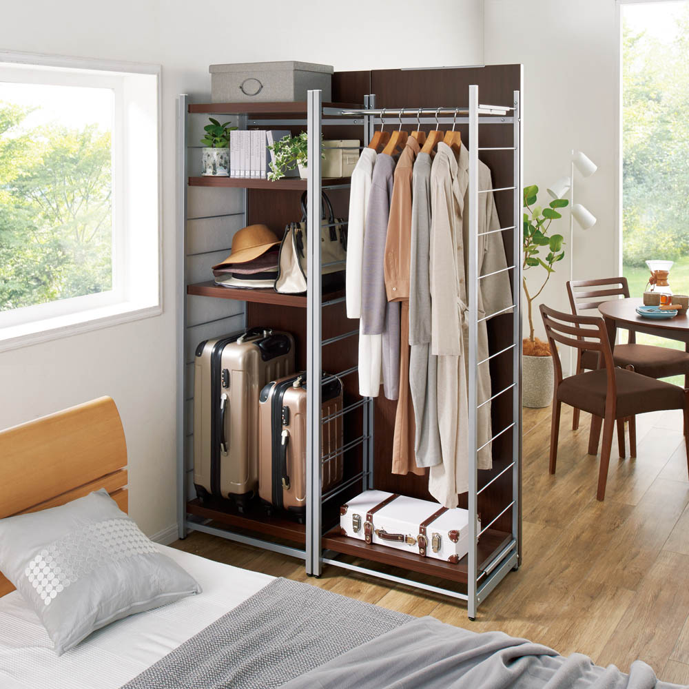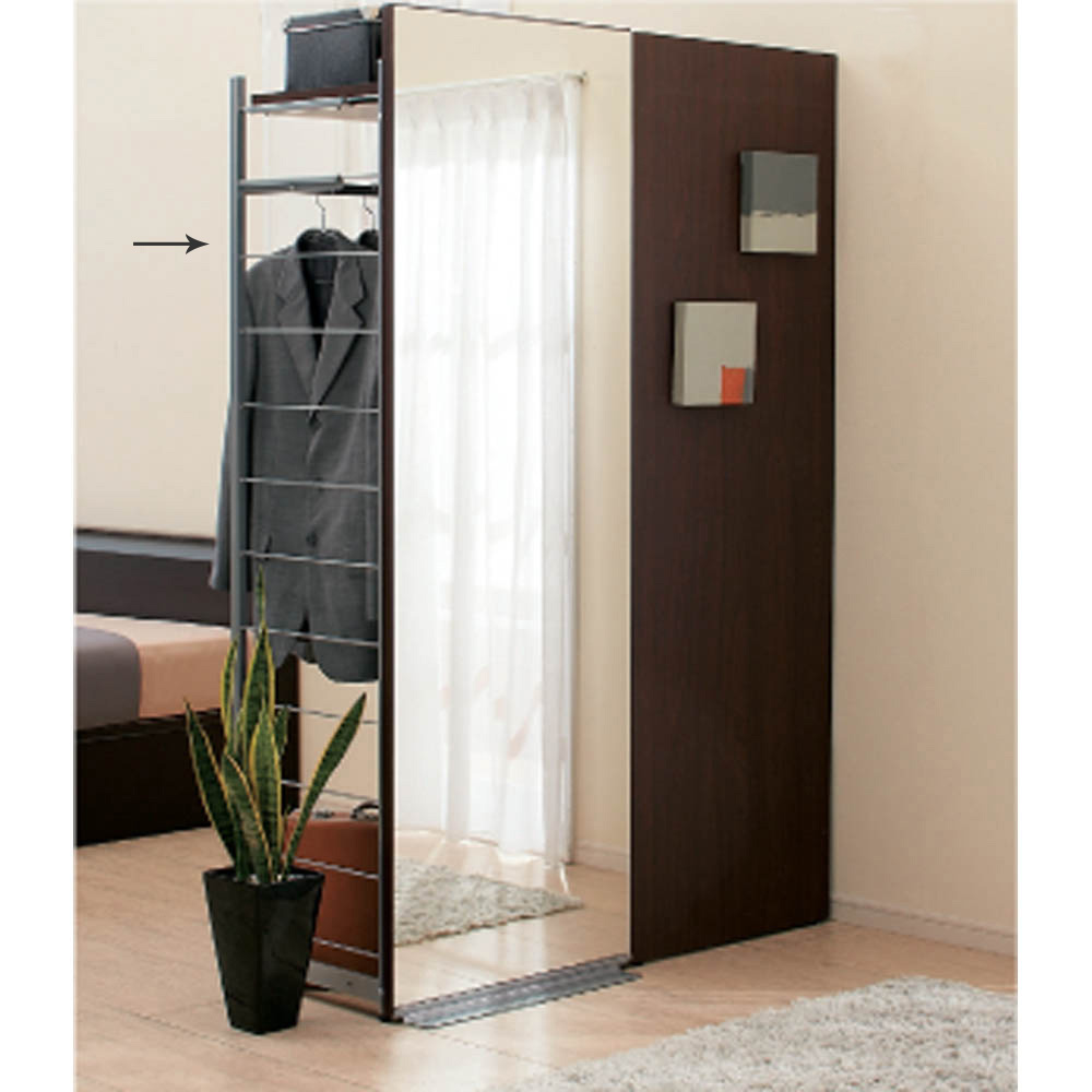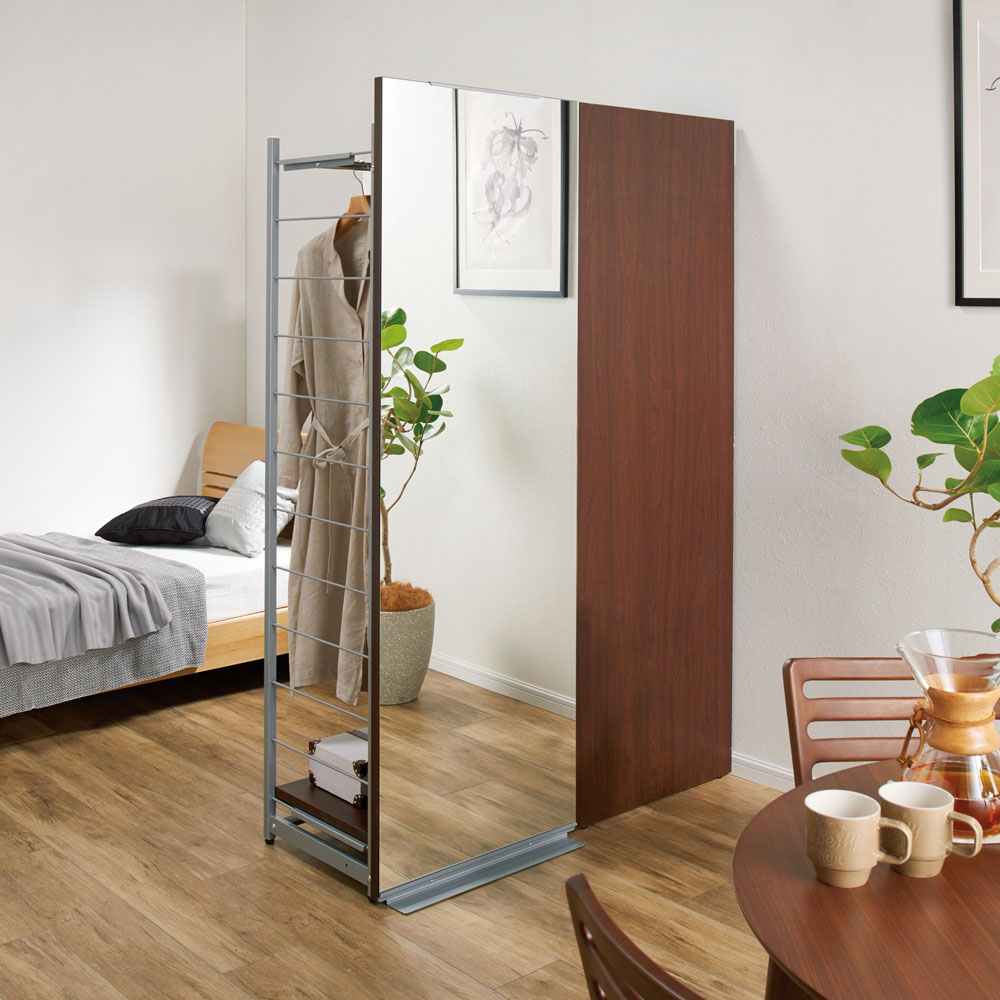 ミラー壁面でお部屋の空間を簡単に仕切ることができるオシャレなハンガーラックです。ミラーの裏面はハンガーラックや収納棚になっています。ミラーは姿見としても使え、さらにお部屋を広く見せる効果もあります。お好みの収納タイプを選んで、空間を仕切りながら自分だけのワードローブが作れます。収納面とパネル面で手軽に間仕切りができる一台二役の間仕切りハンガーラックシリーズ。空間を間仕切りながら、大容量収納まで叶えてくれる間仕切り収納。寝室やリビングルームに置いても使いやすく、様になるクローゼットハンガーです。ダイニングとリビング、ベッドとデスクスペース等目的に応じて収納を増やしながらお部屋を仕切ることが可能です。【Check Point 1】清潔感のあるホワイト、北欧風テイストのブラウン、落ち着いたダークブラウンの3色をご用意。●清潔感あふれるホワイト色は大きな家具でも圧迫感が少なく、お部屋を広く演出してくれます●北欧風テイストのブラウンは、どんなインテリアにも合わせやすいデザインです。●落ち着いた印象のダークブラウン色の縦木目柄は高級感のある佇まい。●建具に合わせてリビングルームでも、寝室、ウォークインクローゼットでも置き場所を選びません。【Check Point 2】収納物や使い勝手に応じて、サイズと収納タイプをお選びいただけます。●商品の幅は60cmと120cmの2サイズをご用意致しました。●収納タイプはハンガー1段・棚1枚タイプと棚4枚の2タイプ。●使う場所や収納物、収納量に応じてお好みで組み合わせることも可能です。【Check Point3】間仕切り面は板タイプとミラータイプ。●空間を手軽に間仕切りたい方には、シンプルな板タイプがおすすめ。●ミラータイプは空間を広く見せる効果もあるので、コンパクトなお部屋でも安心。●用途に応じて板タイプとミラータイプを組み合わせても活用できます。
