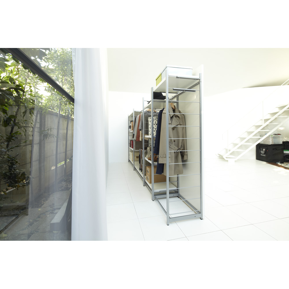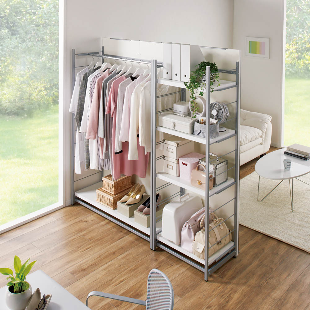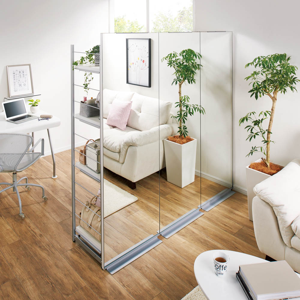 ミラー壁面でお部屋の空間を簡単に仕切ることができるオシャレなハンガーラックです。ミラーの裏面はハンガーラックや収納棚になっています。ミラーは姿見としても使え、さらにお部屋を広く見せる効果もあります。お好みの収納タイプを選んで、空間を仕切りながら自分だけのワードローブが作れます。収納面とパネル面で手軽に間仕切りができる一台二役の間仕切りハンガーラックシリーズ。空間を間仕切りながら、大容量収納まで叶えてくれる間仕切り収納。寝室やリビングルームに置いても使いやすく、様になるクローゼットハンガーです。ダイニングとリビング、ベッドとデスクスペース等目的に応じて収納を増やしながらお部屋を仕切ることが可能です。【Check Point 1】清潔感のあるホワイト、北欧風テイストのブラウン、落ち着いたダークブラウンの3色をご用意。●清潔感あふれるホワイト色は大きな家具でも圧迫感が少なく、お部屋を広く演出してくれます●北欧風テイストのブラウンは、どんなインテリアにも合わせやすいデザインです。●落ち着いた印象のダークブラウン色の縦木目柄は高級感のある佇まい。●建具に合わせてリビングルームでも、寝室、ウォークインクローゼットでも置き場所を選びません。【Check Point 2】収納物や使い勝手に応じて、サイズと収納タイプをお選びいただけます。●商品の幅は60cmと120cmの2サイズをご用意致しました。●収納タイプはハンガー1段・棚1枚タイプと棚4枚の2タイプ。●使う場所や収納物、収納量に応じてお好みで組み合わせることも可能です。【Check Point3】間仕切り面は板タイプとミラータイプ。●空間を手軽に間仕切りたい方には、シンプルな板タイプがおすすめ。●ミラータイプは空間を広く見せる効果もあるので、コンパクトなお部屋でも安心。●用途に応じて板タイプとミラータイプを組み合わせても活用できます。