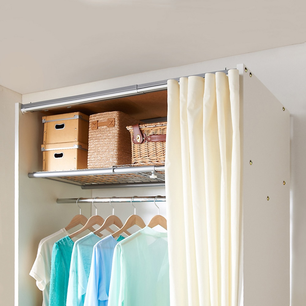 カーテンを閉じればお部屋がすっきりします。(※写真は棚なし・幅128〜205cmタイプ、付属の無地カーテンを使用した場合です)