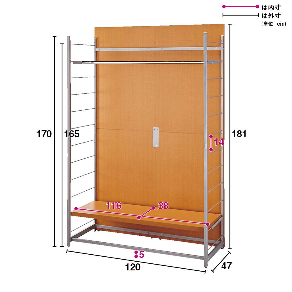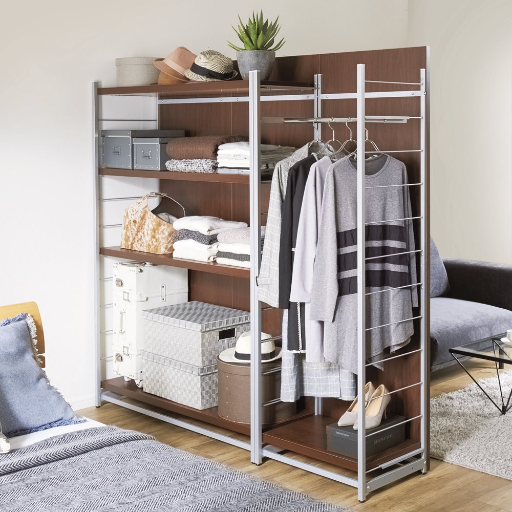 本商品は「お手軽間仕切り パネル収納ハンガーラック 板タイプ ハンガー1段棚1枚 幅120cm」です。置くだけで手軽に空間を間仕切ることができるオシャレなハンガーラックシリーズ。圧迫感のないオープンタイプなので、コンパクトな空間にもおすすめ。衣類や雑貨を収納しながら、限られた空間を機能的に活用できます。間仕切りしながら収納できる、一台二役のハンガーラック空間を間仕切りしながら、大容量収納まで叶えてくれる間仕切り収納。寝室やリビングルームに置いても使いやすく、様になるクローゼットハンガーです。コーディネート例(幅60cm・ハンガー1段棚1枚タイプ、幅120cm・棚4枚タイプ)空間を機能的に活用できるベッドとリビング等1つの部屋でも間仕切りすることで、収納を増やしながら自由に空間の使い分けができます。収納面はオープンタイプなので、限られたスペースのお部屋に置いても圧迫感がありません。コーディネート例(幅120cm・ハンガー1段棚1枚タイプ、幅60cm・棚4枚タイプ)用途に合わせた収納スペースにハンガー1段棚1枚タイプは棚板1枚とハンガーバー1段がついています。棚に本やバッグなどを置いたり、ハンガーバーは高さを変えるとワンピースやロングコートもかけたりできます。簡単に高さ調整ができる可動棚とハンガーバーサイドのフレームに引っかけるだけなので、収納物や使い勝手に応じた調整も簡単です。棚とバーの高さは14cm間隔・12段階の調整が可能です。コーディネート例(幅60cm・棚1枚ハンガーバー1本タイプ、幅120cm・棚4枚タイプ)高さのあるパネルでしっかり目隠しパネルの高さは181cm。見られたくないスペースの目隠しや、プライベートな空間作りにも適しています。安心のアジャスター付きアジャスター付きでぐらつきを防ぎます。コーディネート例どんなお部屋にも合わせやすい、おしゃれな3カラーホワイトは清潔感があり圧迫感が少なく、お部屋を広く演出してくれます。ブラウンはどんなインテリアにも合わせやすい北欧テイストのデザインです。ダークブラウンは縦木目柄で、落ち着いた印象と高級感のある佇まいがあります。