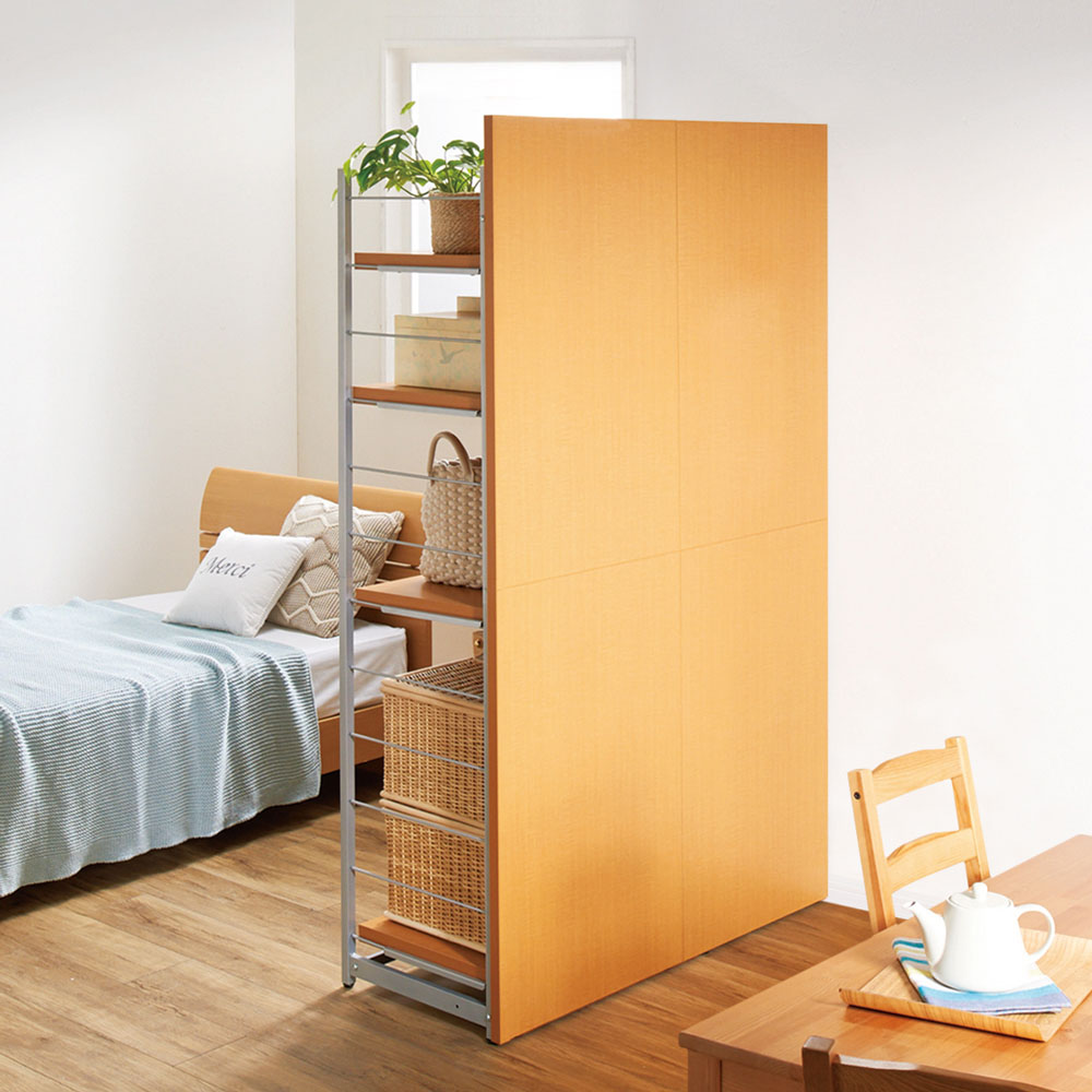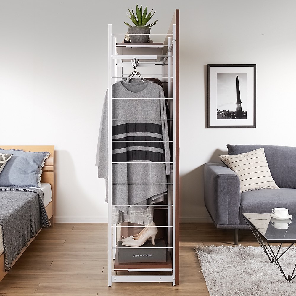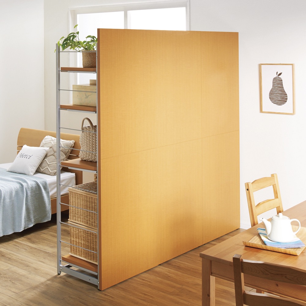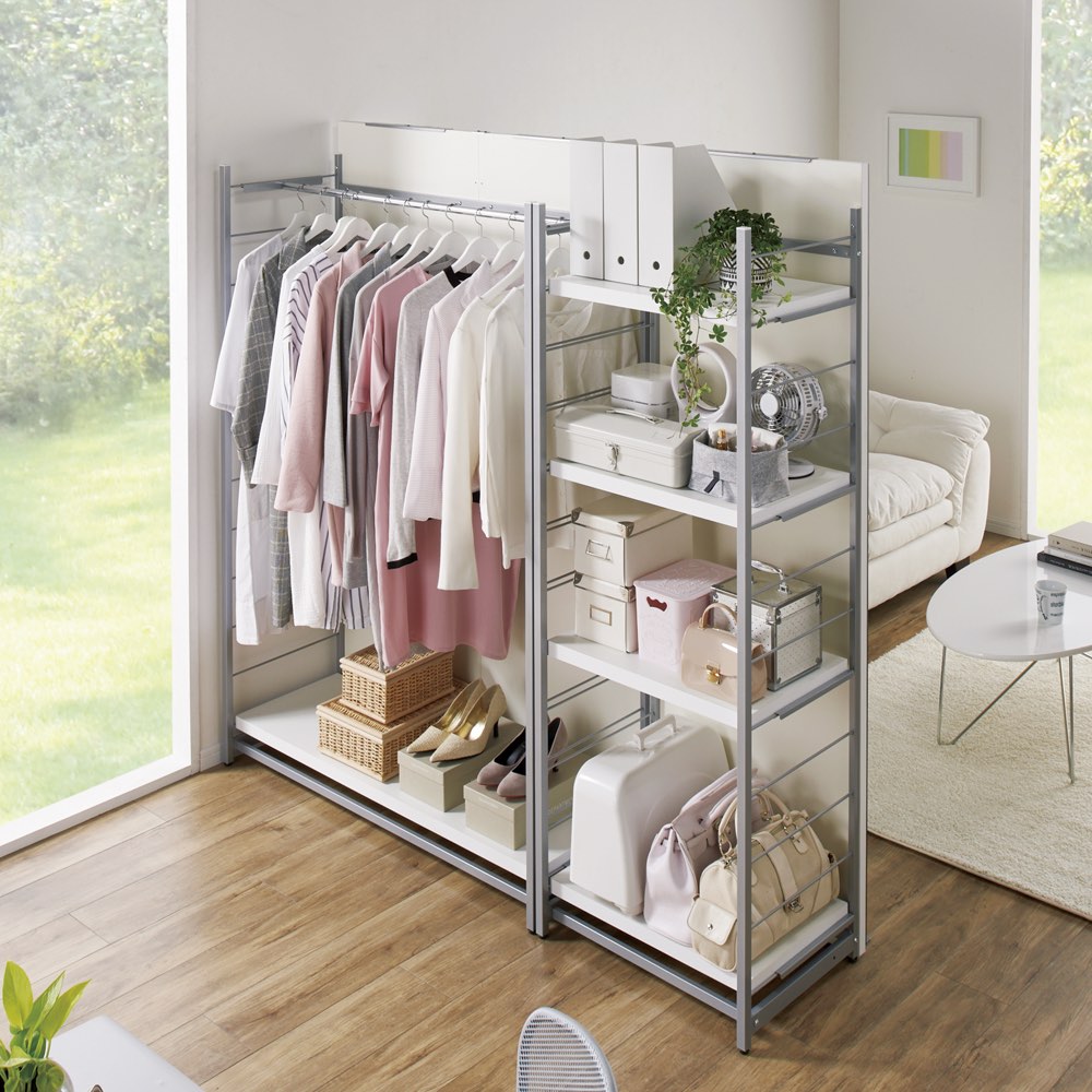本商品は「お手軽間仕切り パネル収納ハンガーラック 板タイプ 棚4枚 幅120cm」です。置くだけで手軽に空間を間仕切ることができるオシャレなハンガーラックシリーズ。圧迫感のないオープンタイプなので、コンパクトな空間にもおすすめ。衣類や雑貨を収納しながら、限られた空間を機能的に活用できます。間仕切りしながら収納できる、一台二役のハンガーラック空間を間仕切りしながら、大容量収納まで叶えてくれる間仕切り収納。寝室やリビングルームに置いても使いやすく、様になるクローゼットハンガーです。コーディネート例(幅60cm・ハンガー1段棚1枚タイプ、幅120cm・棚4枚タイプ)空間を機能的に活用できるベッドとリビング等1つの部屋でも間仕切りすることで、収納を増やしながら自由に空間の使い分けができます。収納面はオープンタイプなので、限られたスペースのお部屋に置いても圧迫感がありません。コーディネート例(幅120cm・棚4枚タイプ、幅60cm・ハンガー1段棚1枚タイプ)用途に合わせた収納スペースに棚4枚タイプは棚板が4枚ついています。本やバッグなどを置くことができます。簡単に高さ調整ができる可動棚サイドのフレームに引っかけるだけなので、収納物や使い勝手に応じた調整も簡単です。棚の高さは14cm間隔・12段階の調整が可能です。コーディネート例(幅60cm・棚1枚ハンガーバー1本タイプ、幅120cm・棚4枚タイプ)高さのあるパネルでしっかり目隠しパネルの高さは181cm。見られたくないスペースの目隠しや、プライベートな空間作りにも適しています。安心のアジャスター付きアジャスター付きでぐらつきを防ぎます。コーディネート例どんなお部屋にも合わせやすい、おしゃれな3カラーホワイトは清潔感があり圧迫感が少なく、お部屋を広く演出してくれます。ブラウンはどんなインテリアにも合わせやすい北欧テイストのデザインです。ダークブラウンは縦木目柄で、落ち着いた印象と高級感のある佇まいがあります。