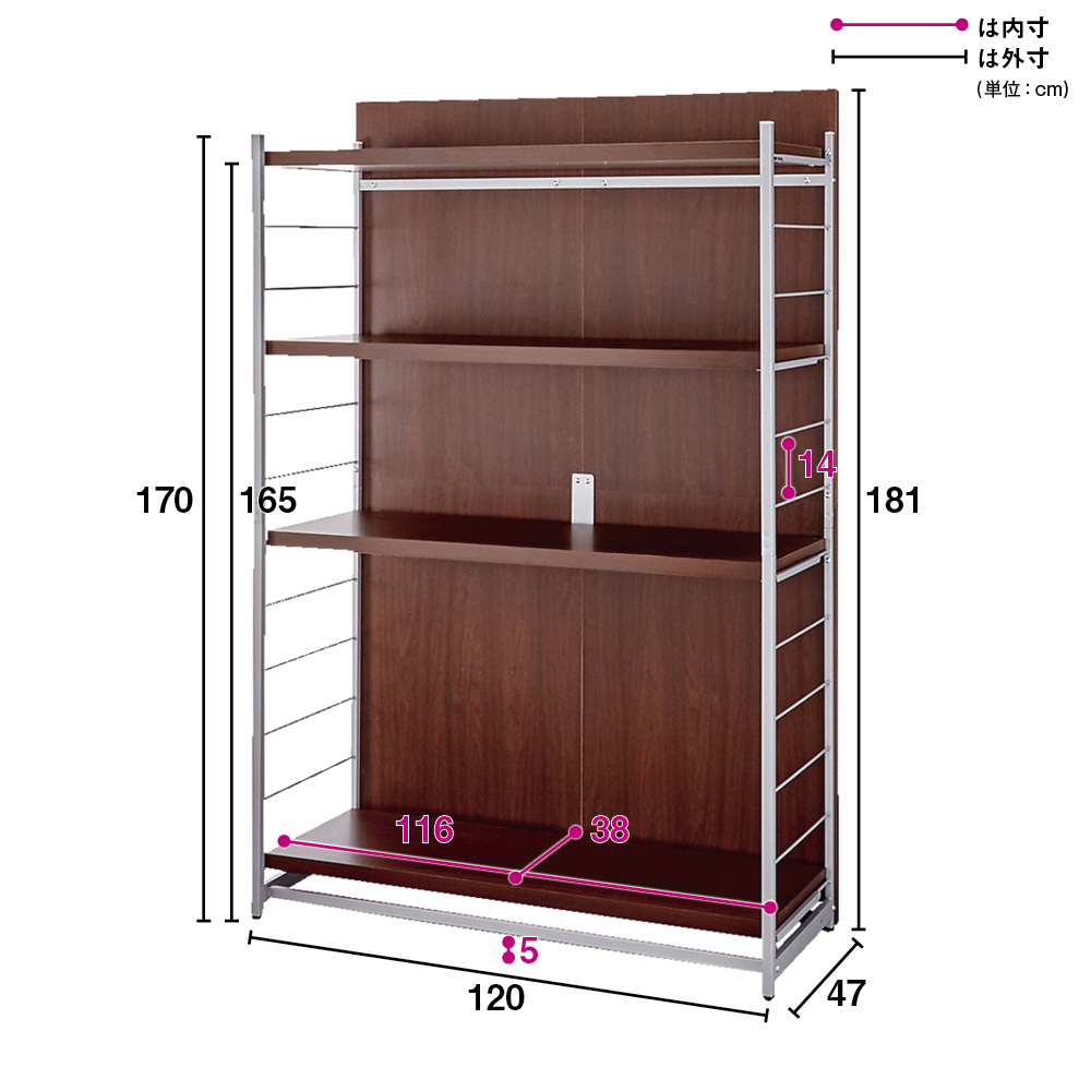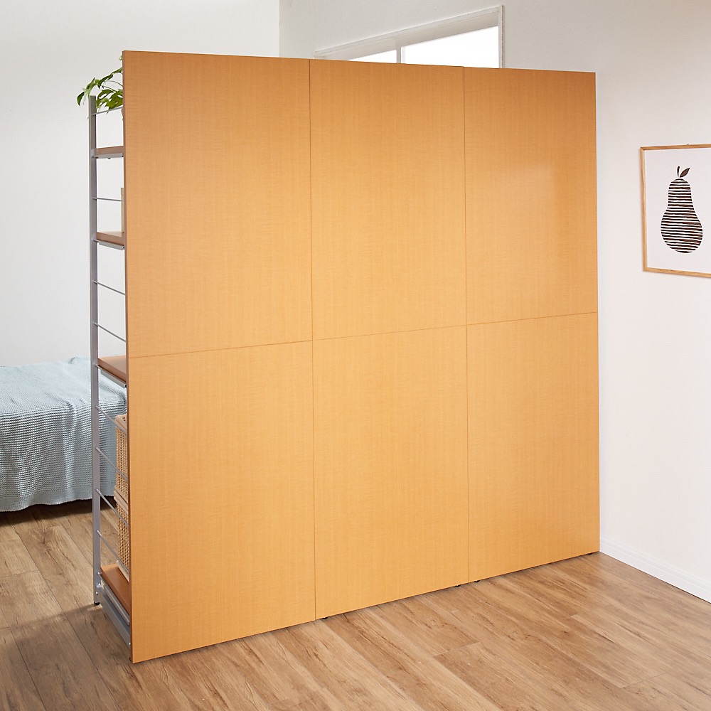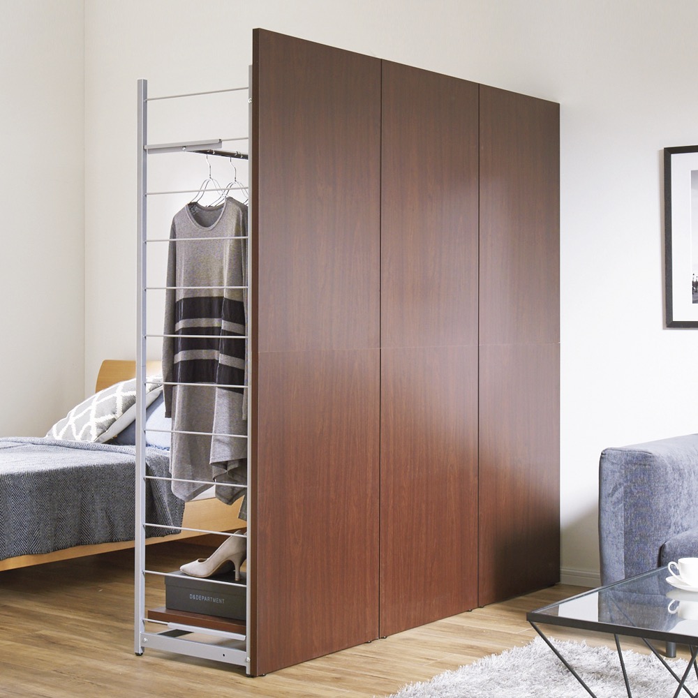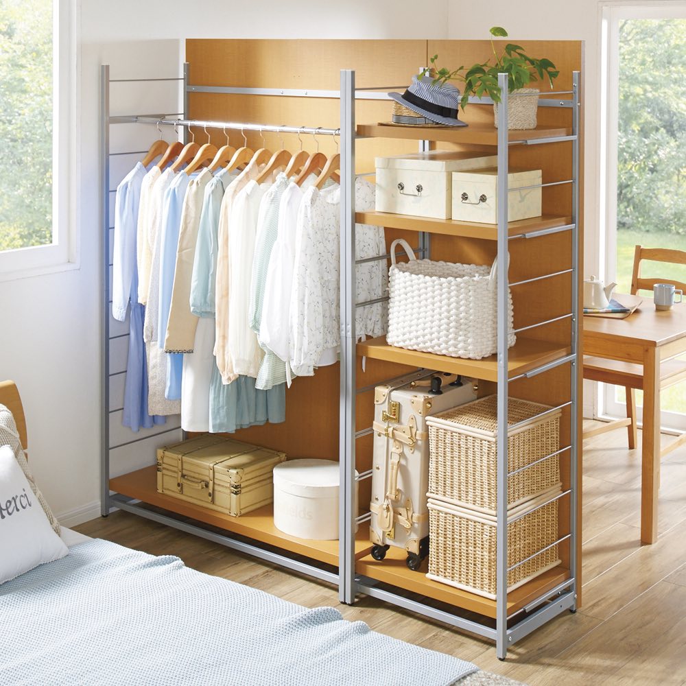 本商品は「お手軽間仕切り パネル収納ハンガーラック 板タイプ 棚4枚 幅120cm」です。置くだけで手軽に空間を間仕切ることができるオシャレなハンガーラックシリーズ。圧迫感のないオープンタイプなので、コンパクトな空間にもおすすめ。衣類や雑貨を収納しながら、限られた空間を機能的に活用できます。間仕切りしながら収納できる、一台二役のハンガーラック空間を間仕切りしながら、大容量収納まで叶えてくれる間仕切り収納。寝室やリビングルームに置いても使いやすく、様になるクローゼットハンガーです。コーディネート例(幅60cm・ハンガー1段棚1枚タイプ、幅120cm・棚4枚タイプ)空間を機能的に活用できるベッドとリビング等1つの部屋でも間仕切りすることで、収納を増やしながら自由に空間の使い分けができます。収納面はオープンタイプなので、限られたスペースのお部屋に置いても圧迫感がありません。コーディネート例(幅120cm・棚4枚タイプ、幅60cm・ハンガー1段棚1枚タイプ)用途に合わせた収納スペースに棚4枚タイプは棚板が4枚ついています。本やバッグなどを置くことができます。簡単に高さ調整ができる可動棚サイドのフレームに引っかけるだけなので、収納物や使い勝手に応じた調整も簡単です。棚の高さは14cm間隔・12段階の調整が可能です。コーディネート例(幅60cm・棚1枚ハンガーバー1本タイプ、幅120cm・棚4枚タイプ)高さのあるパネルでしっかり目隠しパネルの高さは181cm。見られたくないスペースの目隠しや、プライベートな空間作りにも適しています。安心のアジャスター付きアジャスター付きでぐらつきを防ぎます。コーディネート例どんなお部屋にも合わせやすい、おしゃれな3カラーホワイトは清潔感があり圧迫感が少なく、お部屋を広く演出してくれます。ブラウンはどんなインテリアにも合わせやすい北欧テイストのデザインです。ダークブラウンは縦木目柄で、落ち着いた印象と高級感のある佇まいがあります。